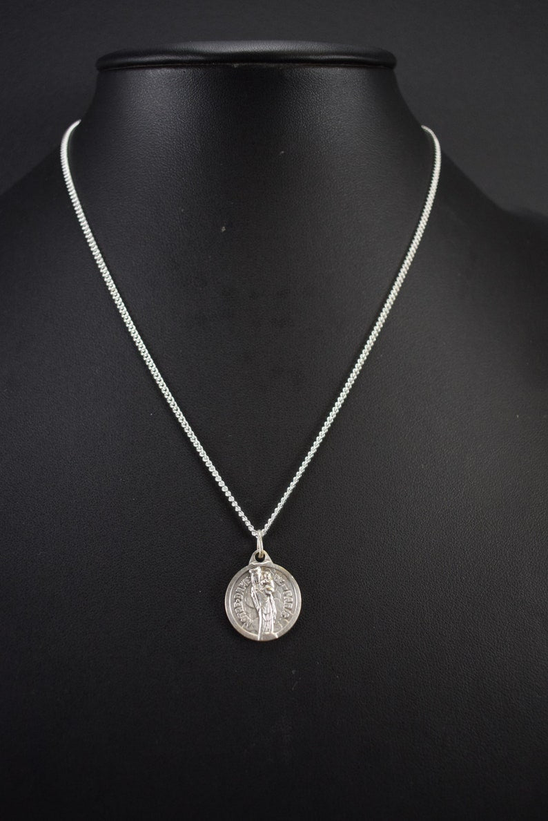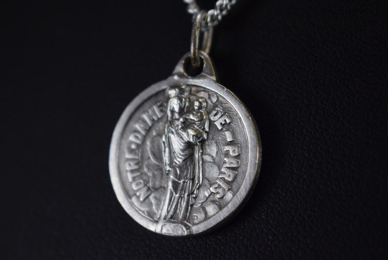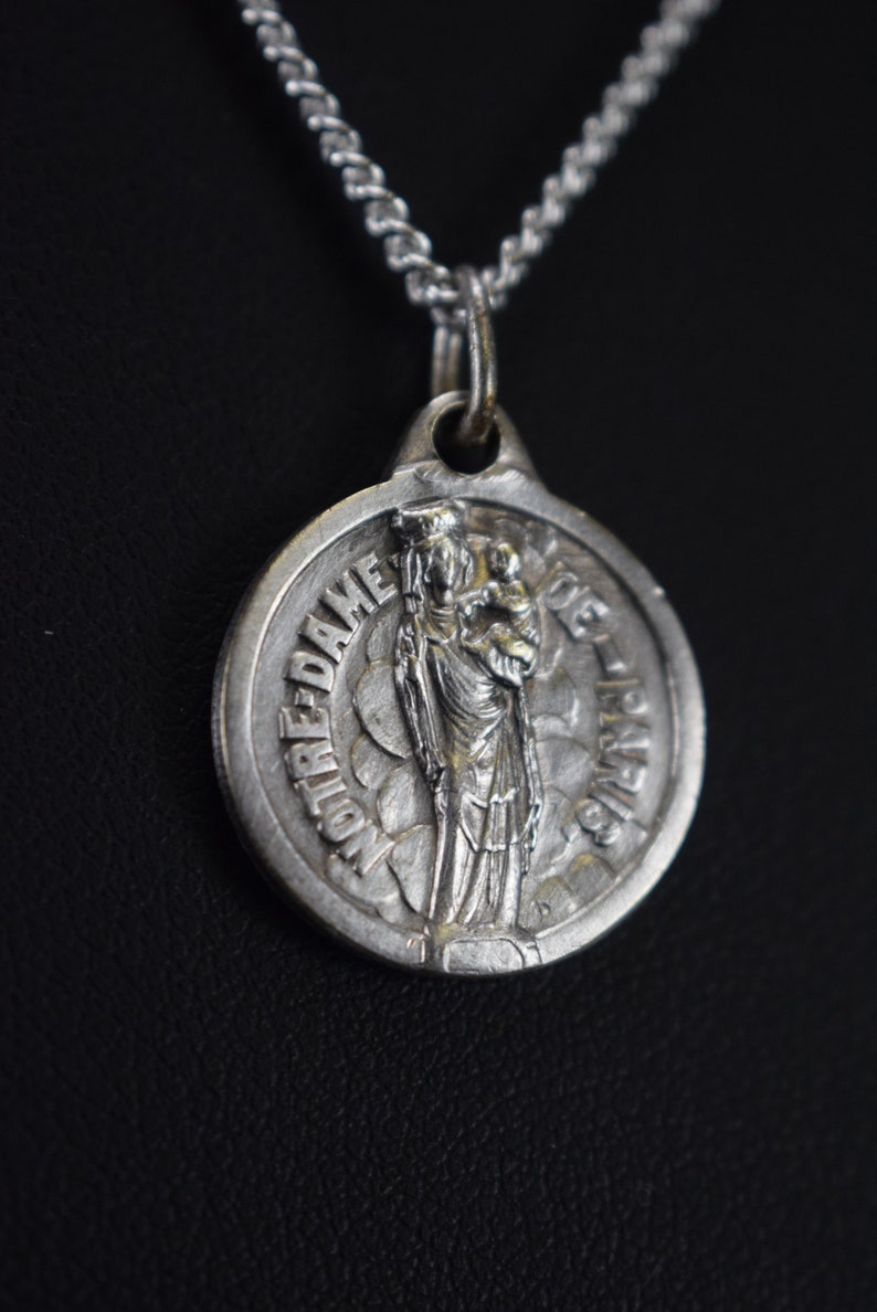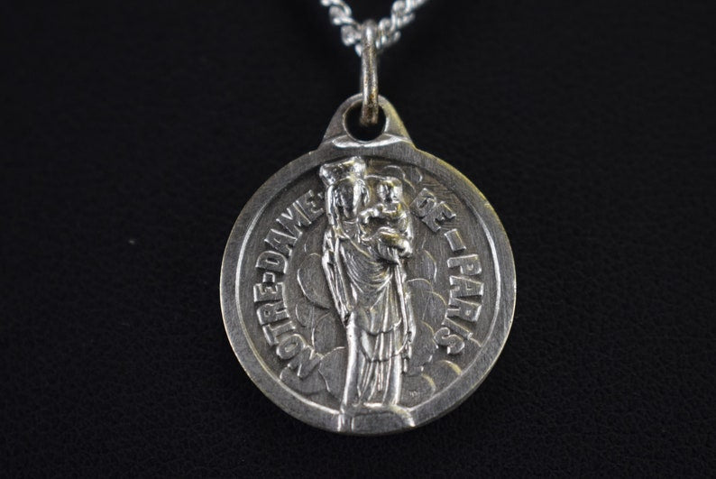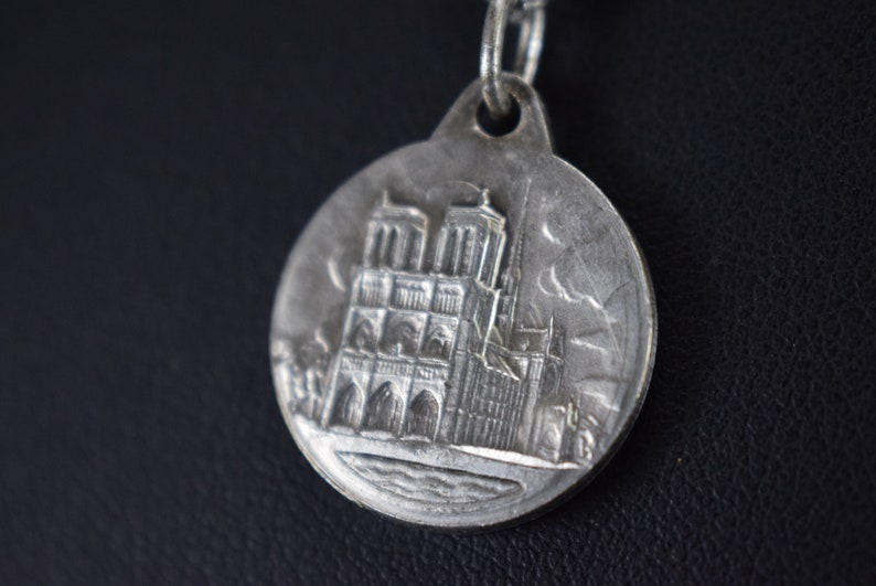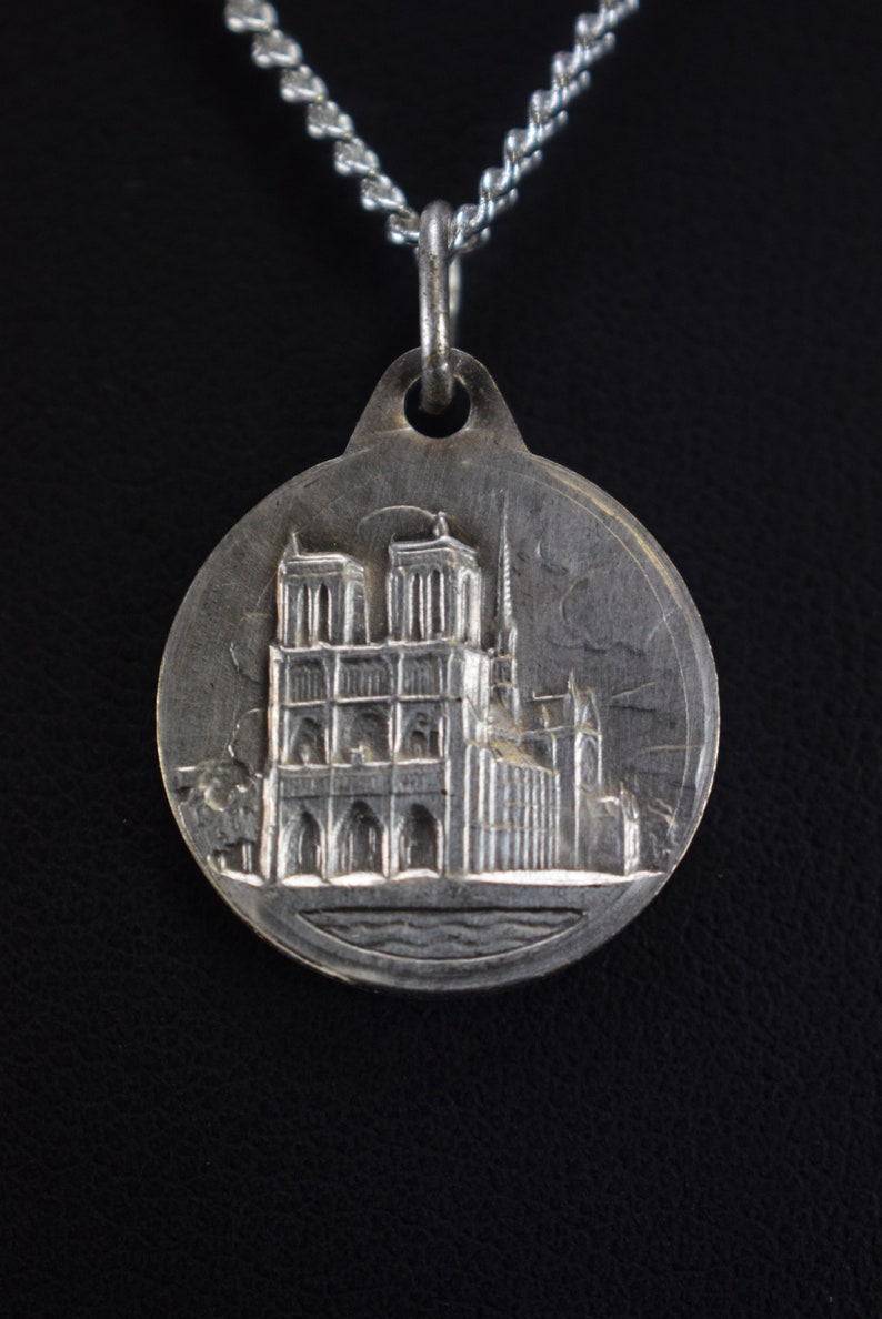 Une médaille religieuse vintage Français en métal argenté. Le magnifique pendentif représente finement Notre-Dame de Paris et la cathédrale de Paris au revers.