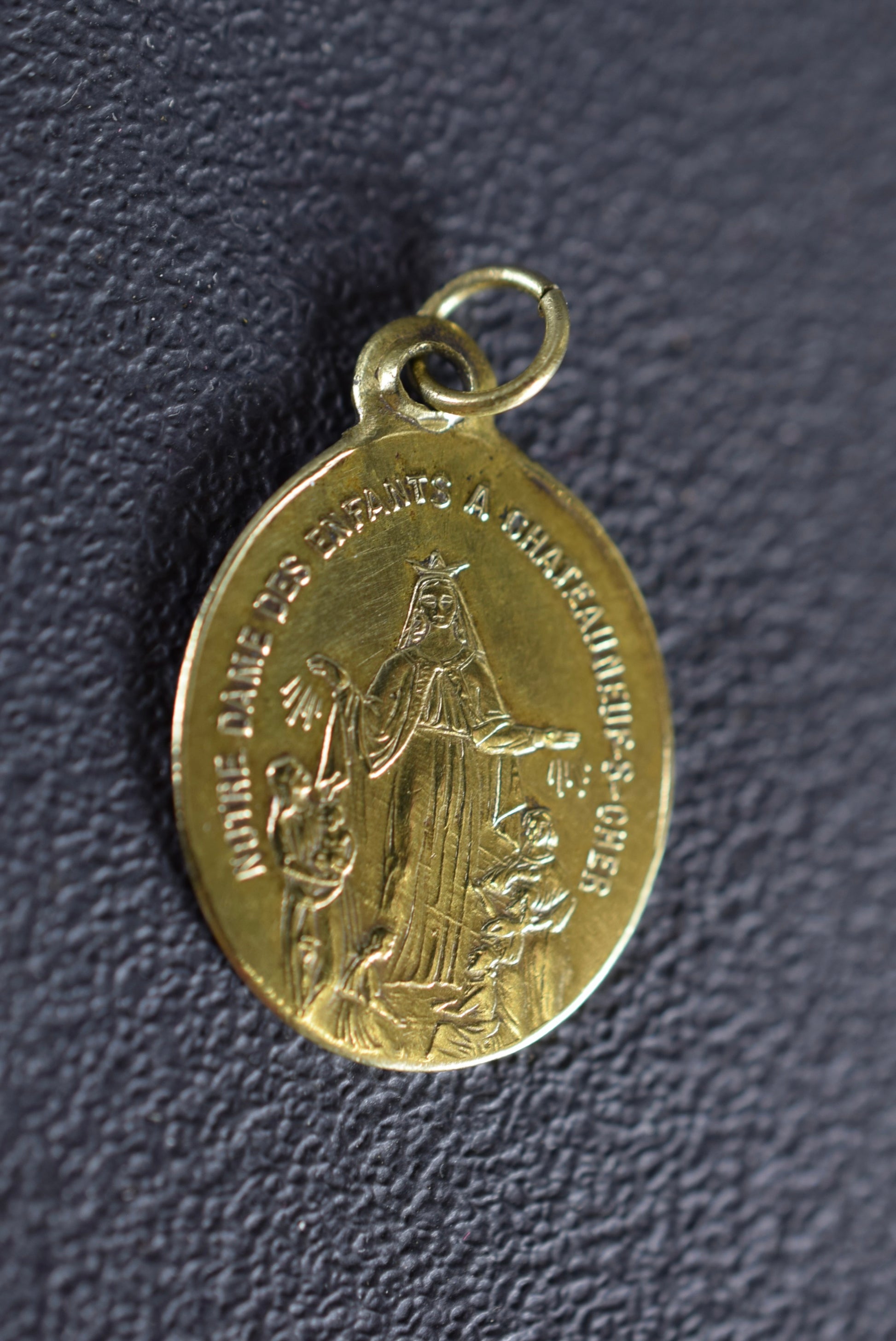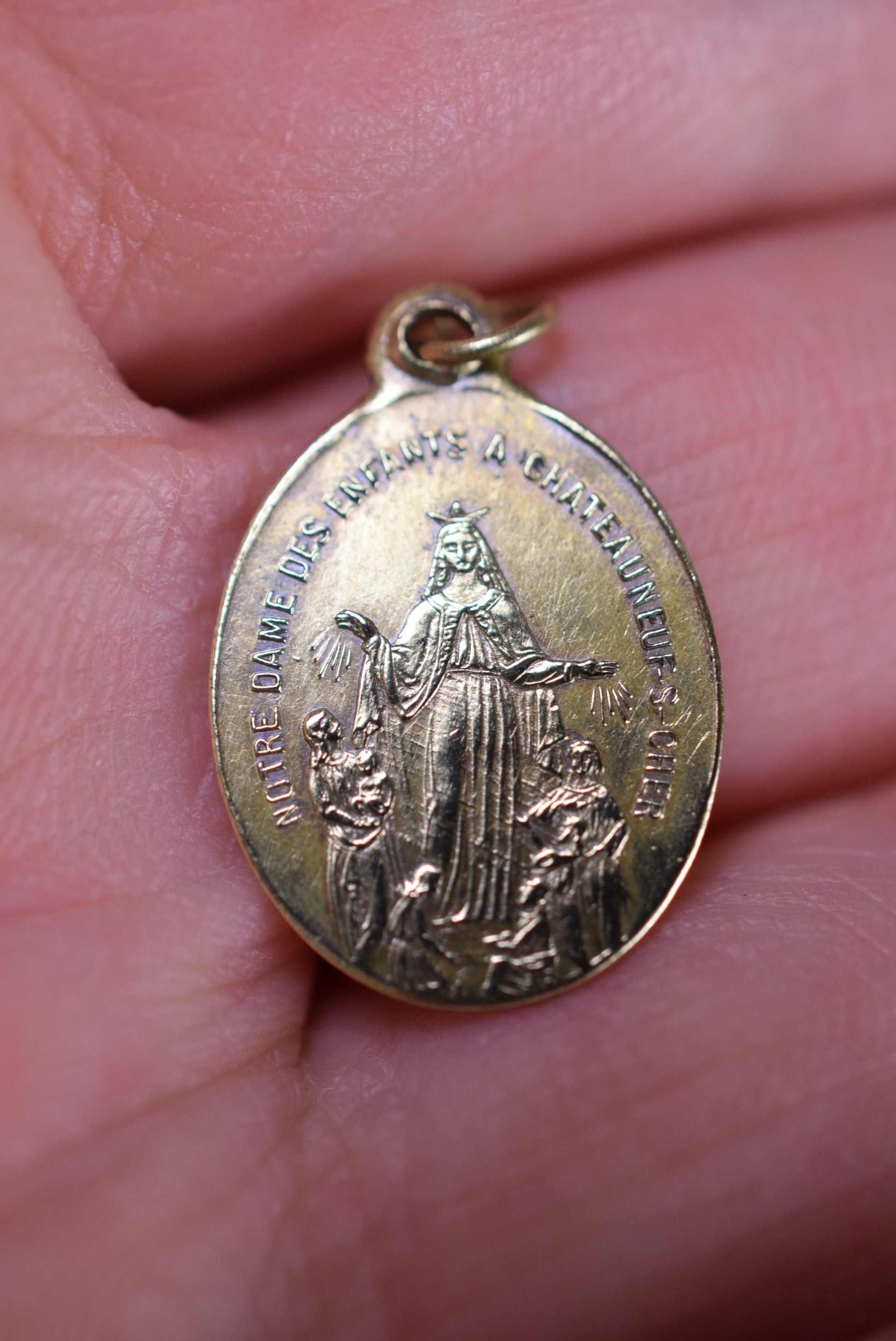 Rare médaille française antique représentant la Vierge Marie bénissant les gens sous l'inscription : Notre Dame des Enfants Chateauneuf Sous Cher "Notre Dame des Enfants".