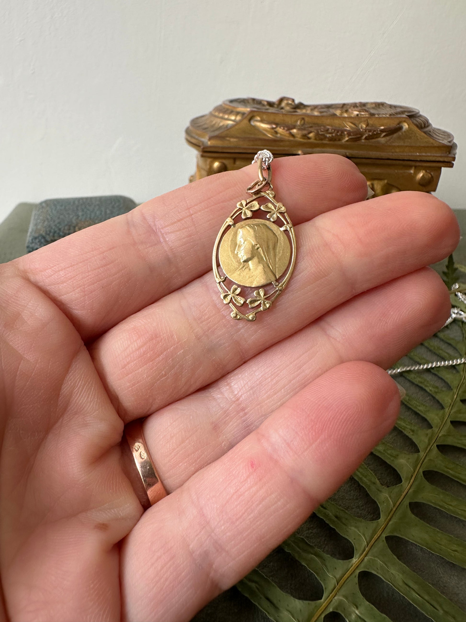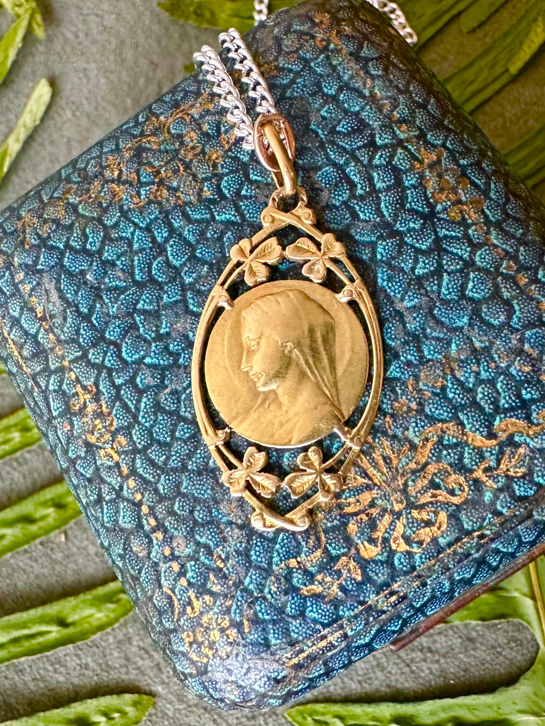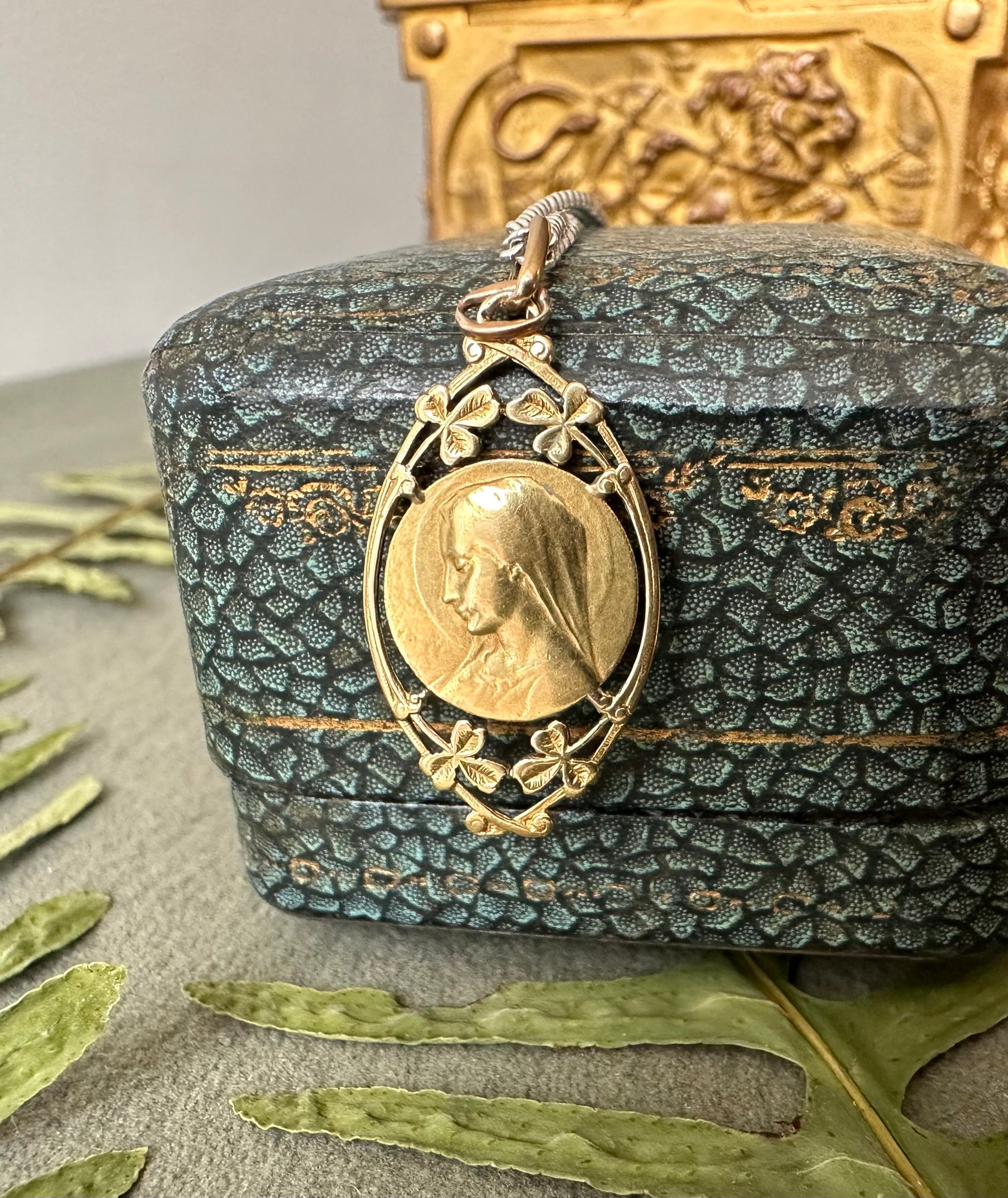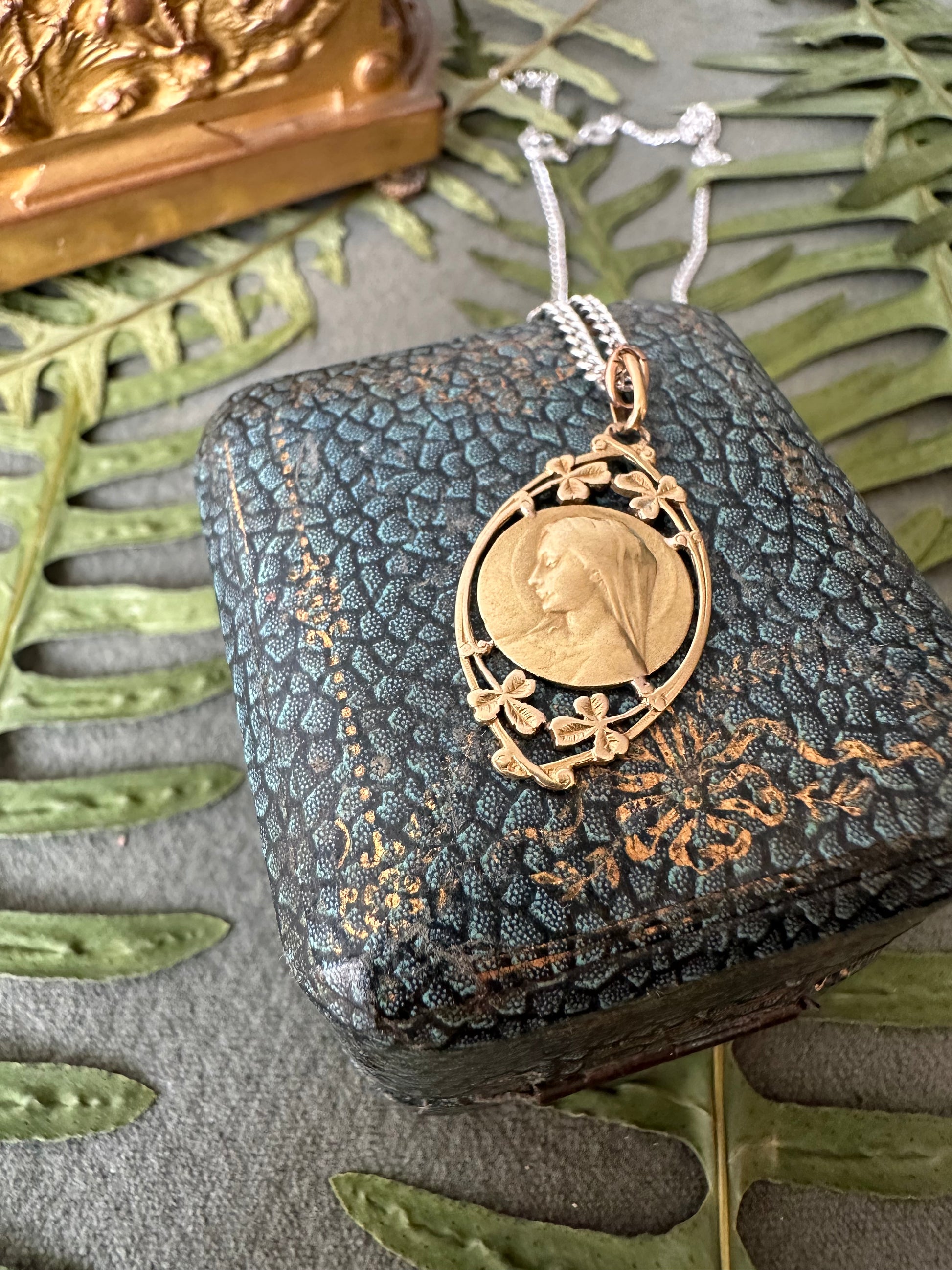 Art Nouveau 18K Gold Openwork Mary Pendant, Our Lady Protector Medal for Women, Gift for Her, Clover Denise