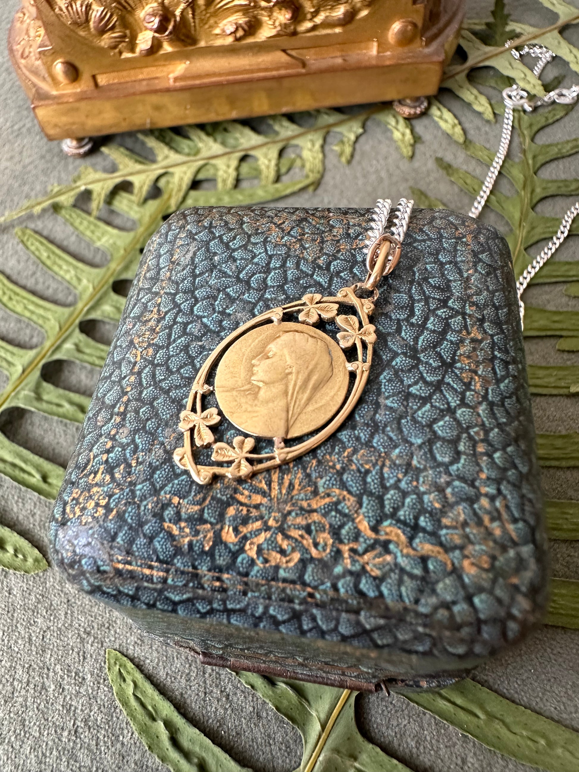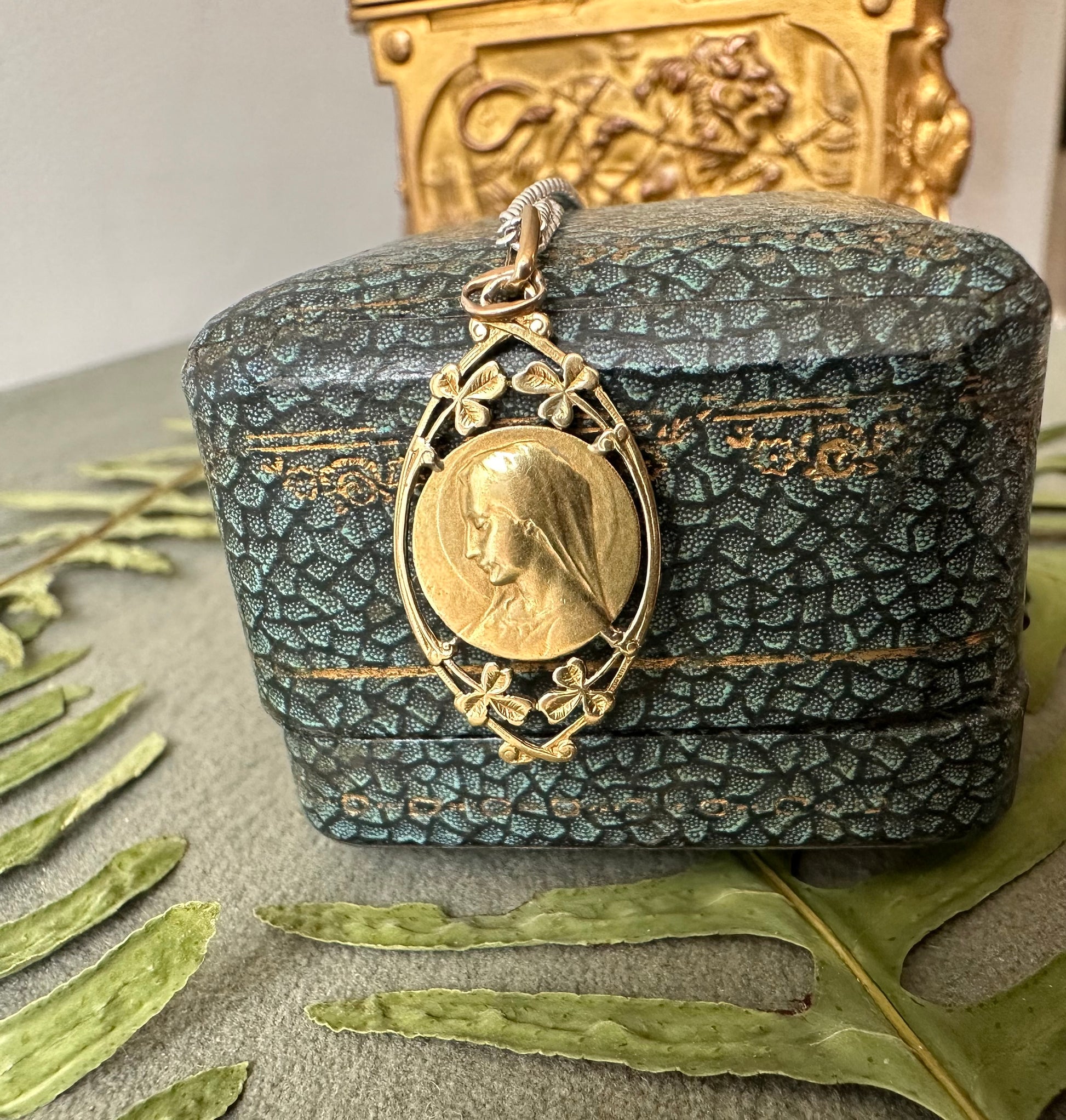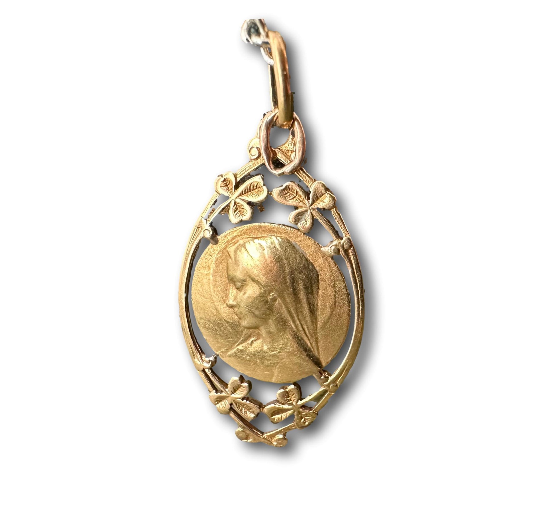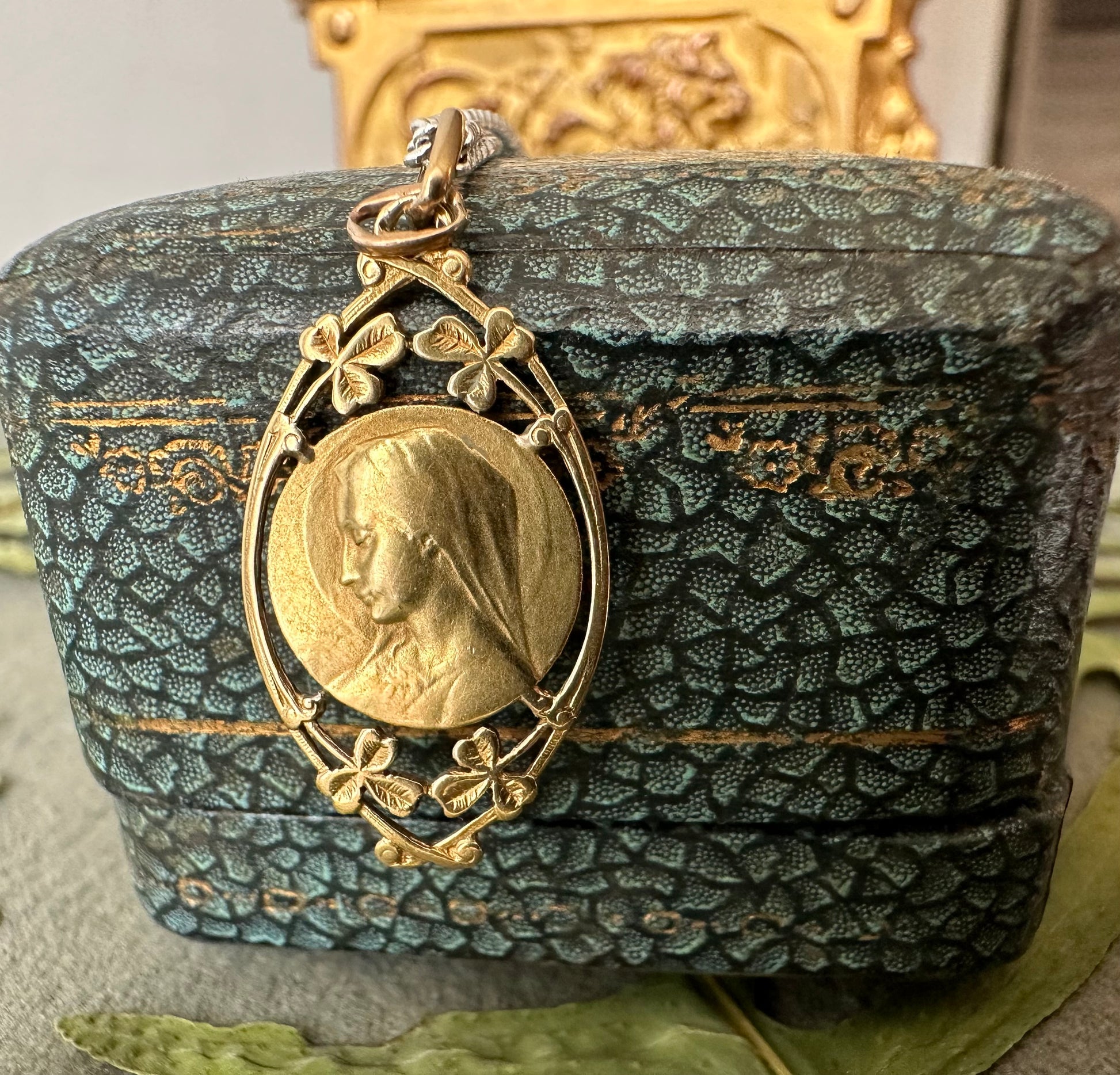 Art Nouveau 18K Gold Openwork Mary Pendant, Our Lady Protector Medal for Women, Gift for Her, Clover Denise