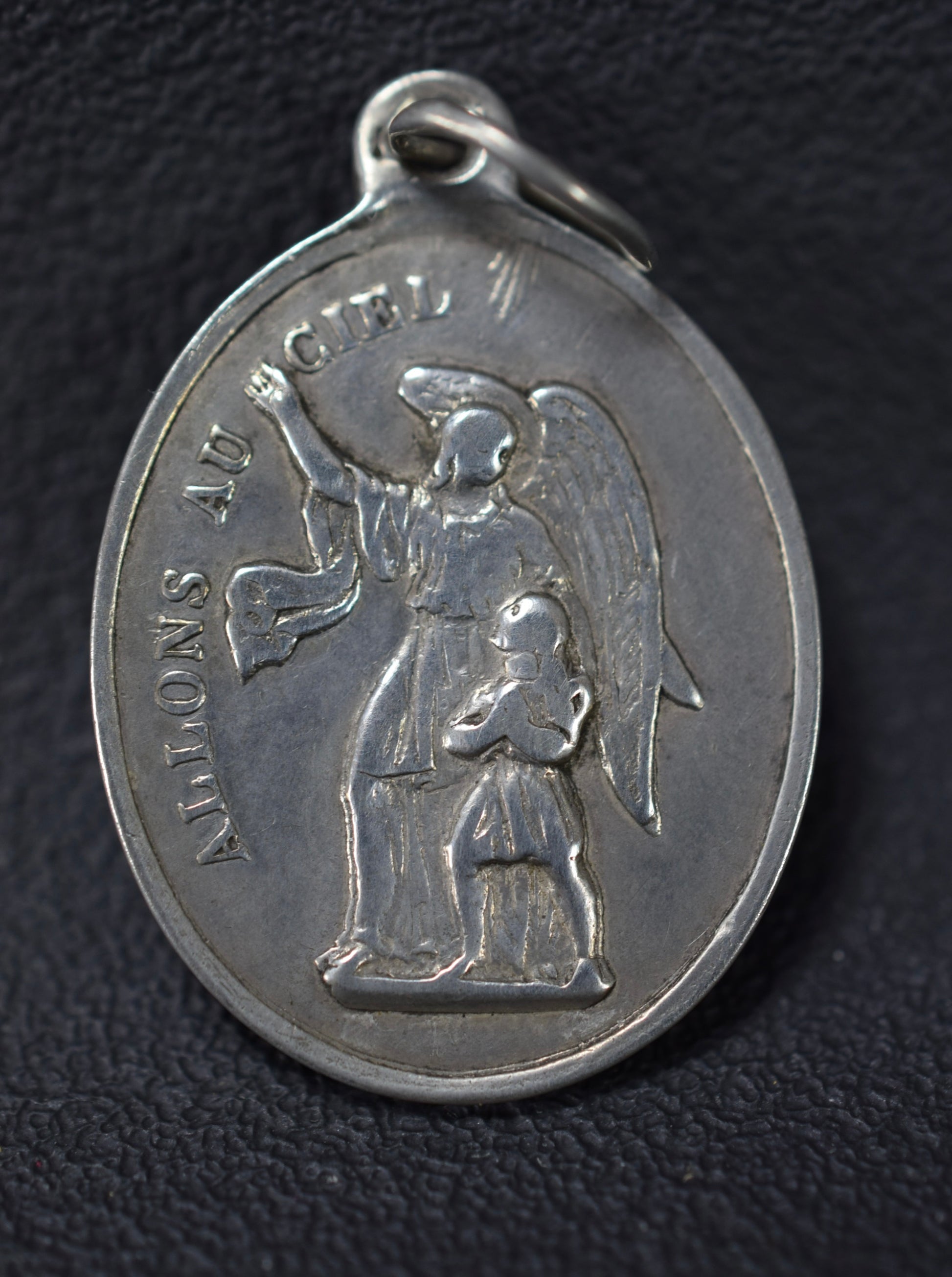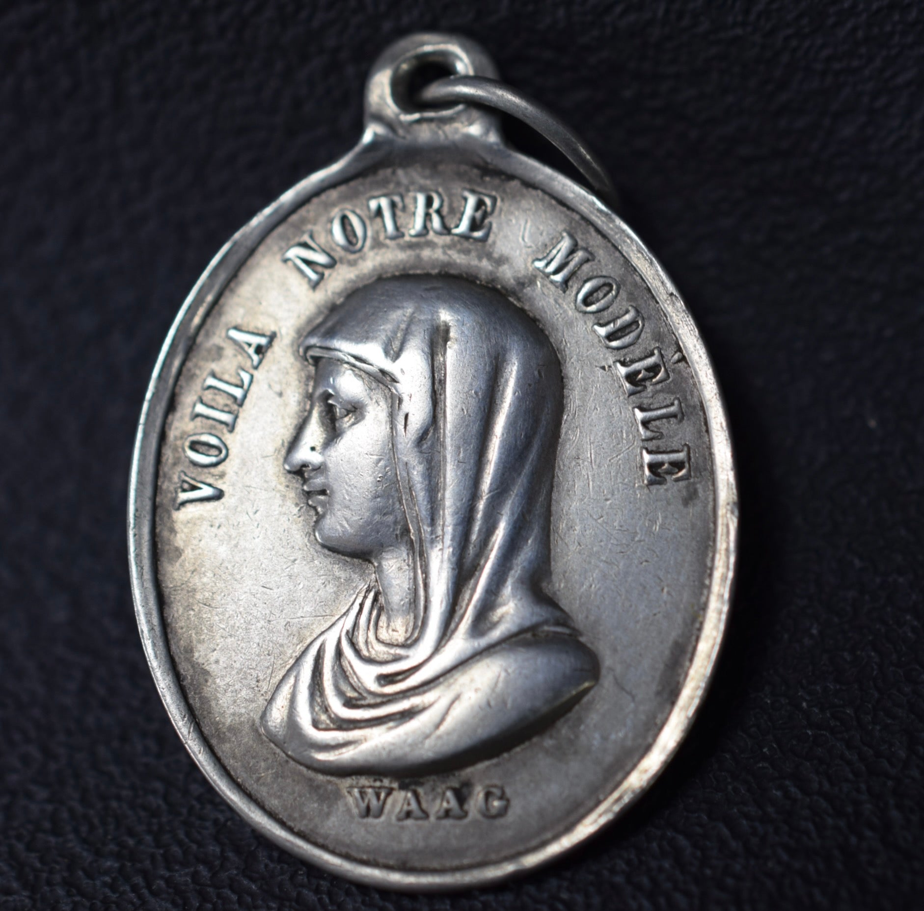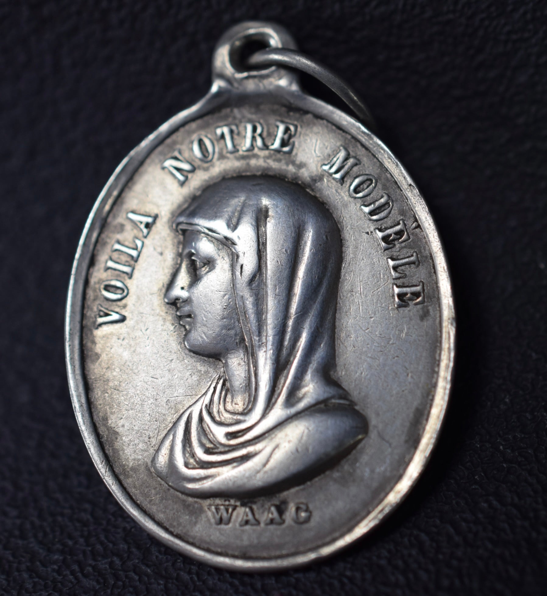 Le pendentif catholique présente sur le devant un portrait en relief de Notre-Dame. Son profil est joliment frappé. Sur le pourtour se trouve l'inscription "Voilà Notre Modèle". A la base se trouve la signature « Waag ». Au revers, le pendentif représente l'image d'un ange conduisant un petit enfant. Sur le pourtour se trouve l'inscription "Allons Au Ciel" - "Allons au Ciel".