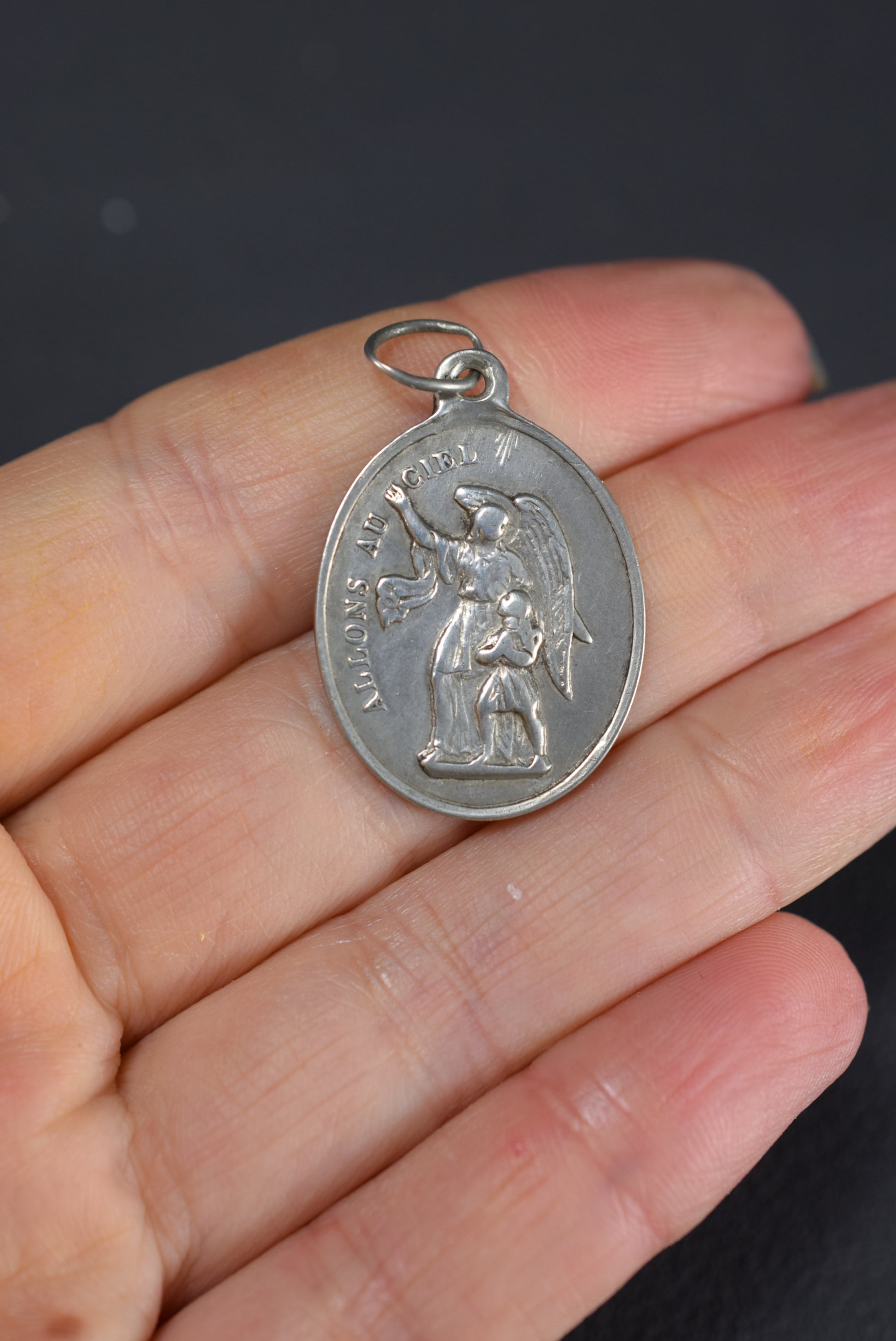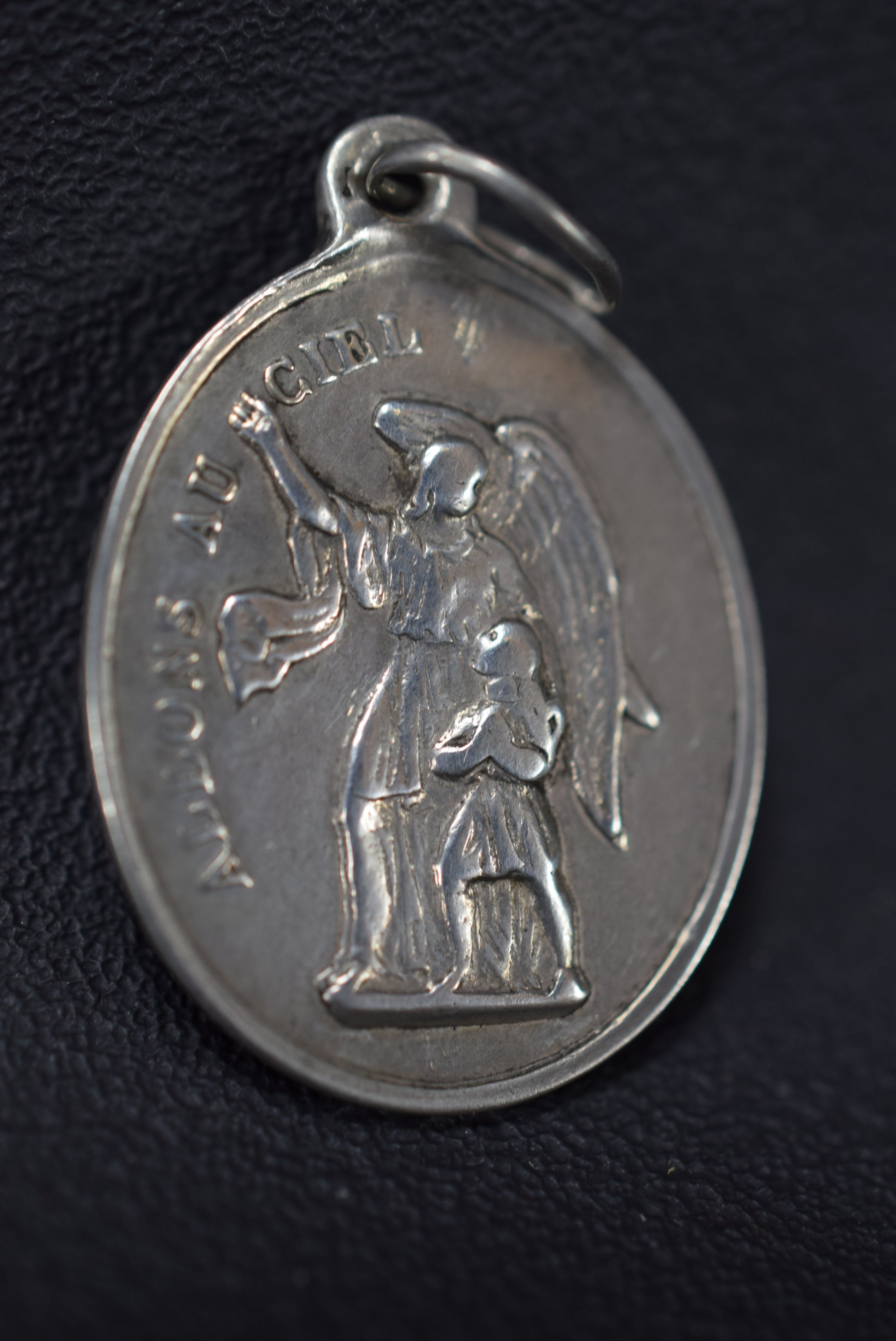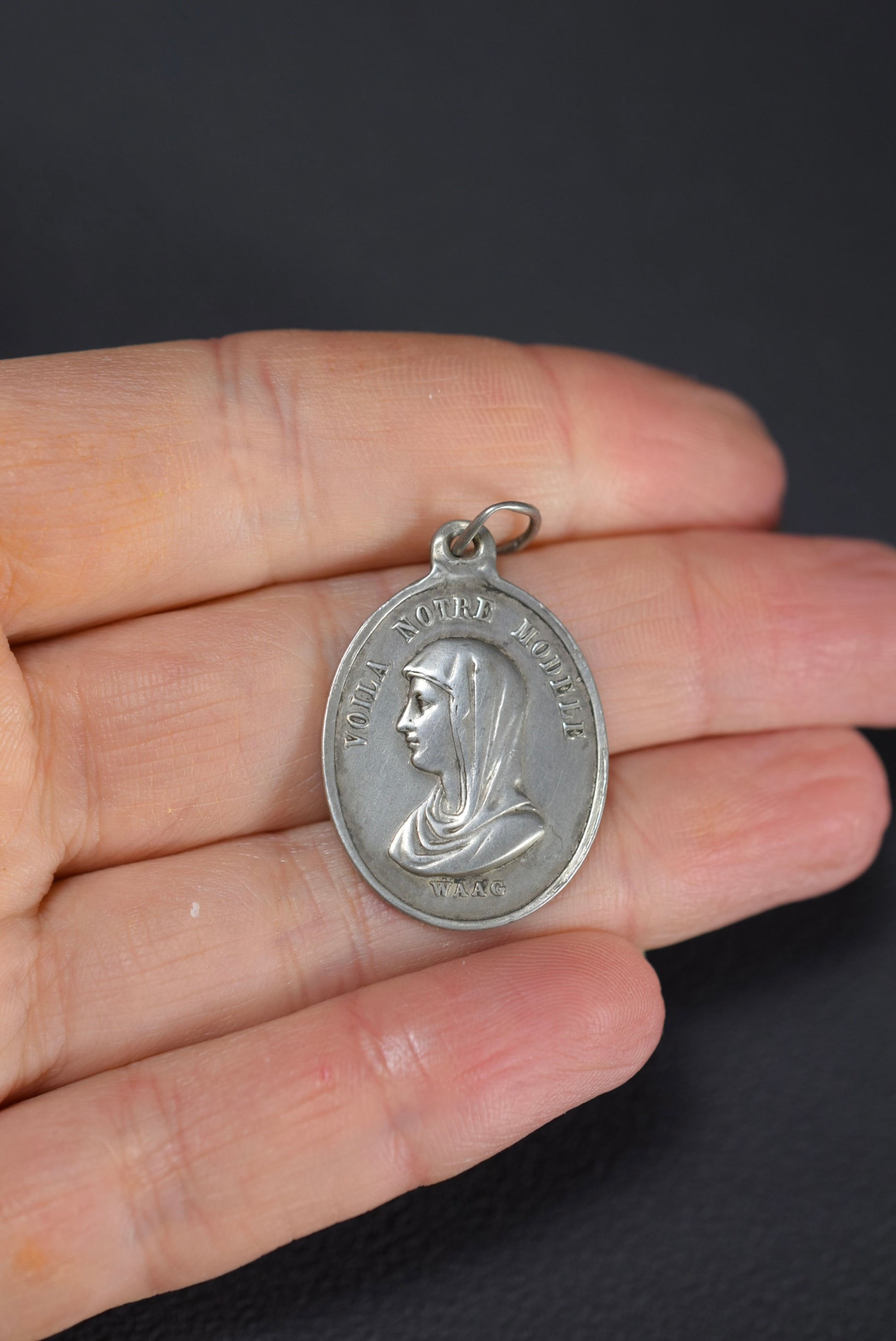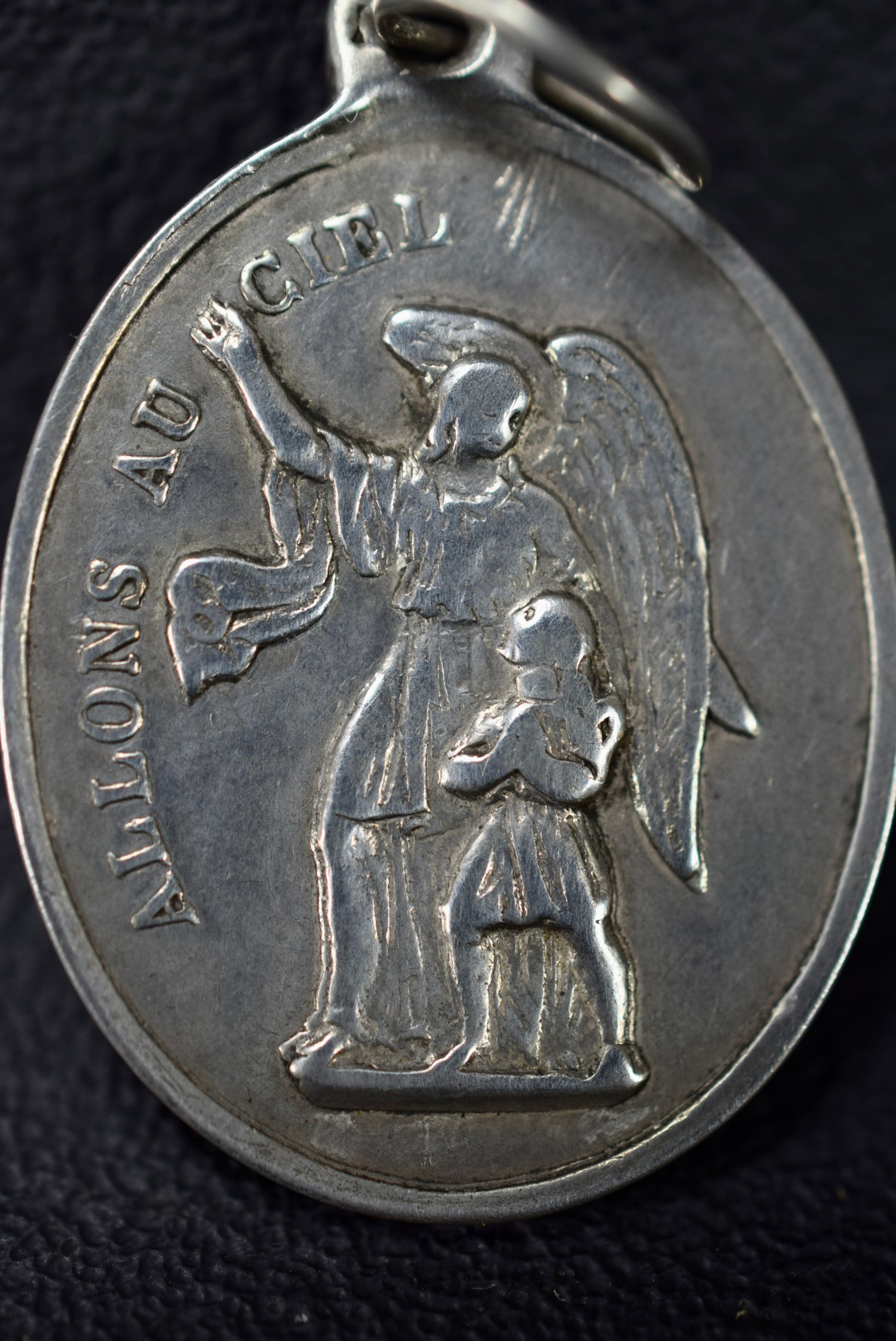Le pendentif catholique présente sur le devant un portrait en relief de Notre-Dame. Son profil est joliment frappé. Sur le pourtour se trouve l'inscription "Voilà Notre Modèle". A la base se trouve la signature « Waag ». Au revers, le pendentif représente l'image d'un ange conduisant un petit enfant. Sur le pourtour se trouve l'inscription "Allons Au Ciel" - "Allons au Ciel".