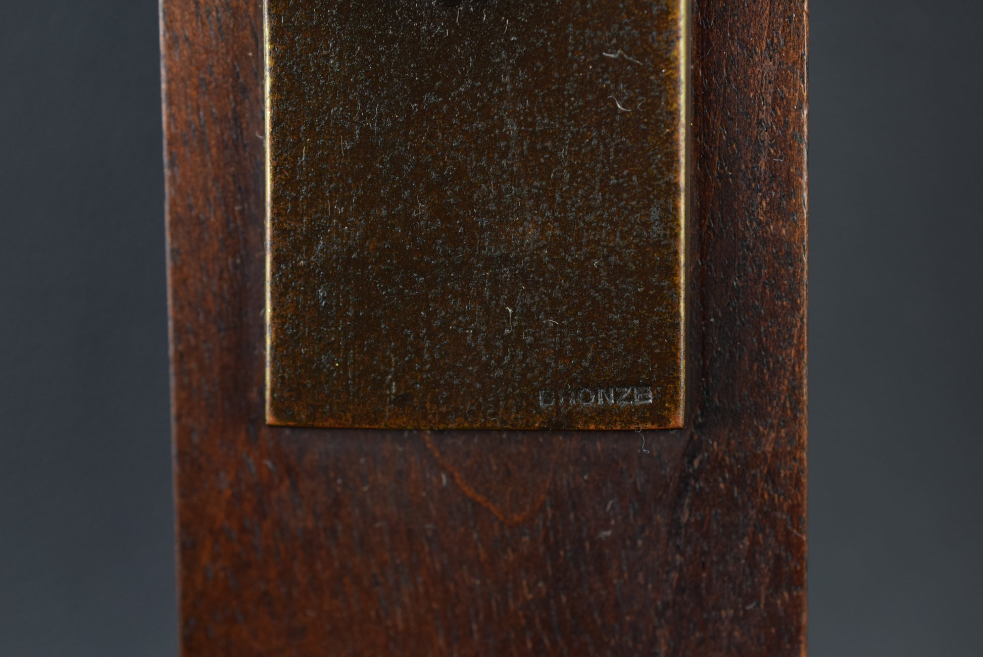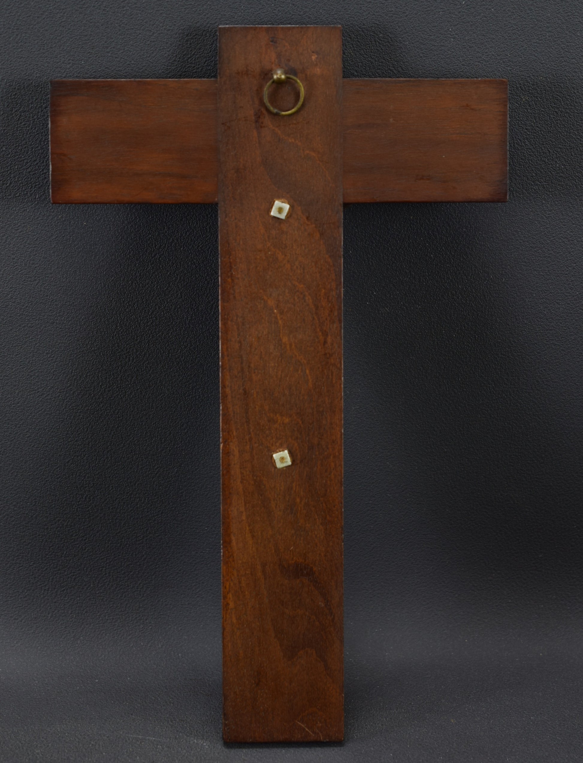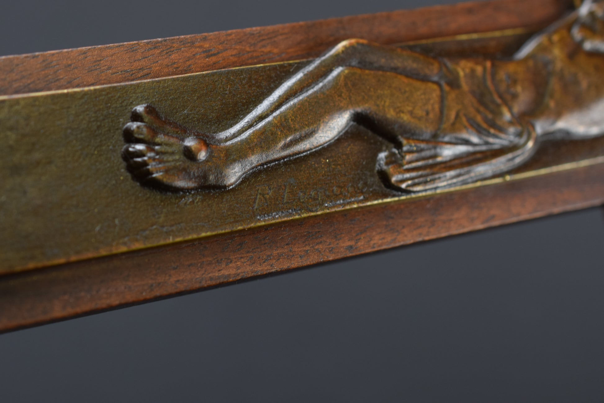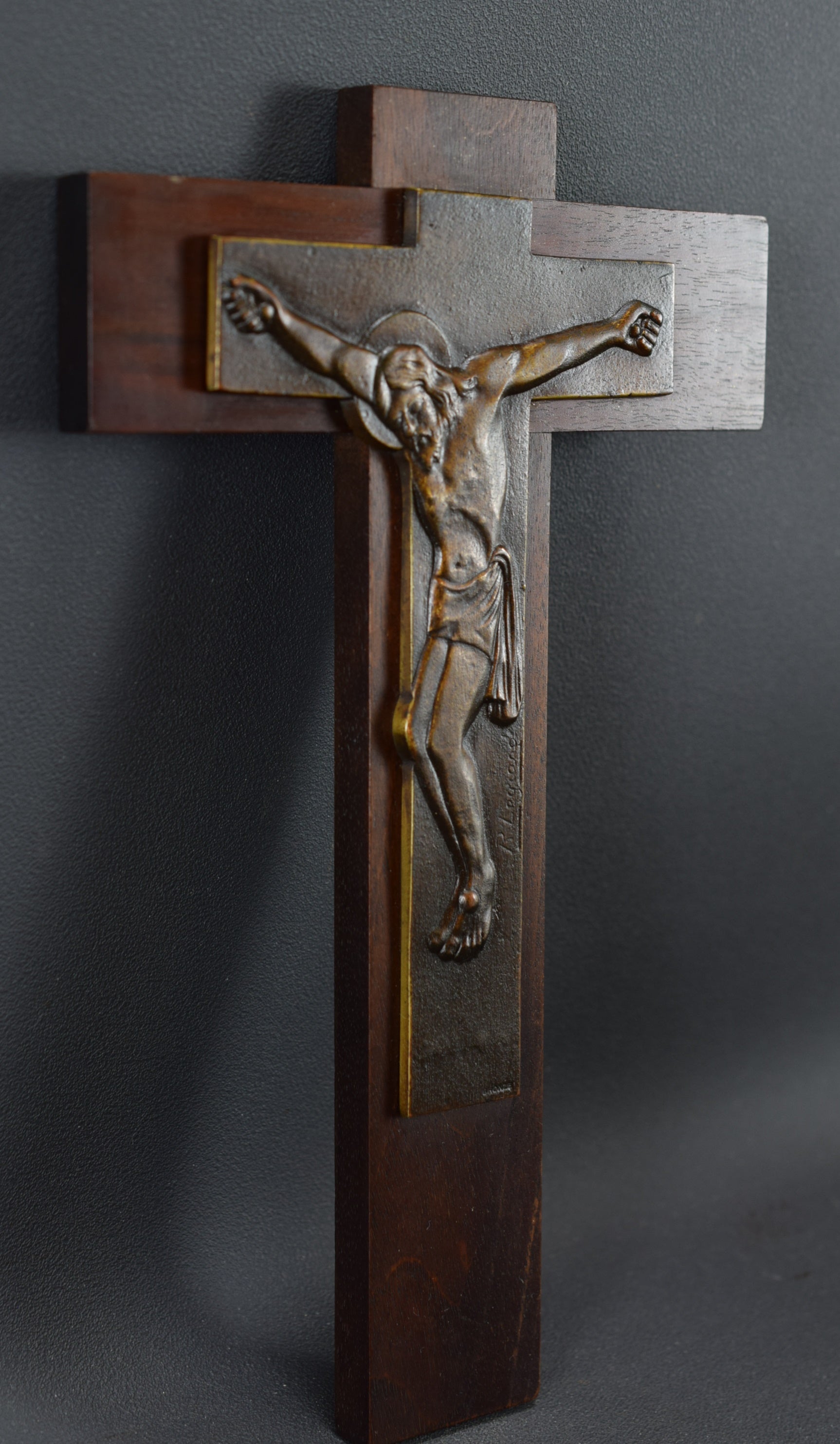 Une croix murale religieuse vintage française en bronze et bois. La croix de Jésus-Christ a été coulée en bronze (bronze estampillé) et a été signée par l'artiste français R.Legrand. Ce crucifix de style moderne date des années 1950. Ce serait un beau cadeau de communion.