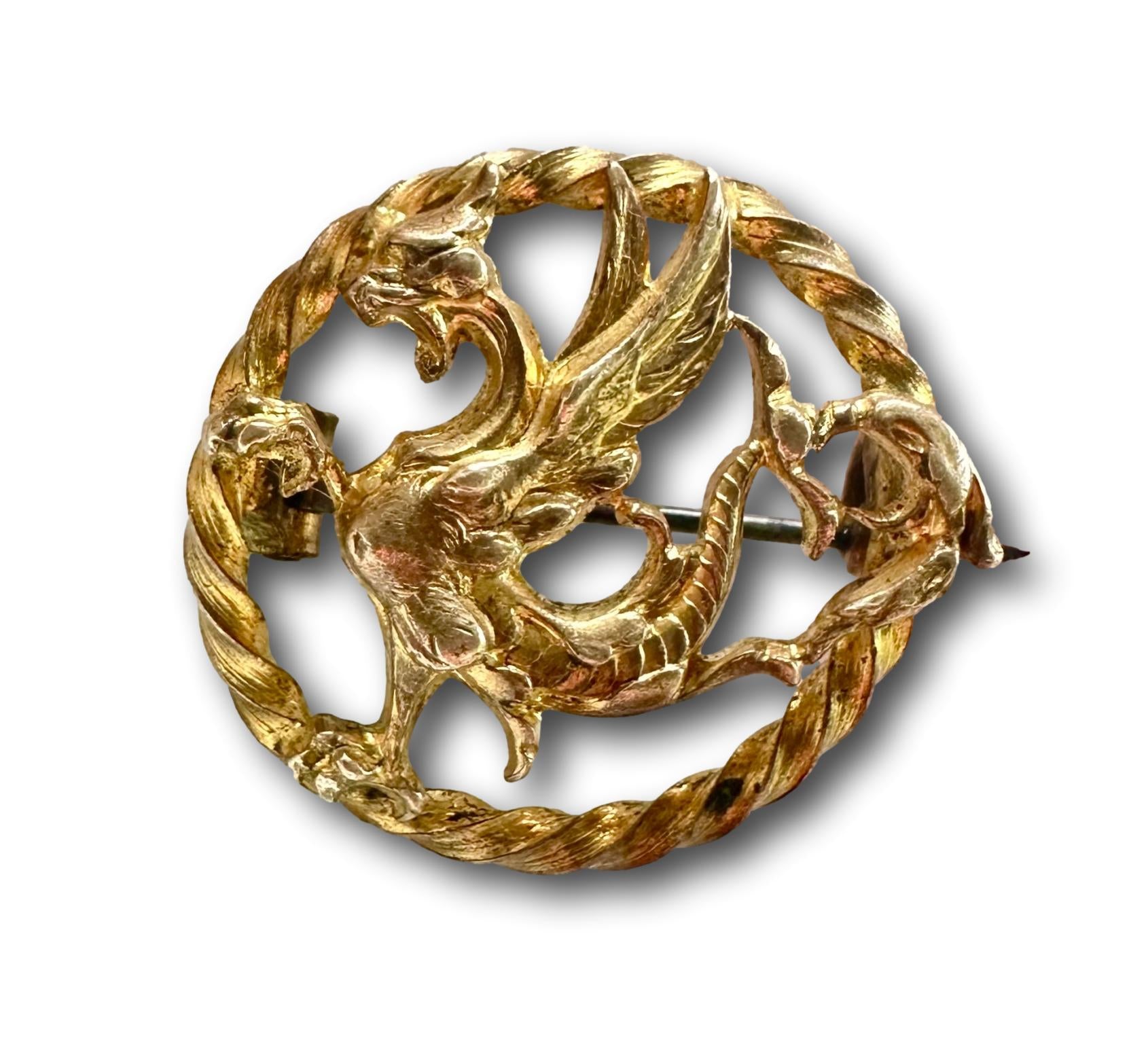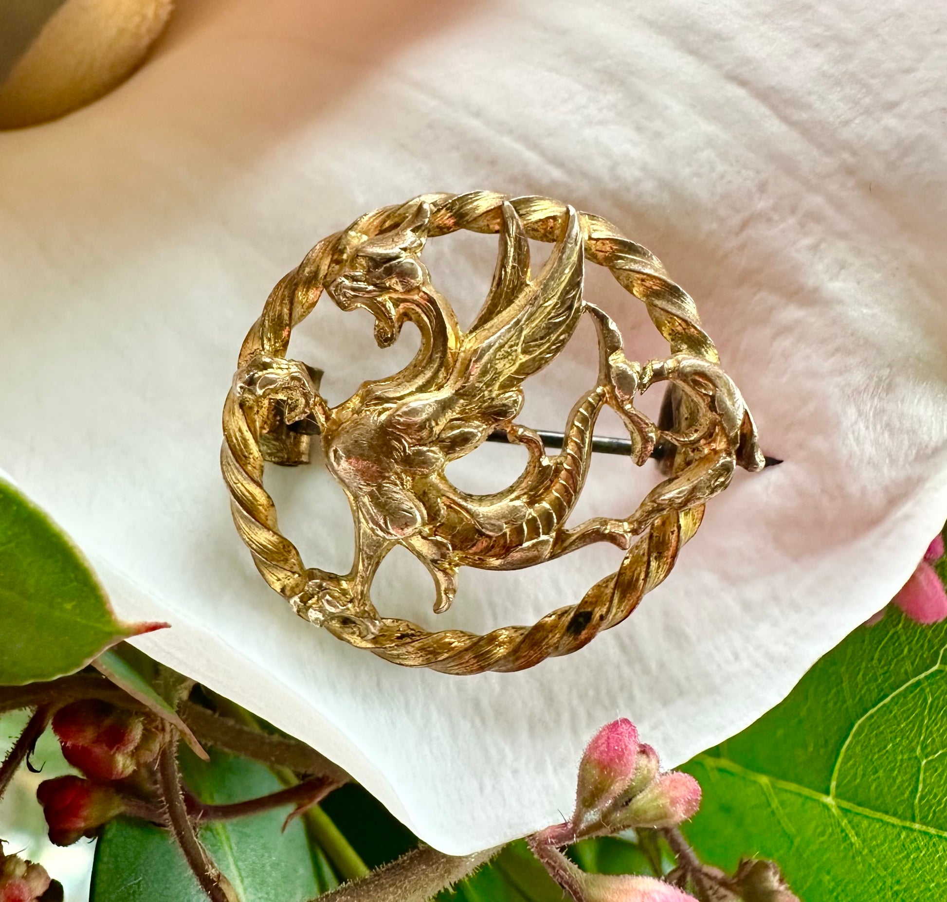 Une belle broche antique française datant des années 1900. Le pin's Art Nouveau met en scène avec finesse une créature mythique : un griffon ou une chimère. Ce bijou Belle Epoque est exquis.
