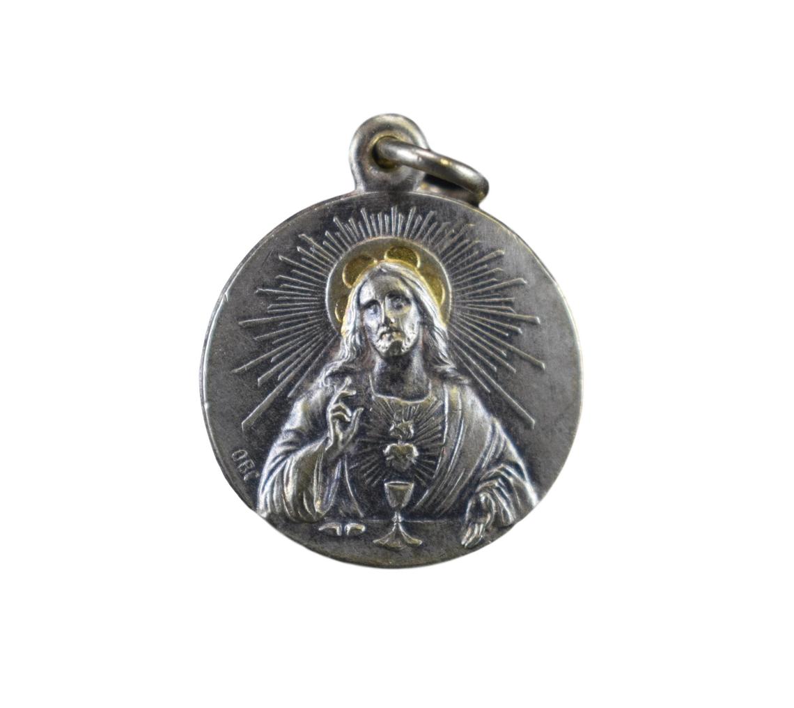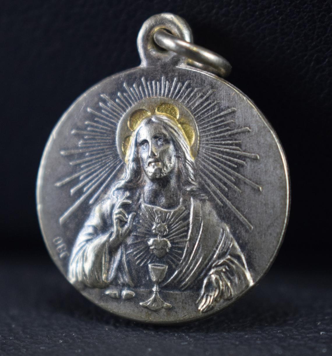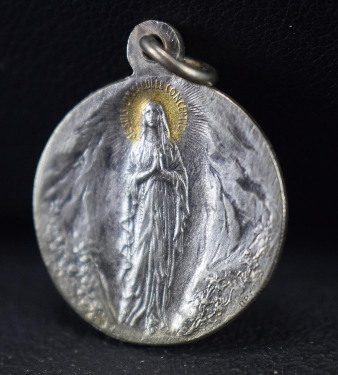 Une belle médaille religieuse française antique datant du début du 20ème siècle. Le pendentif raffiné représente le Sacré-Cœur de Jésus. Le revers représente Notre-Dame de Lourdes.
