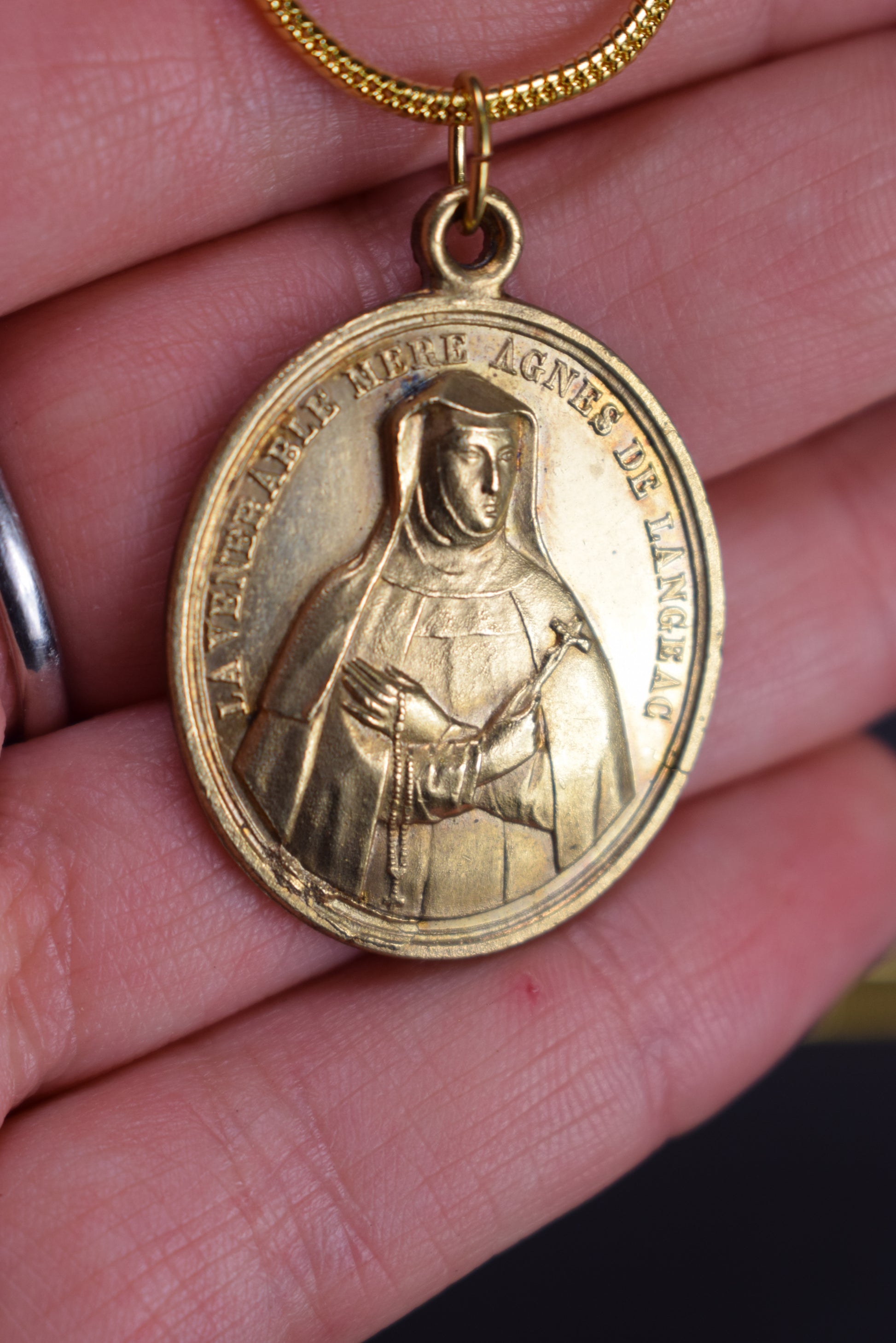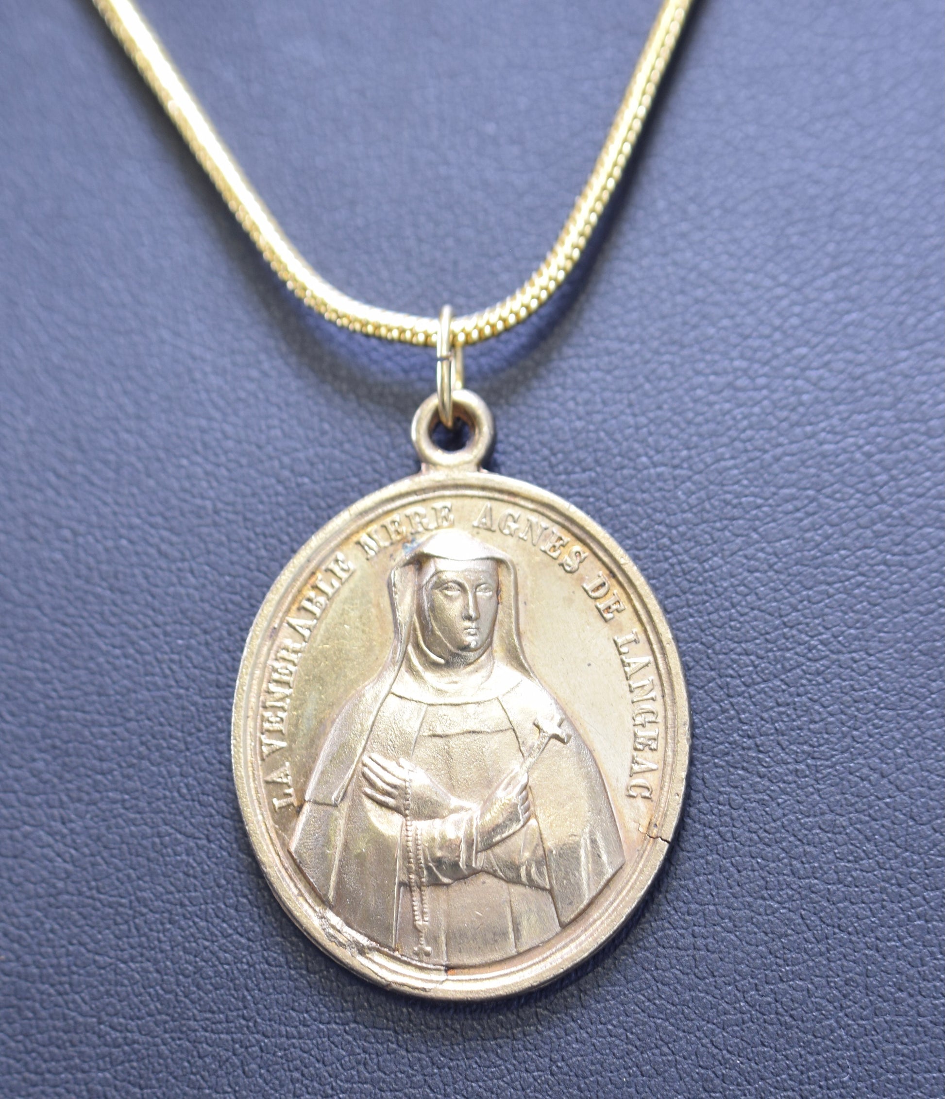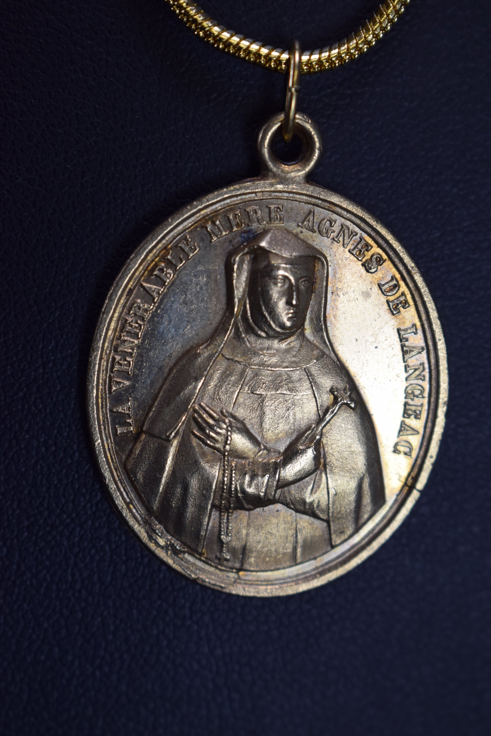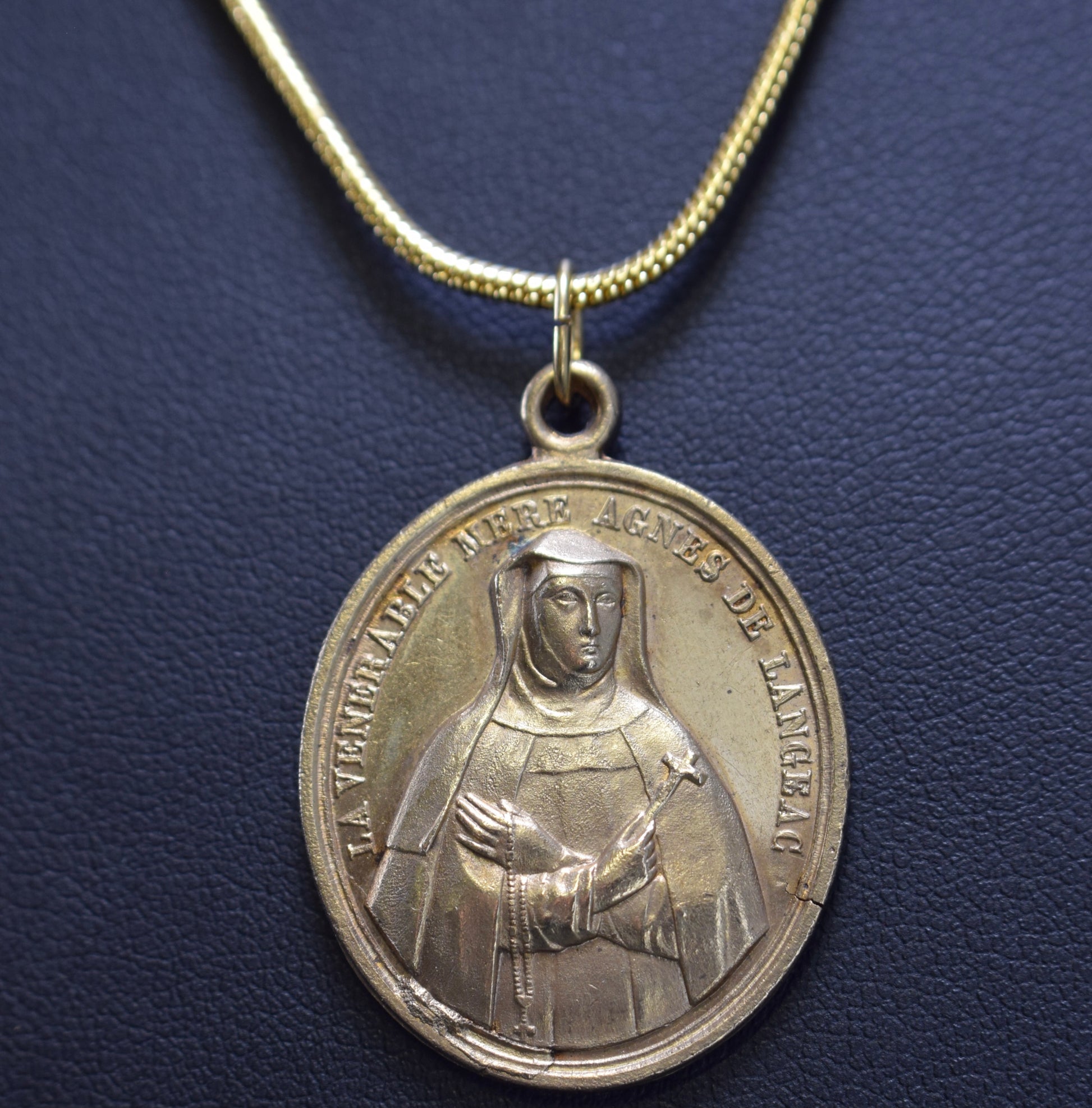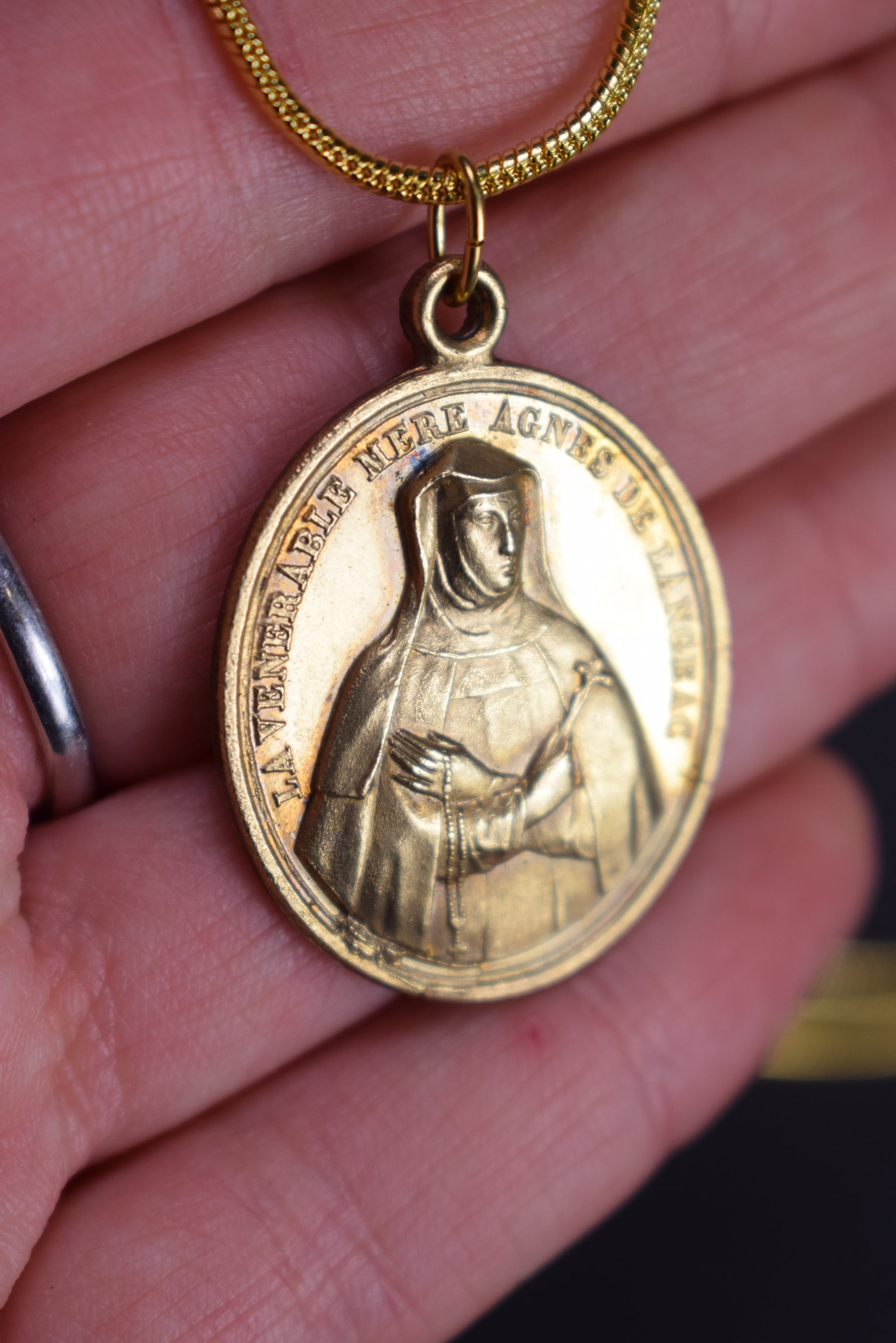 Une rare médaille religieuse antique datant du début du 20ème siècle. Le pendentif représente finement le portrait de la Bienheureuse Agnès de Langeac. Agnès de Jésus (1602 - 1634), était une religieuse dominicaine réputée pour sa charité et ses vertus. Bienheureuse par l'Église catholique, elle est célébrée le 19 octobre. Elle est invoquée pour les accouchements difficiles. Elle repose dans l'église du monastère Sainte Catherine de Langeac.