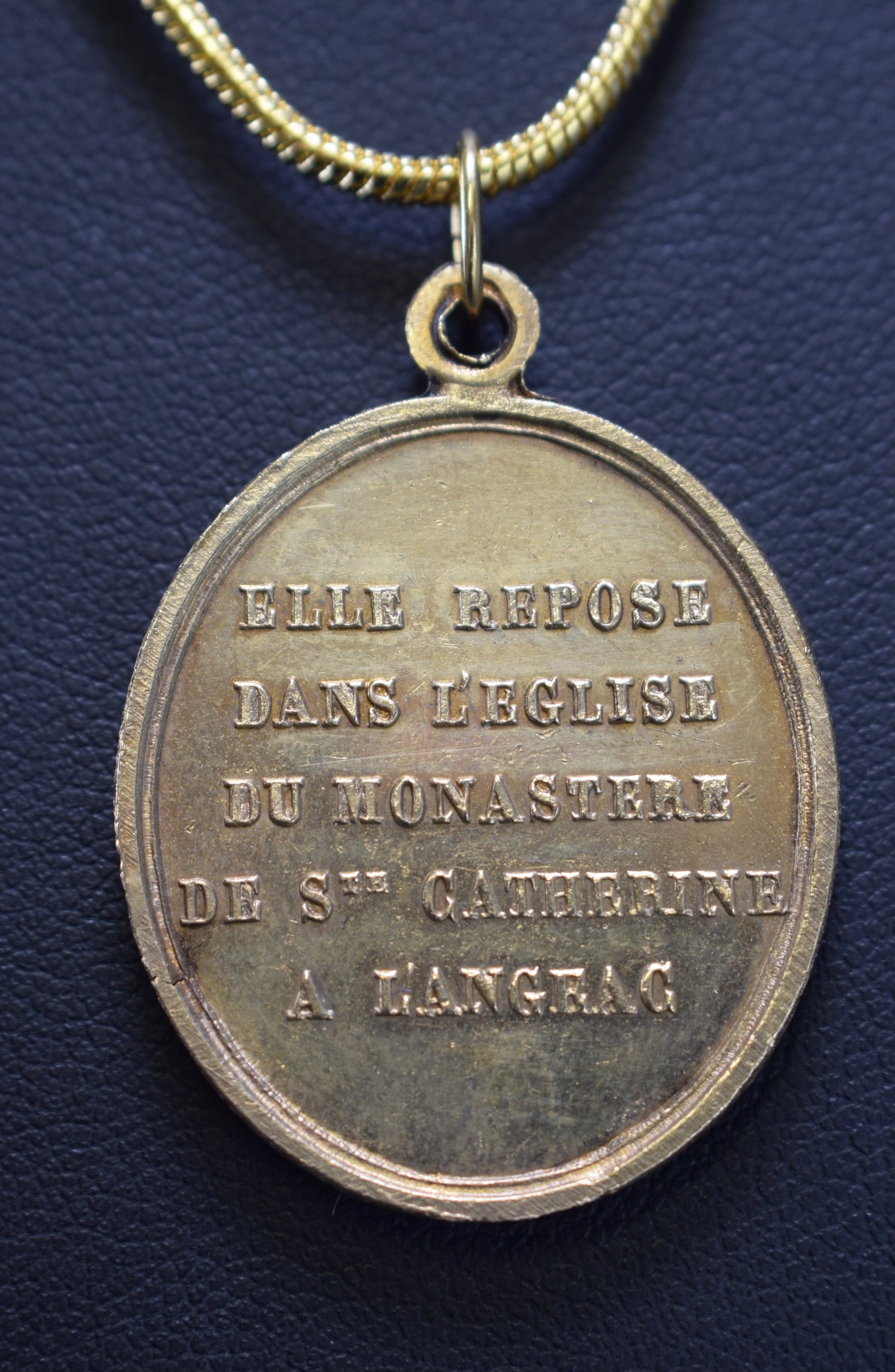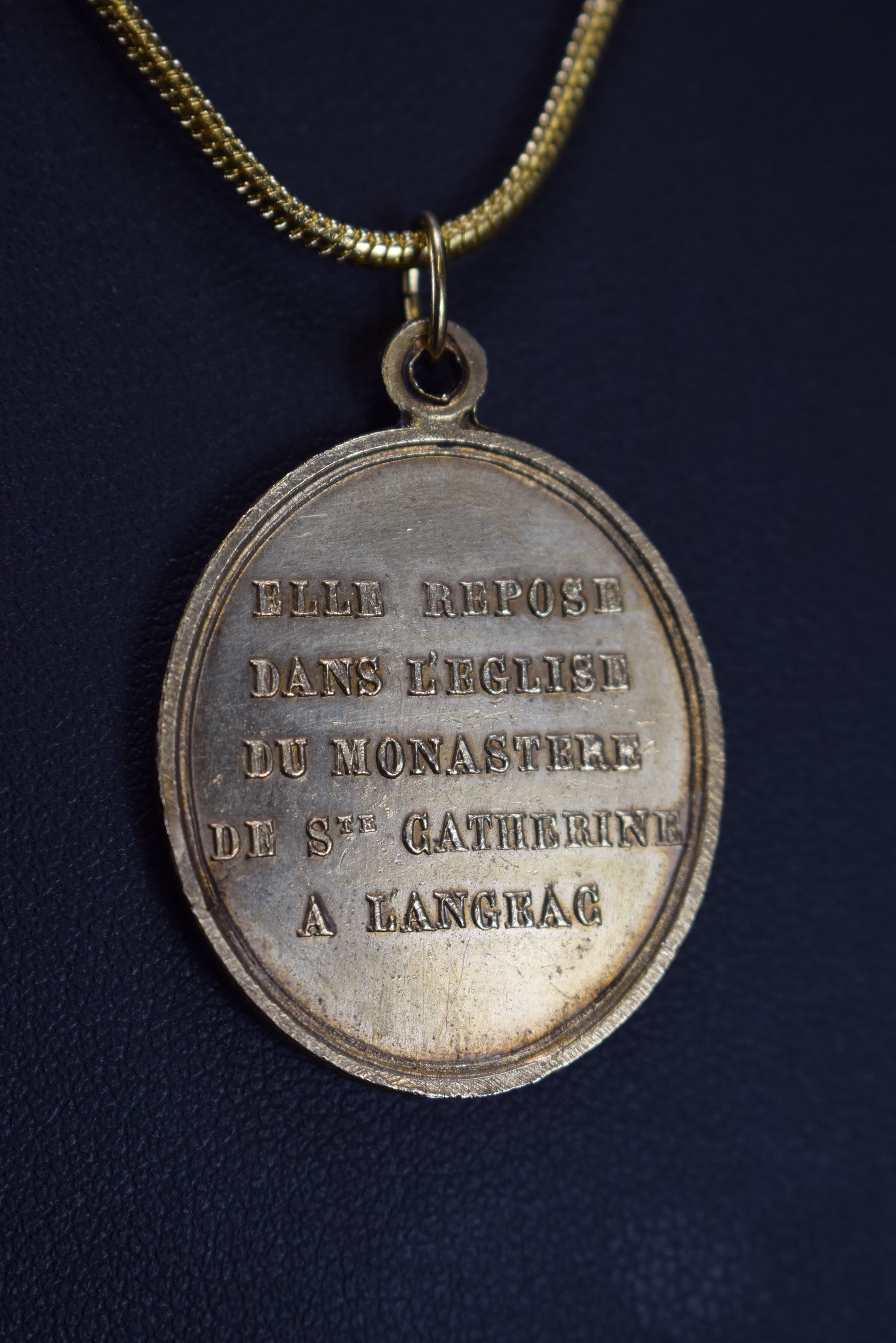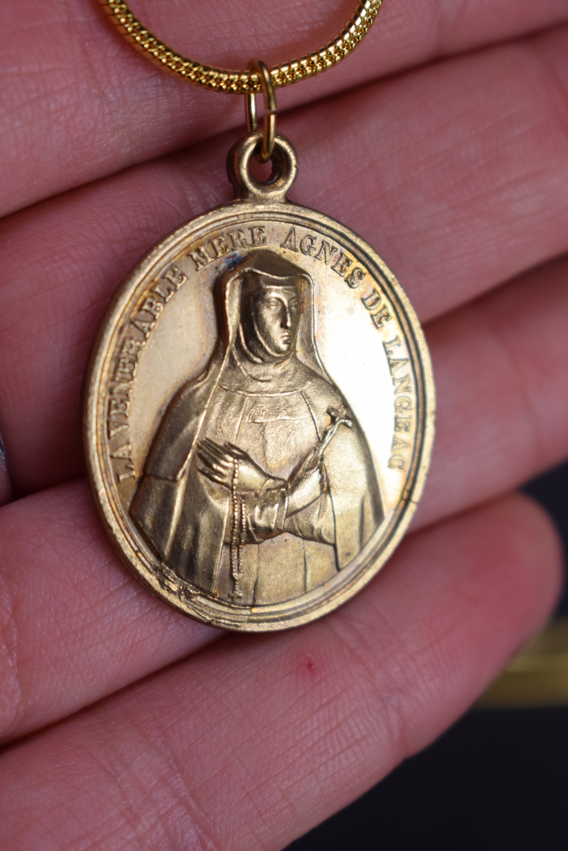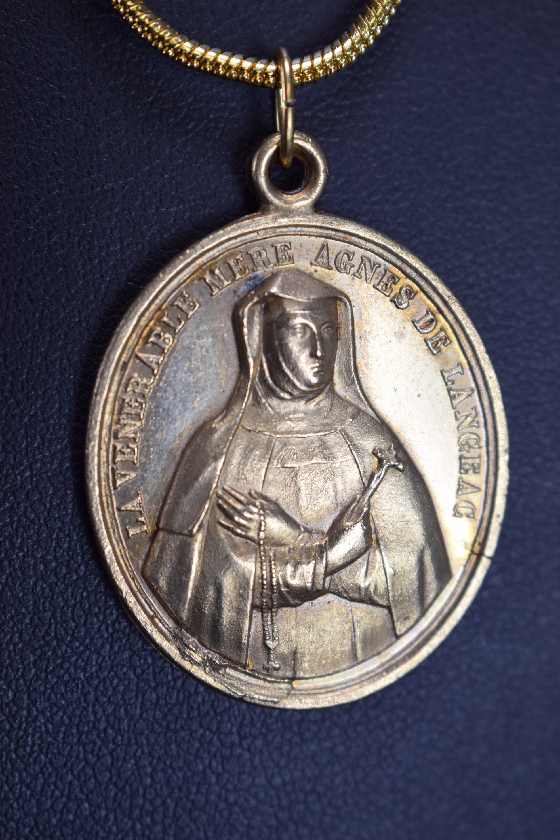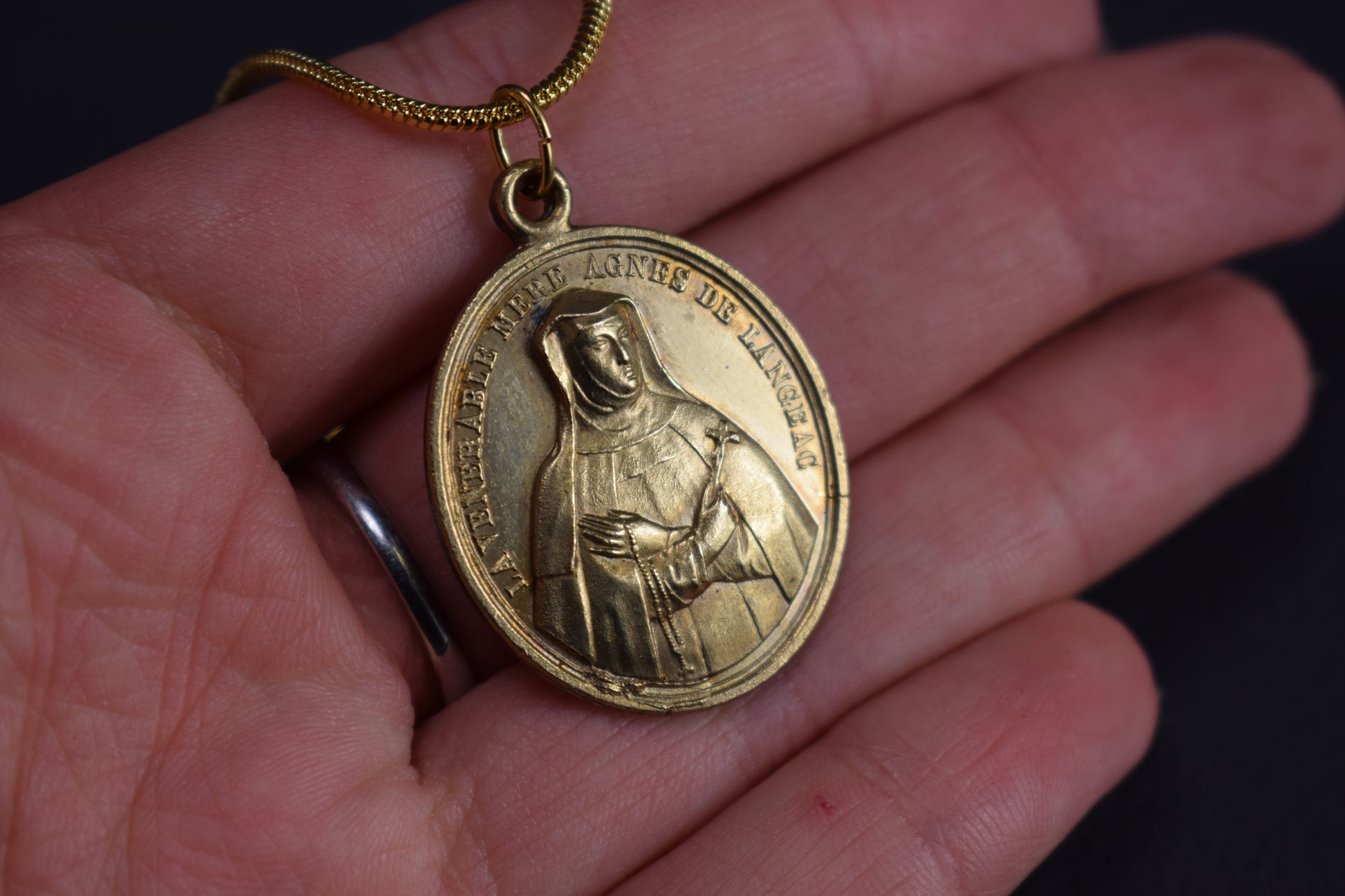 Une rare médaille religieuse antique datant du début du 20ème siècle. Le pendentif représente finement le portrait de la Bienheureuse Agnès de Langeac. Agnès de Jésus (1602 - 1634), était une religieuse dominicaine réputée pour sa charité et ses vertus. Bienheureuse par l'Église catholique, elle est célébrée le 19 octobre. Elle est invoquée pour les accouchements difficiles. Elle repose dans l'église du monastère Sainte Catherine de Langeac.