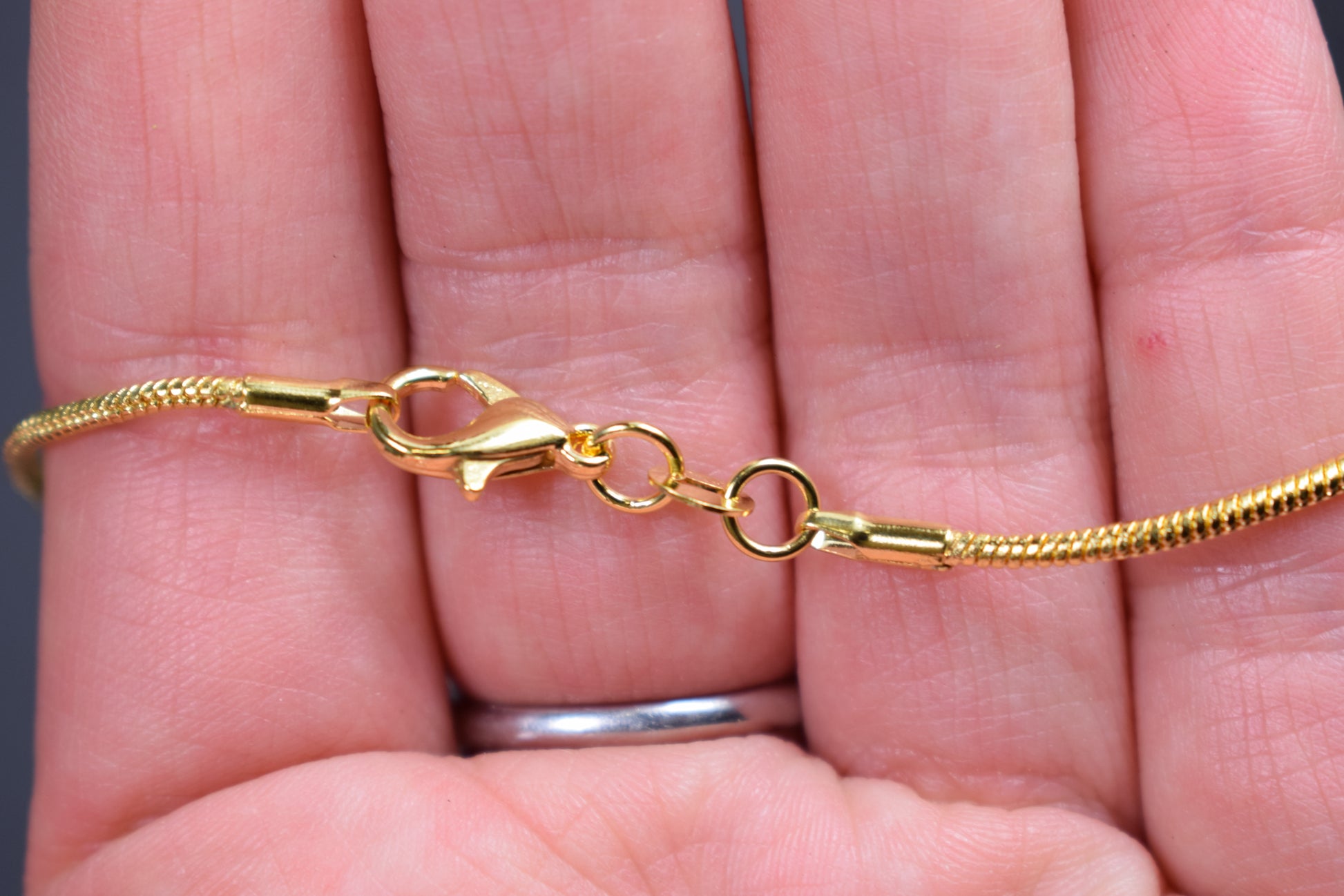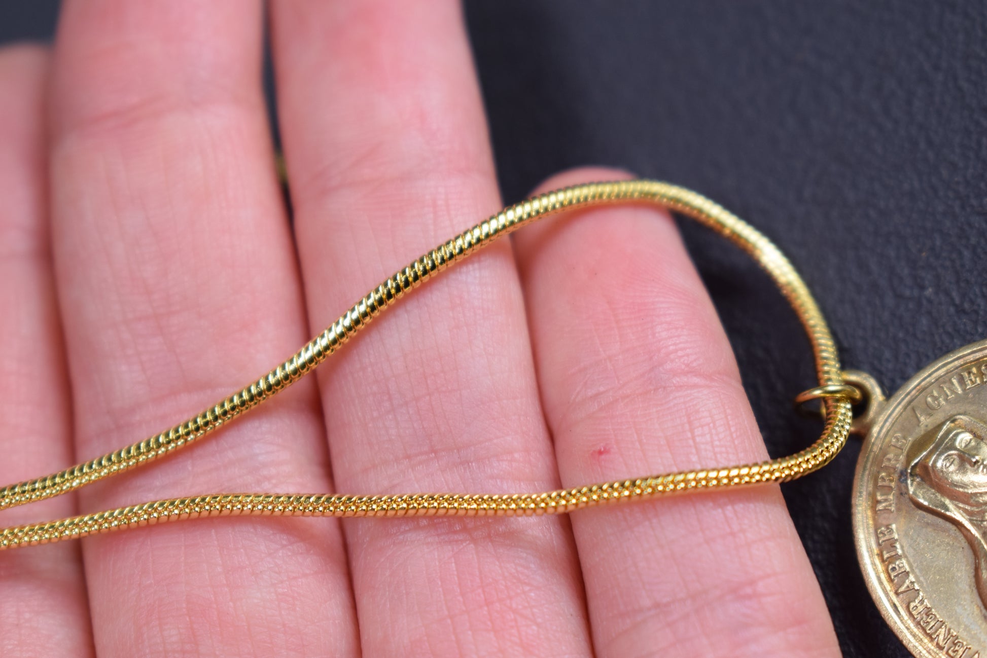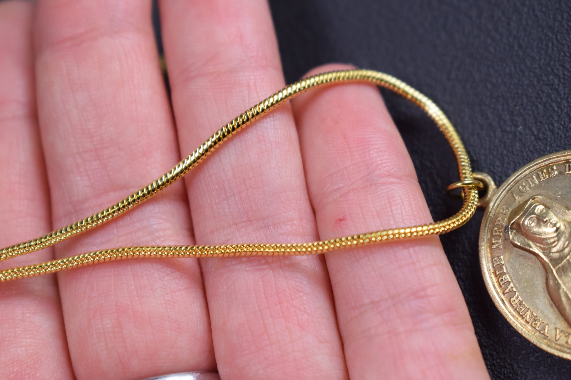 La médaille flotte sur une nouvelle chaîne serpentine plaquée or 18 carats mesurant 20 pouces (50 cm) de long.