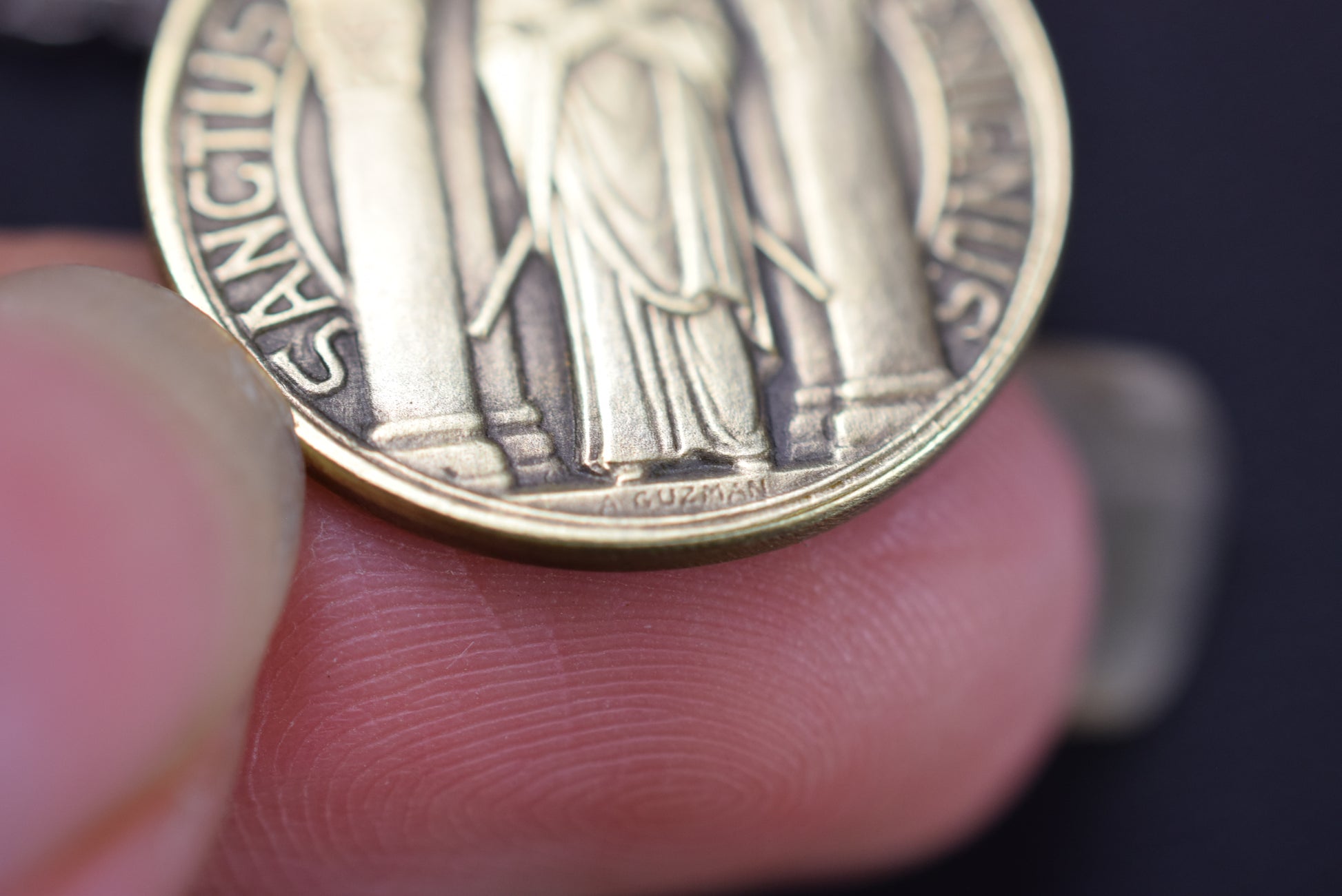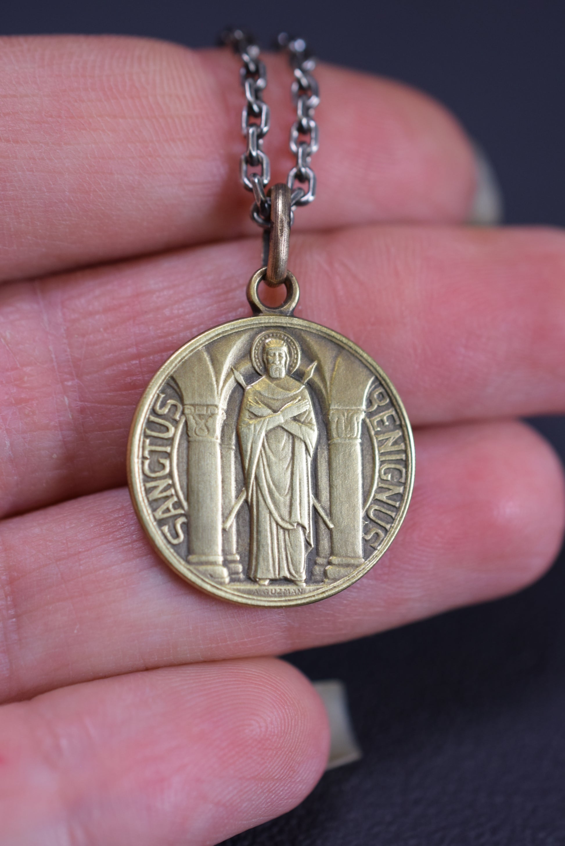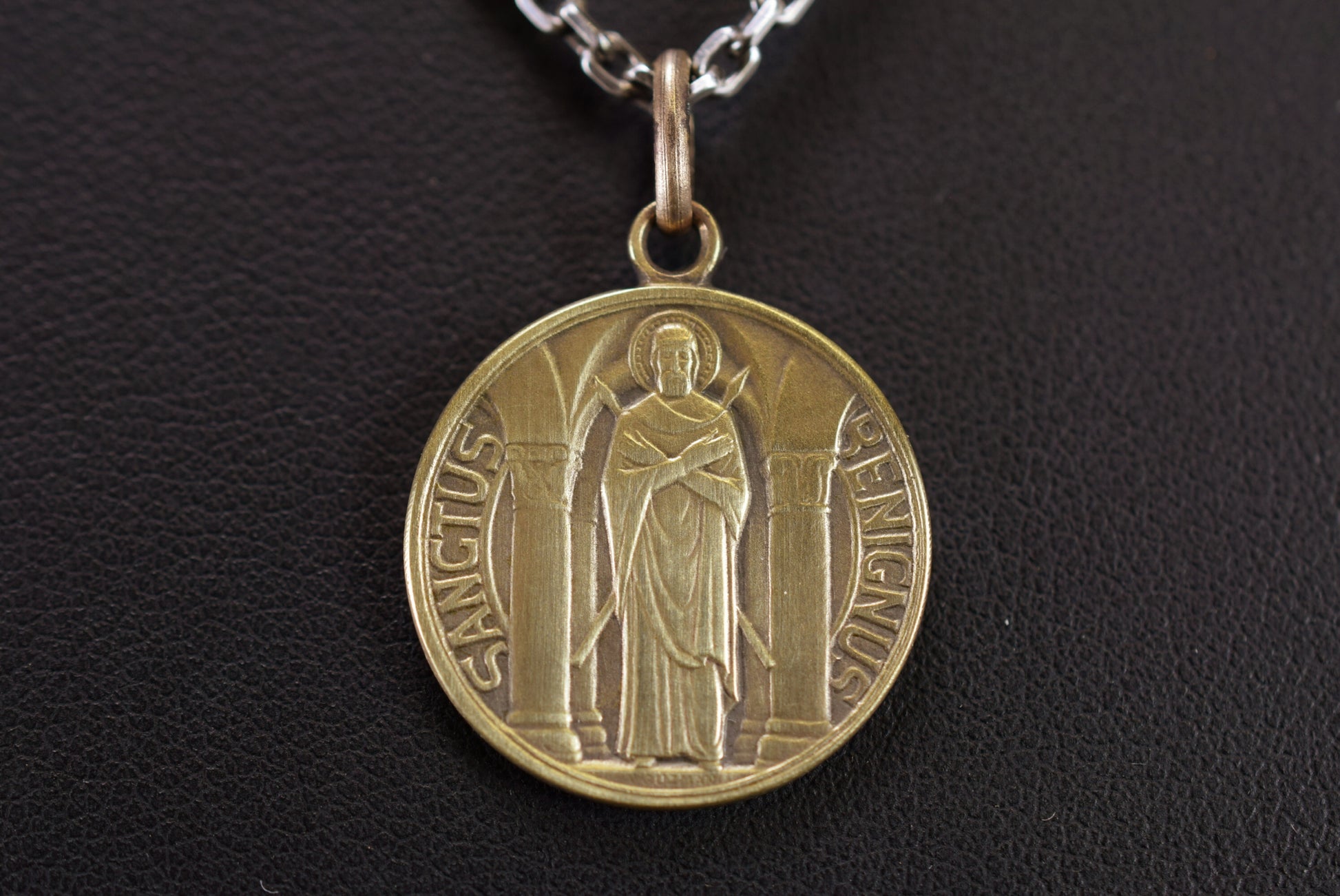 Belle médaille religieuse française vintage signée par l'artiste graveur A.Guzman. Le pendentif représente Sanctus Benignus - Saint Benigne. Saint Bénigne de Dijon est un saint catholique réputé avoir subi le martyre à Dijon vers l'an 179. Les légendes bourguignonnes faisaient de lui l'apôtre de Bourgogne, et un disciple de saint Polycarpe de Smyrne.