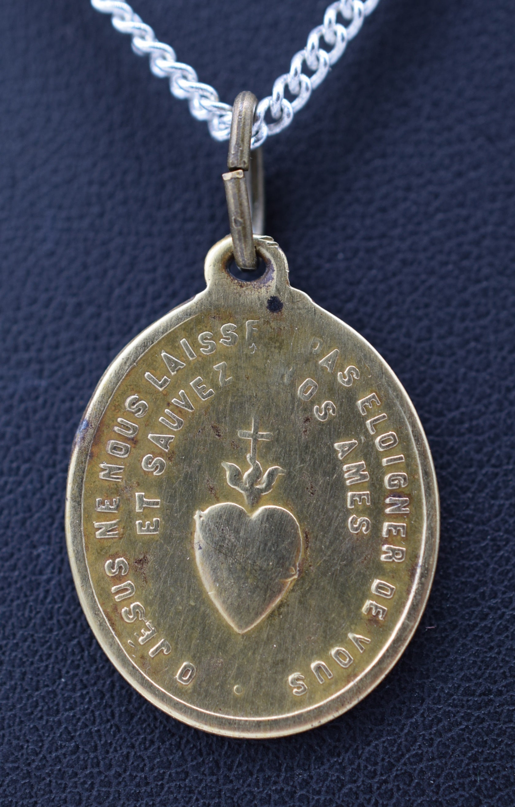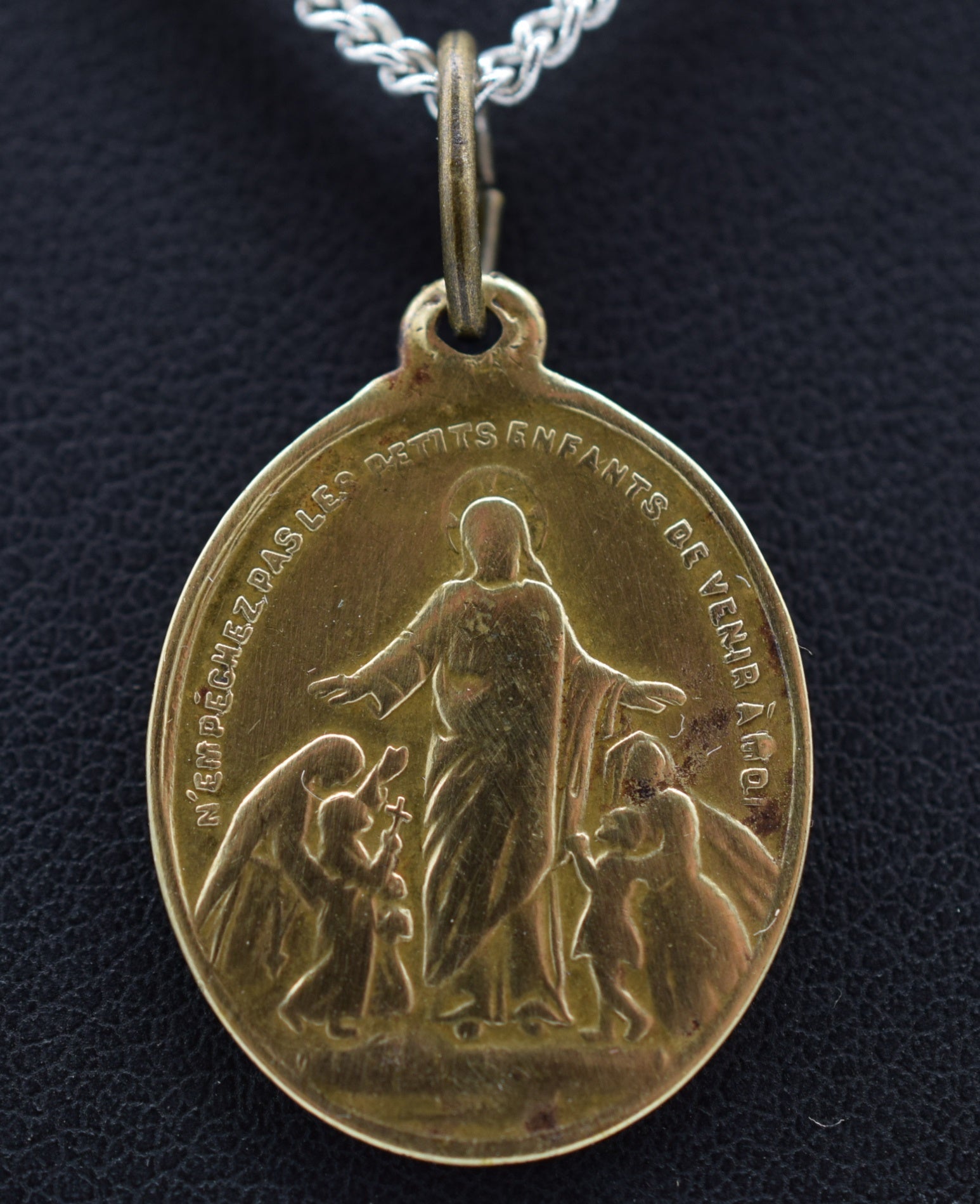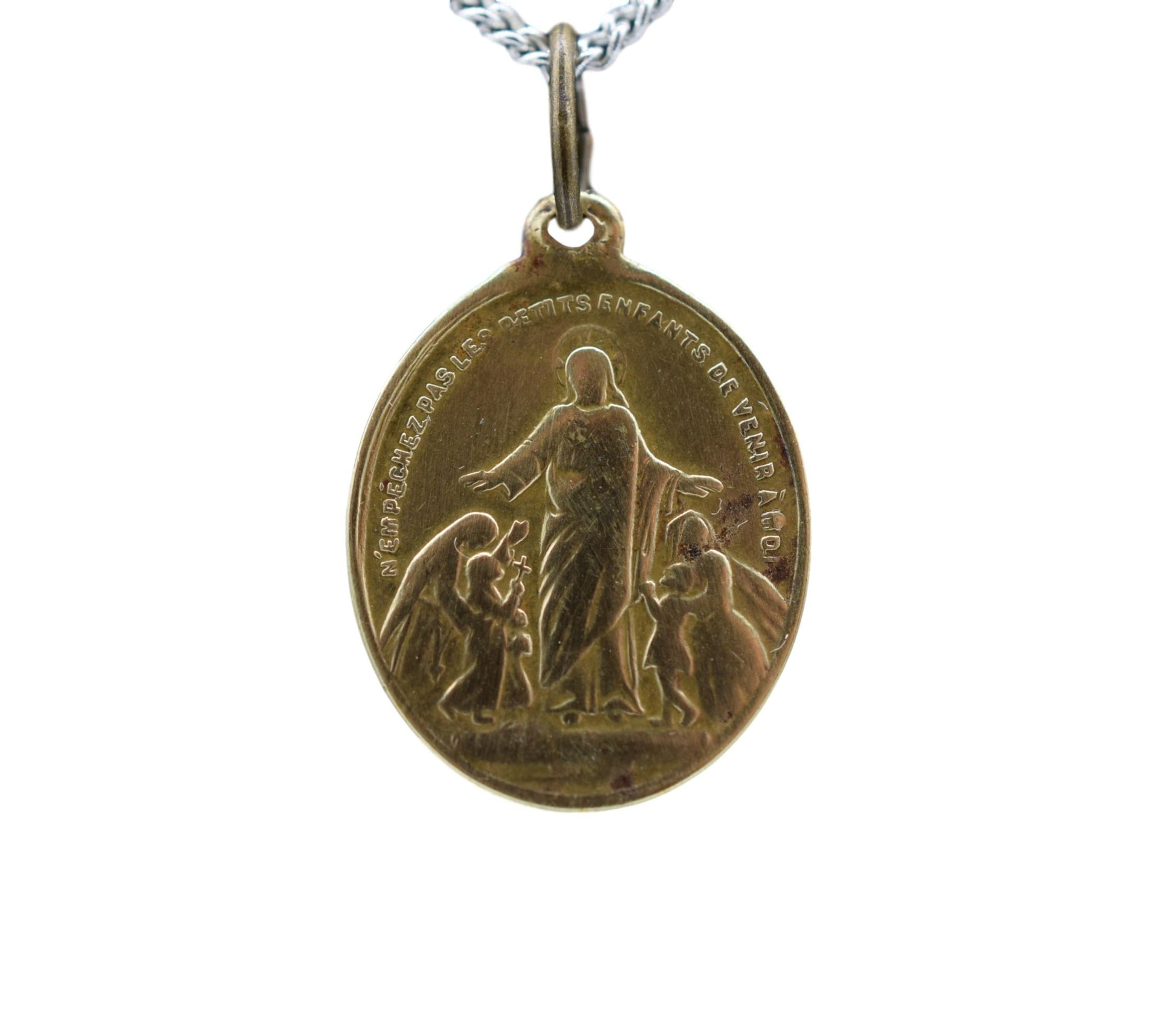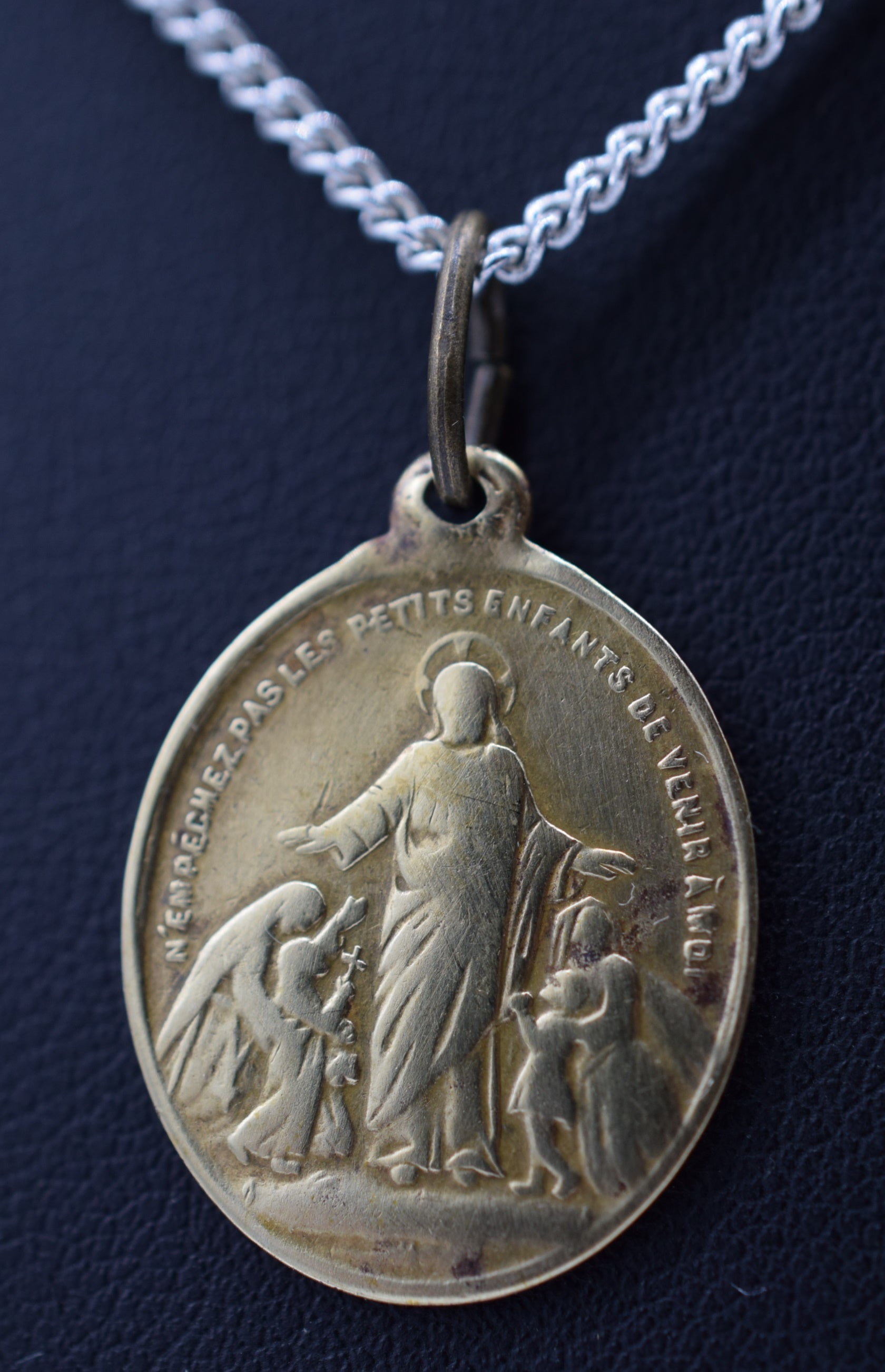 Une médaille religieuse française antique et authentique. Il représente finement Matthieu Évangile 19 : 14 « Jésus dit : « Laissez les petits enfants venir à moi ». Le revers représente Jésus Sacré-Cœur entouré des mots :