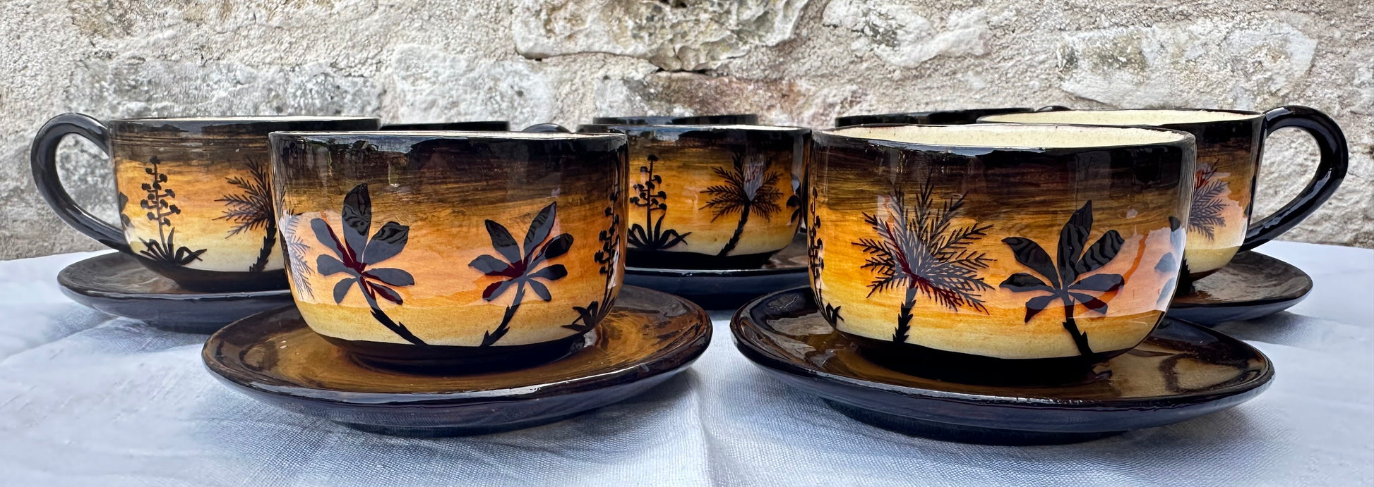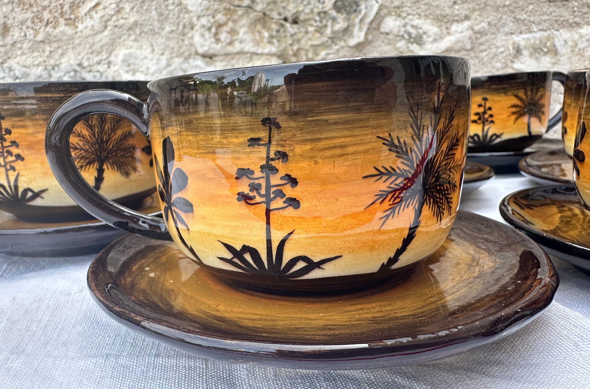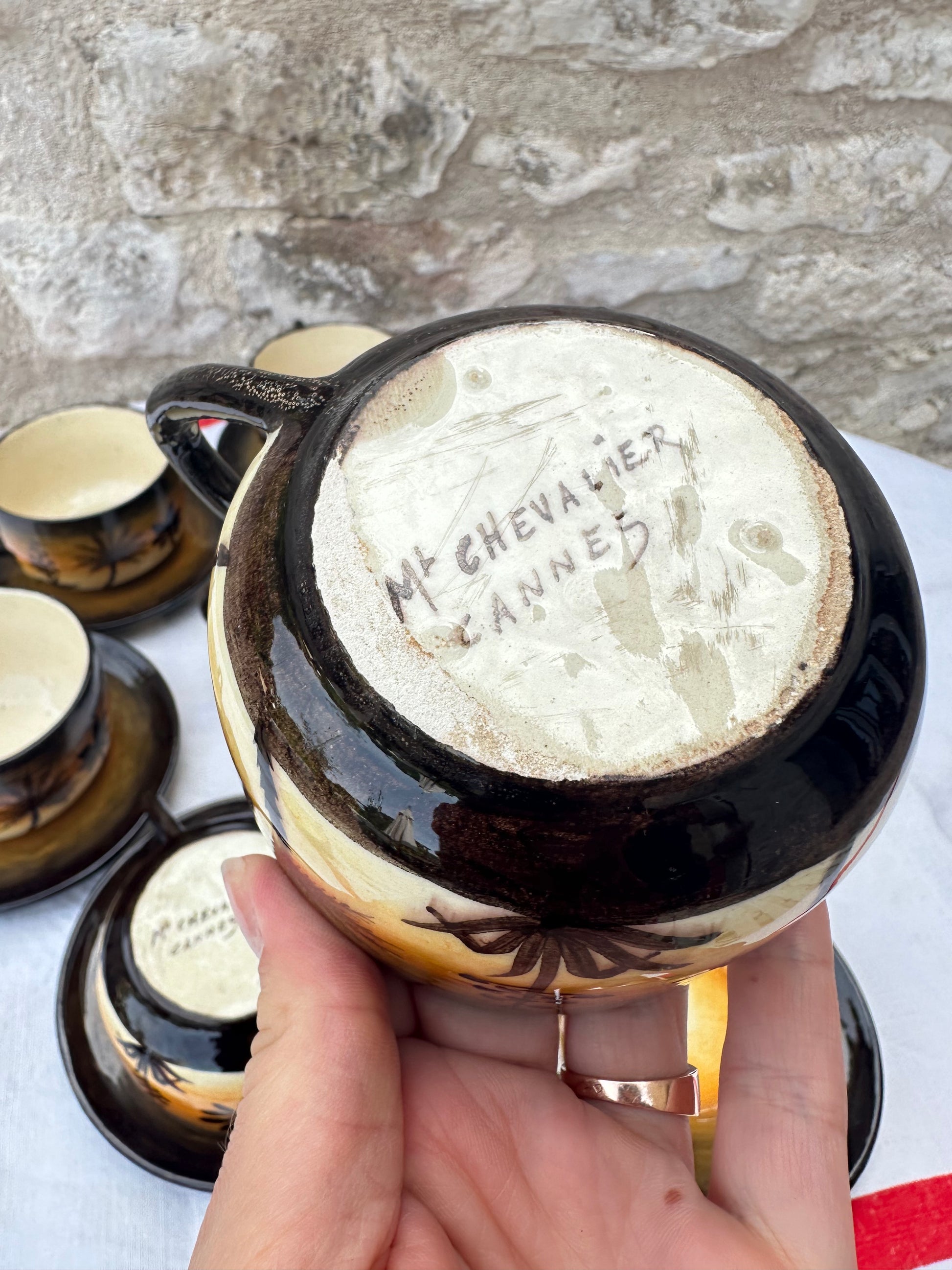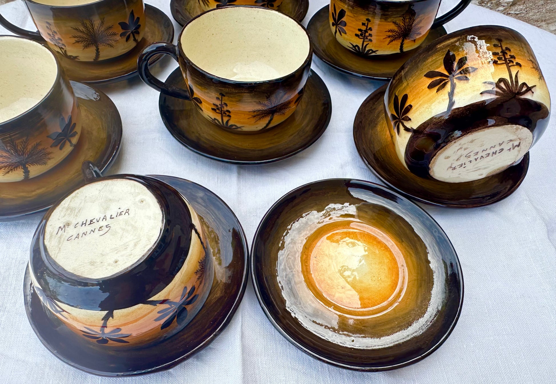An incredible antique set of eight cups and saucers dating to the 1920's. The glazed ceramic pieces have been made by "Mont Chevalier" in Cannes. The pottery manufacture of Cannes works from 1878 to 1931. It was originally housed at Le Suquet in the former Château de Cannes and occupied a large part of the present-day Musée de la Castre.
