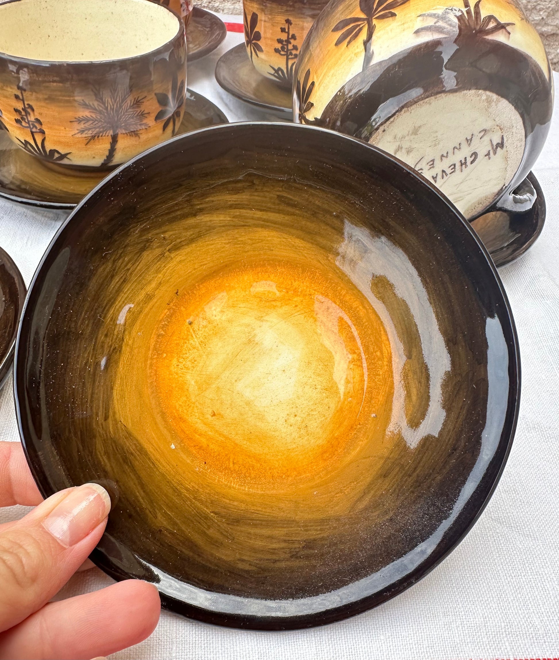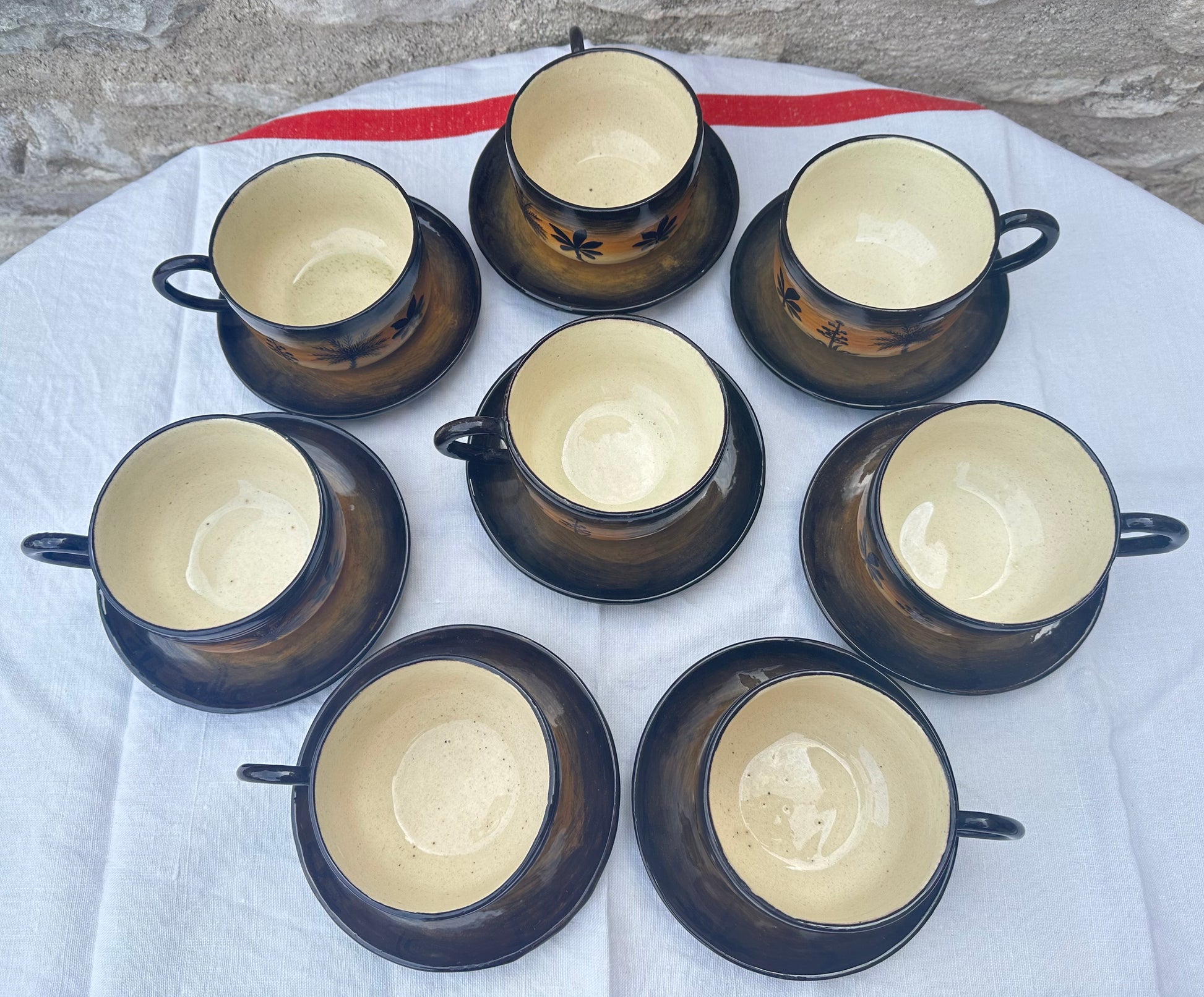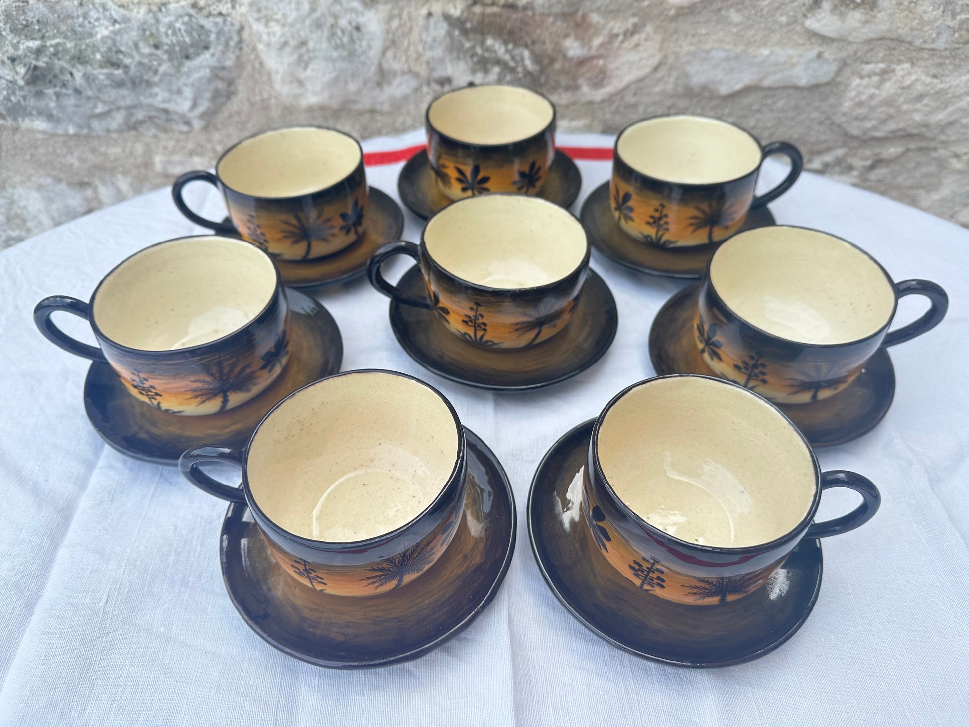 An incredible antique set of eight cups and saucers dating to the 1920's. The glazed ceramic pieces have been made by "Mont Chevalier" in Cannes. The pottery manufacture of Cannes works from 1878 to 1931. It was originally housed at Le Suquet in the former Château de Cannes and occupied a large part of the present-day Musée de la Castre.
