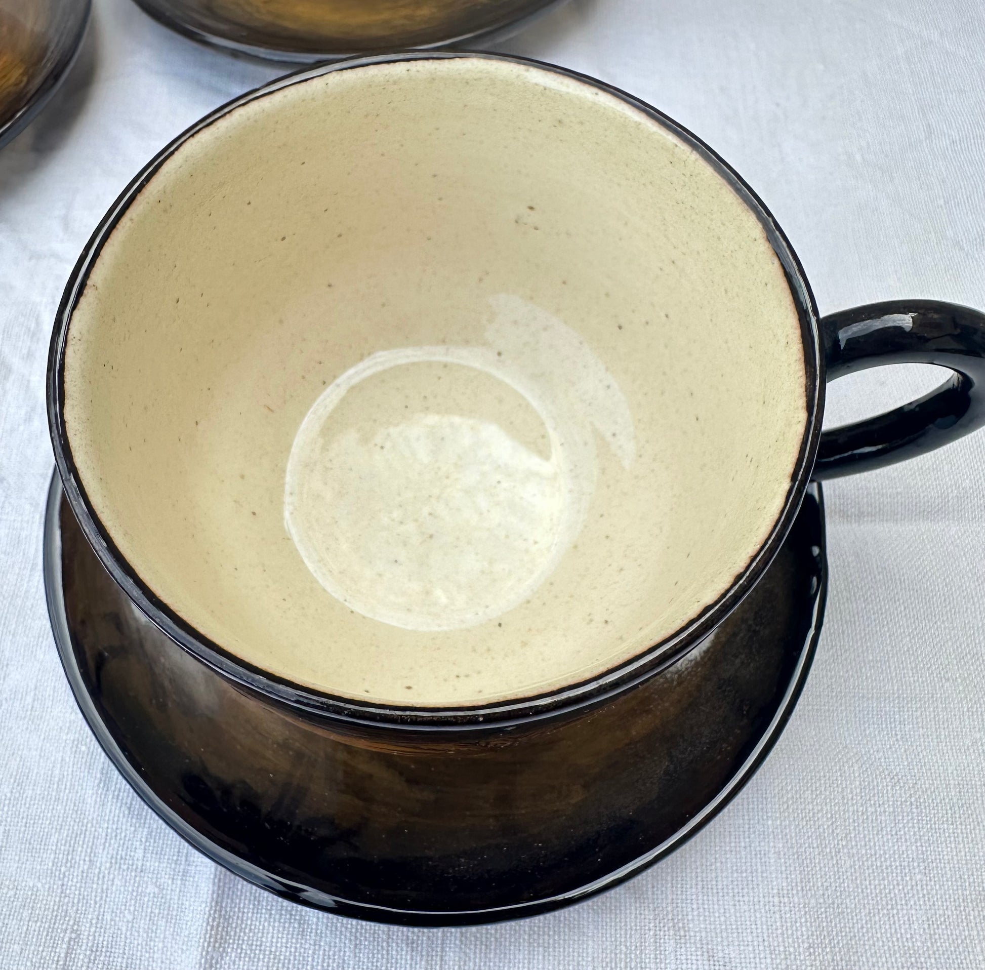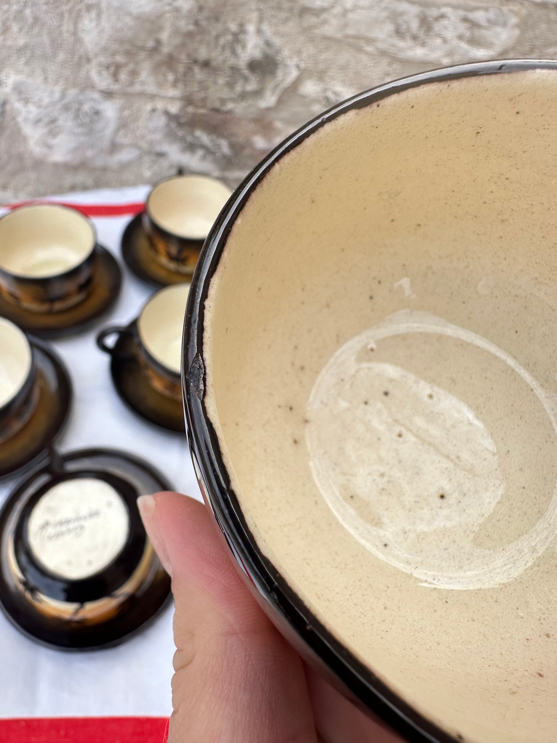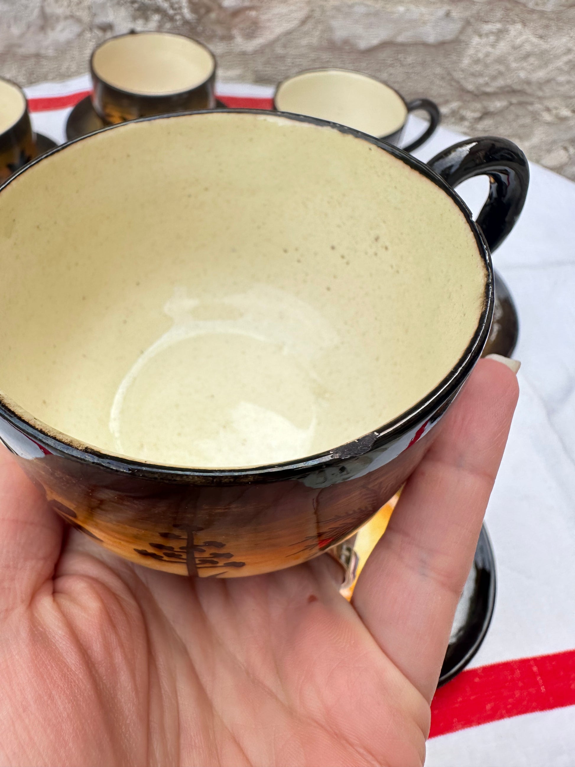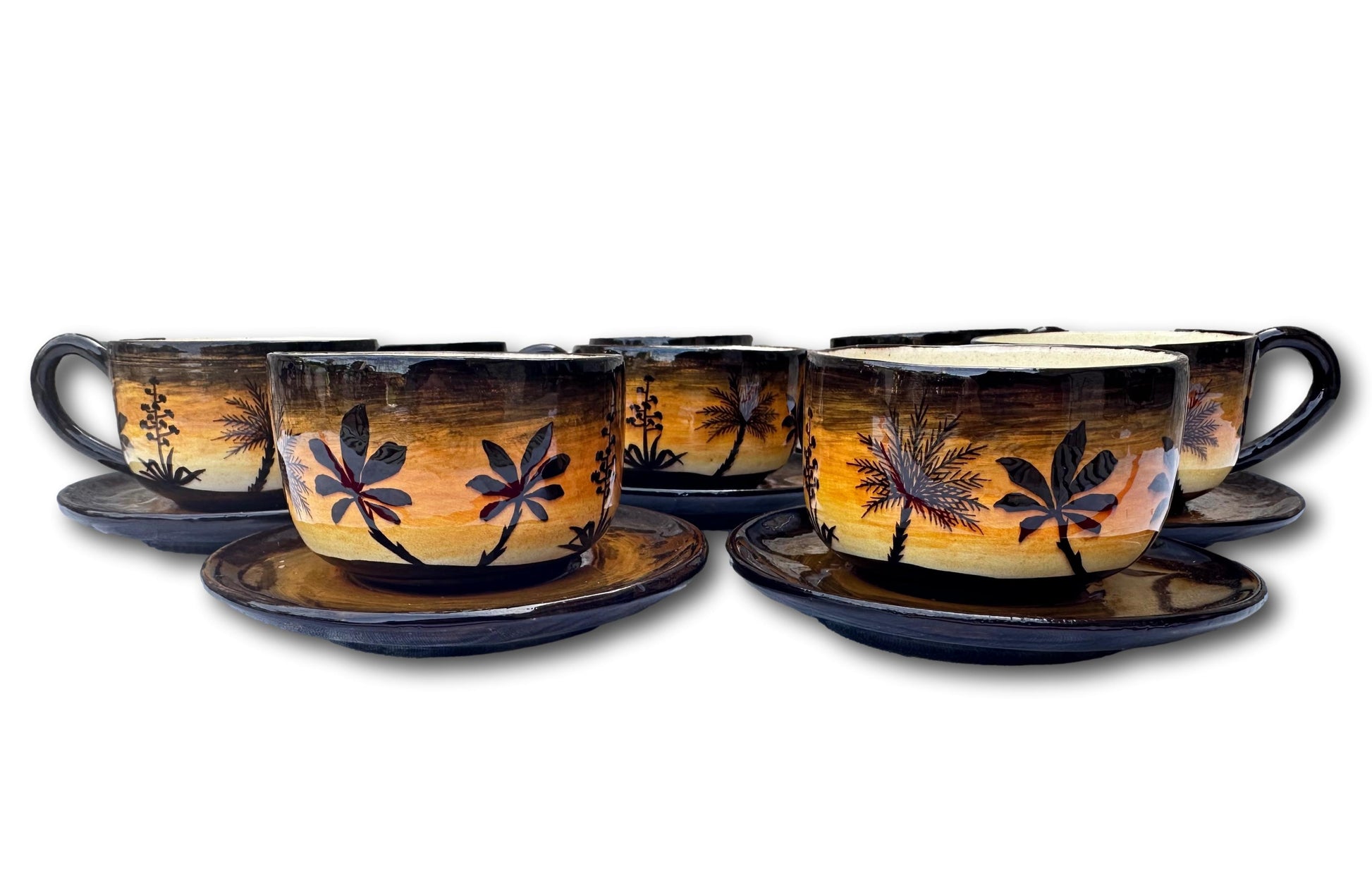 An incredible antique set of eight cups and saucers dating to the 1920's. The glazed ceramic pieces have been made by "Mont Chevalier" in Cannes. The pottery manufacture of Cannes works from 1878 to 1931. It was originally housed at Le Suquet in the former Château de Cannes and occupied a large part of the present-day Musée de la Castre.