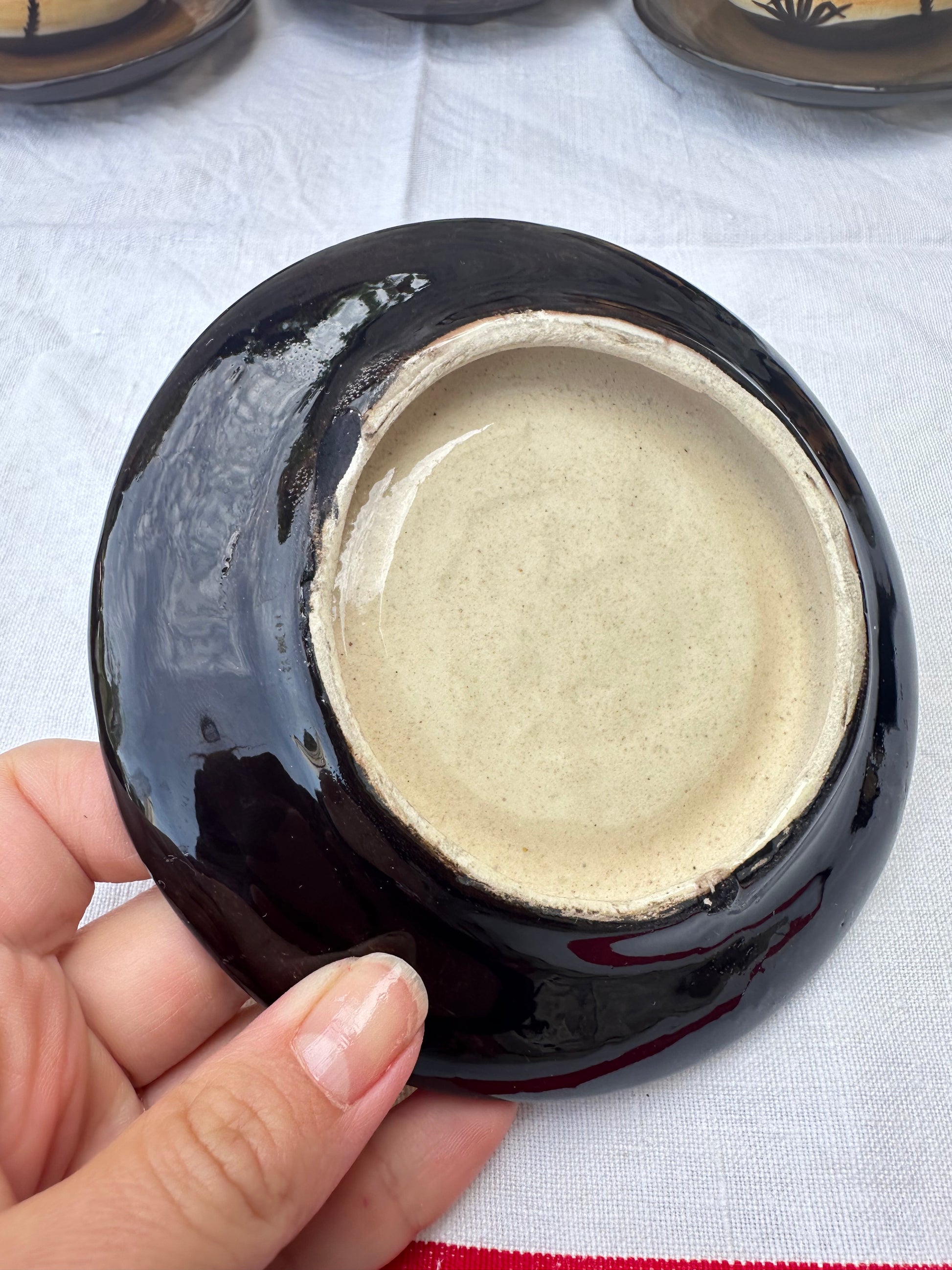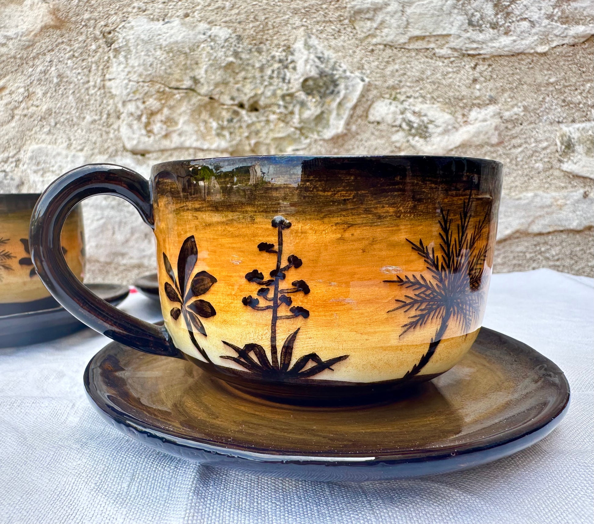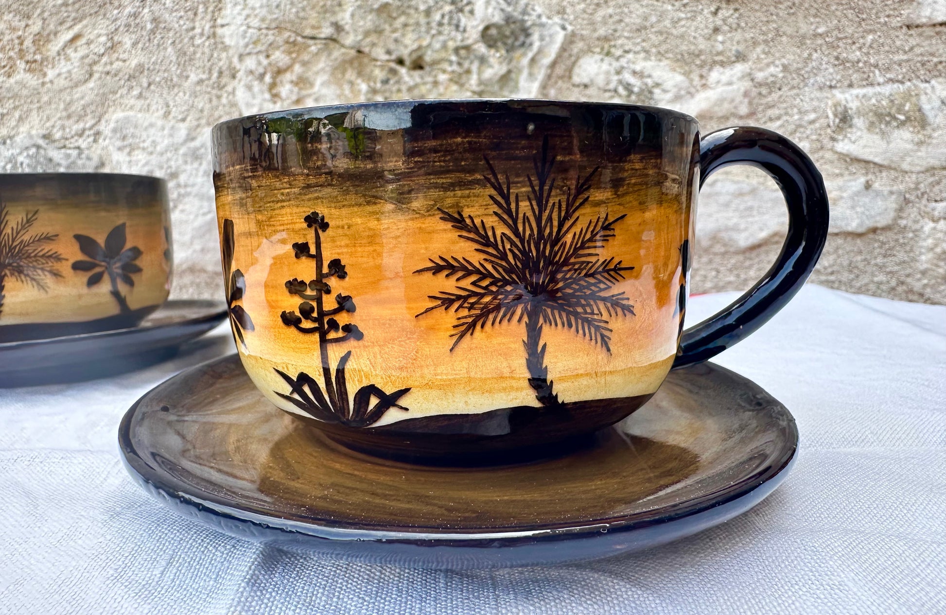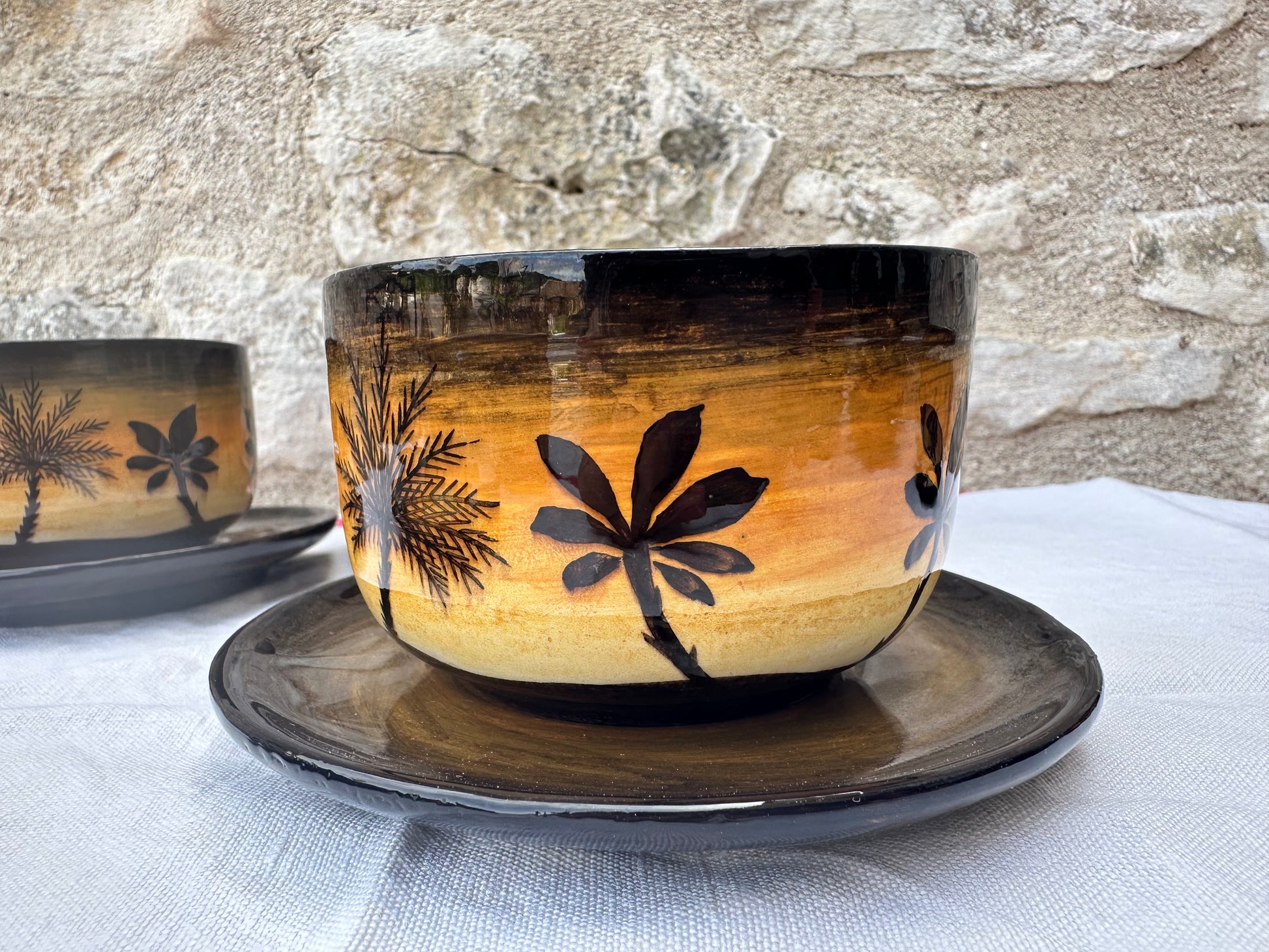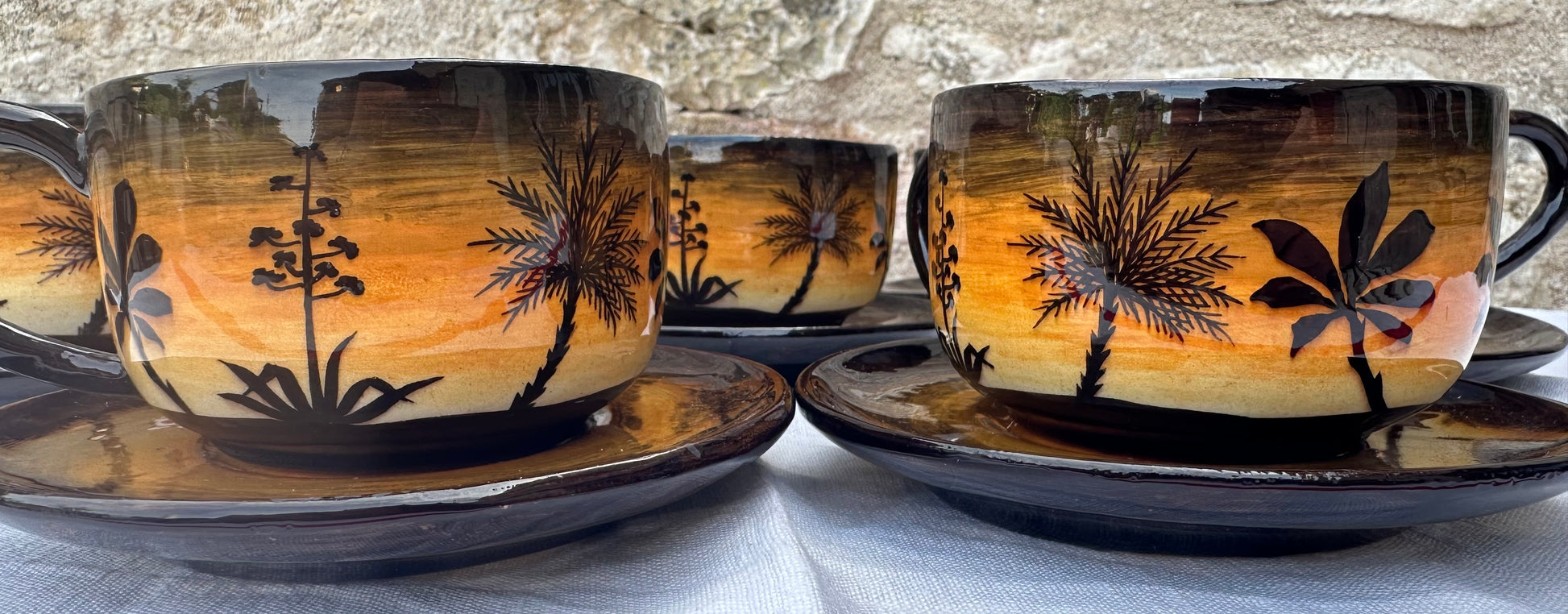 This 100-year-old set of cups and saucers has not aged a day. Its black palm trees and aloe vera design against a luminous orange sunset background will take you on a trip to Cannes, by the Mediterranean sea, near the Promenade des Anglais.