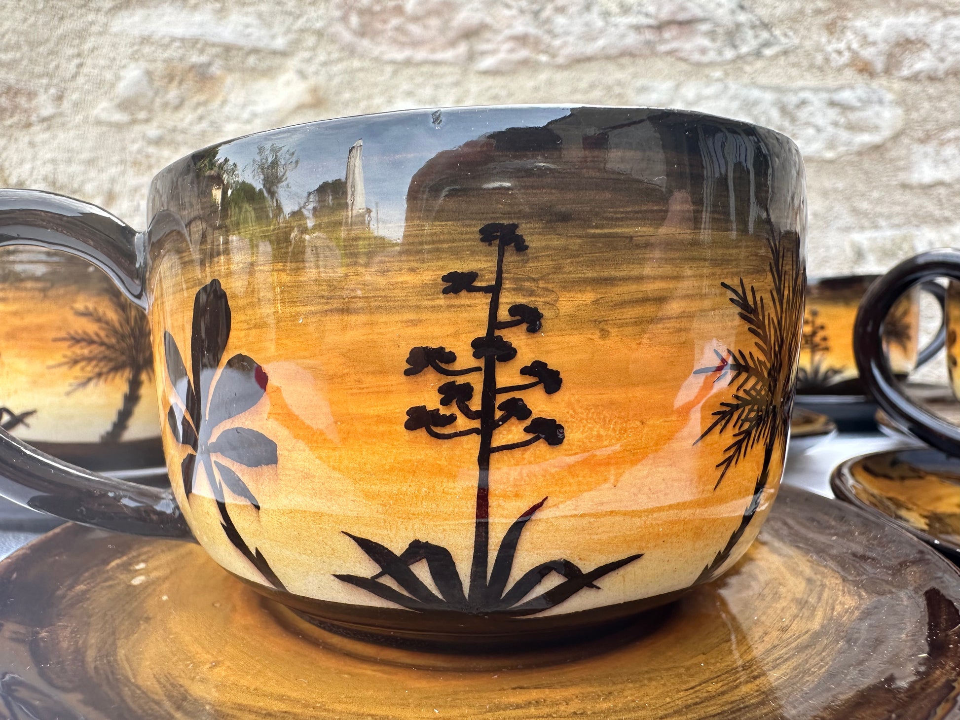 INCREDIBLE Set of 8 Cup and Saucer, 1920's Mont Chevalier Cannes Majolica Cups, French Riviera Art