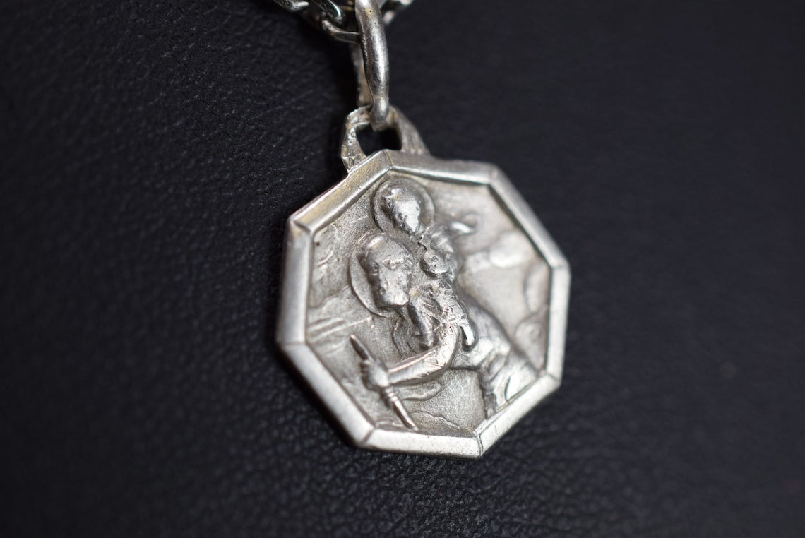 Une belle médaille antique française en argent serling, des années 1940. Le petit pendentif représente finement Saint Christophe, saint patron des conducteurs et des voyageurs.