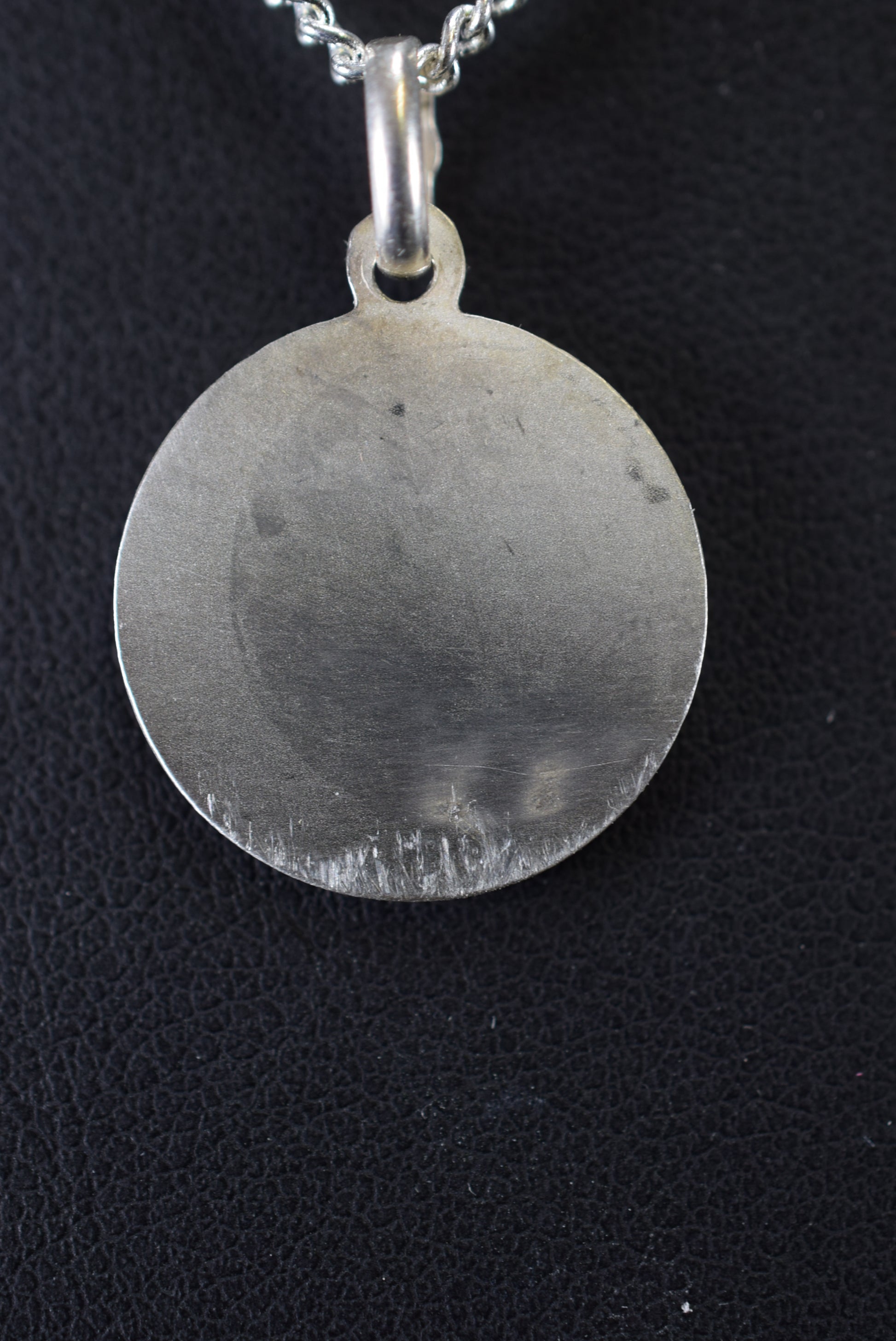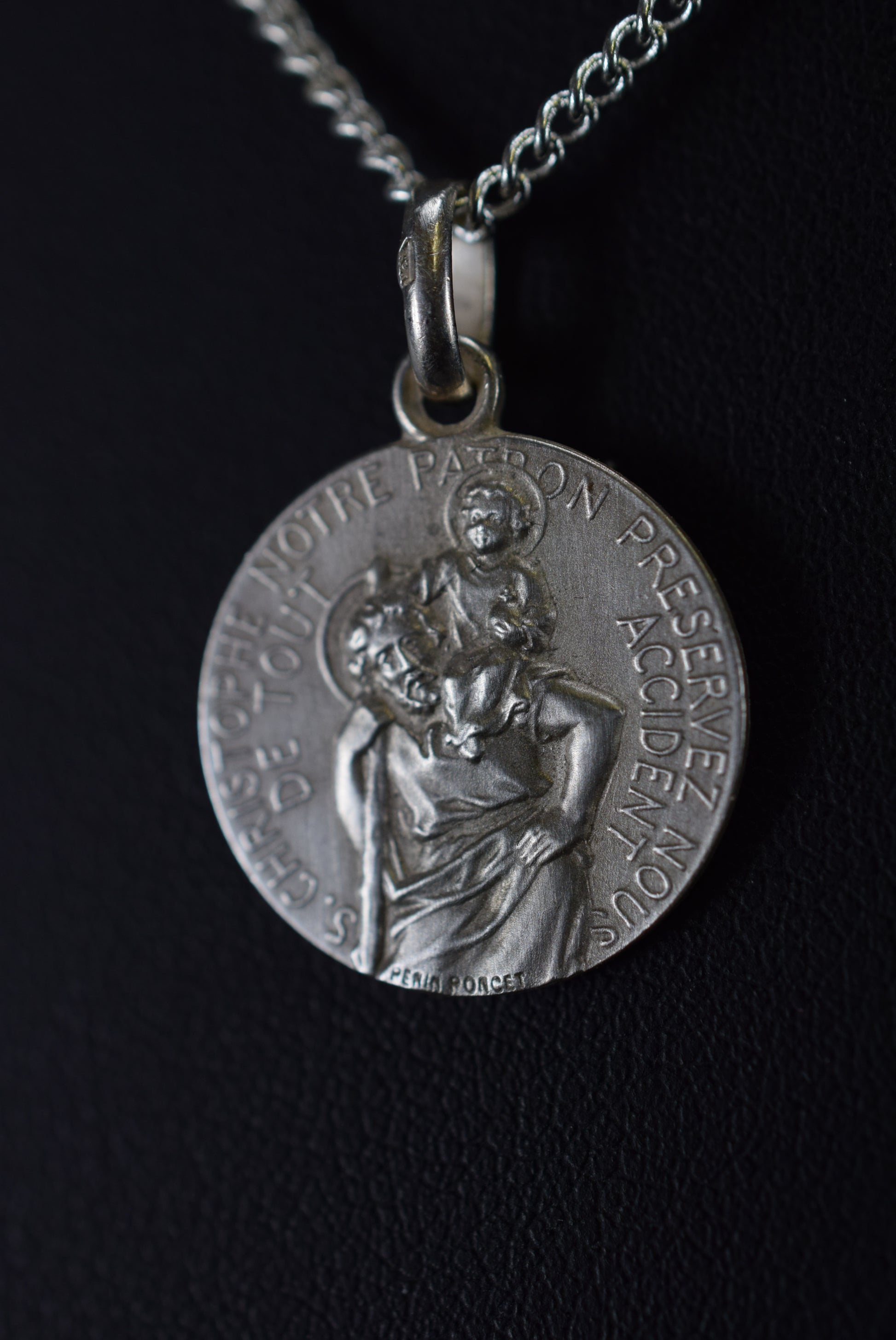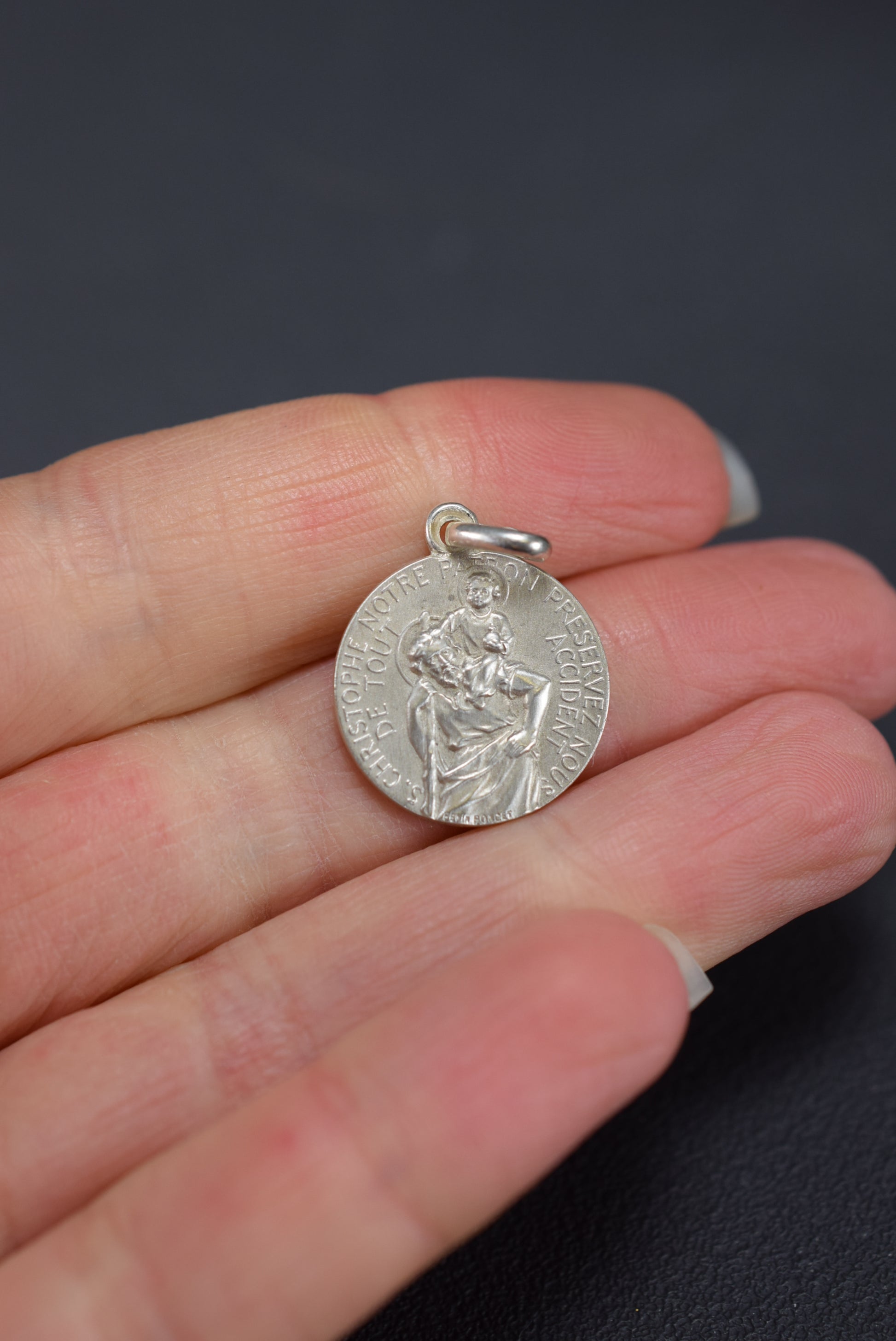 Une belle médaille antique française en laiton argenté, datant des années 1940. Le pendentif représente finement Saint Christophe, saint patron des conducteurs et des voyageurs. Le pendentif est une protection contre les accidents. Il a été réalisé par Penin Poncet à Lyon.