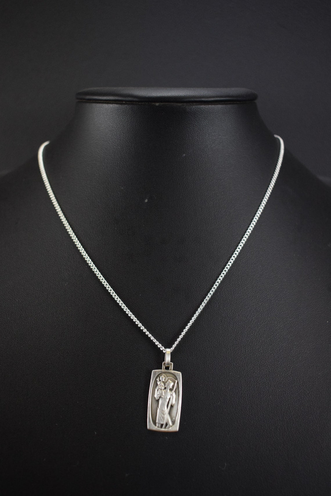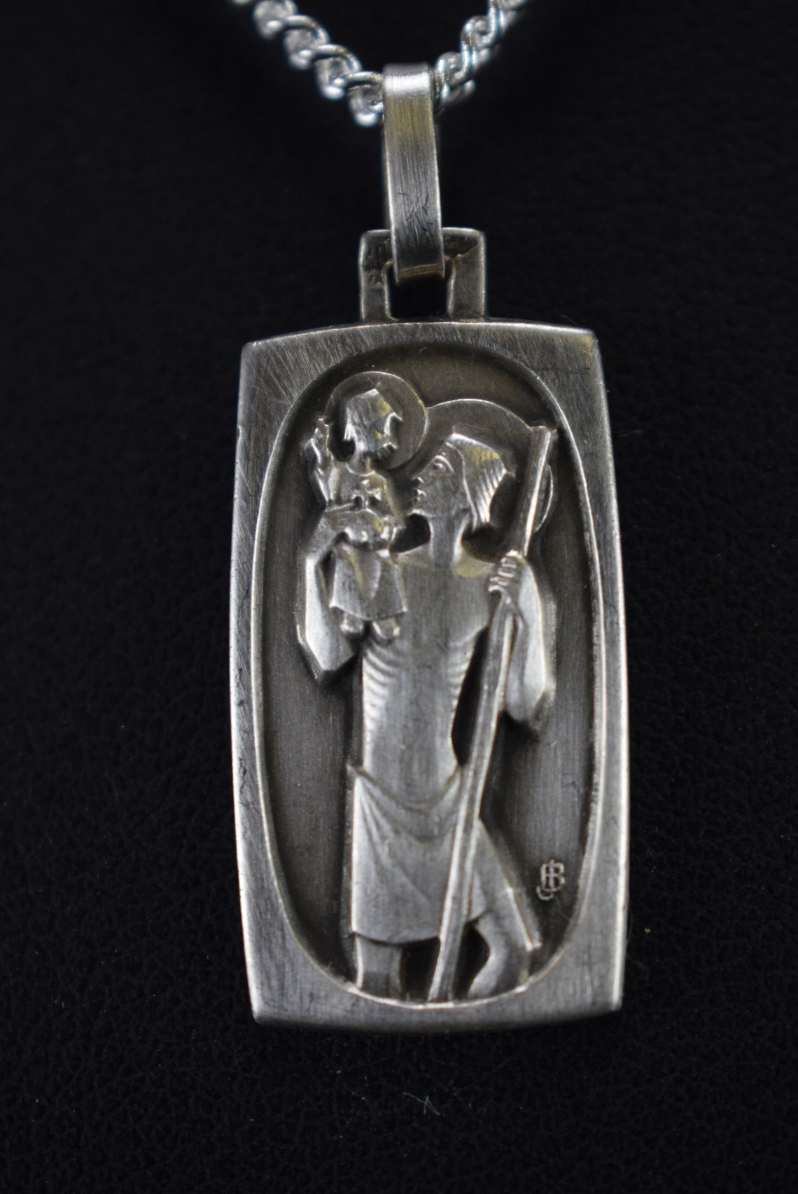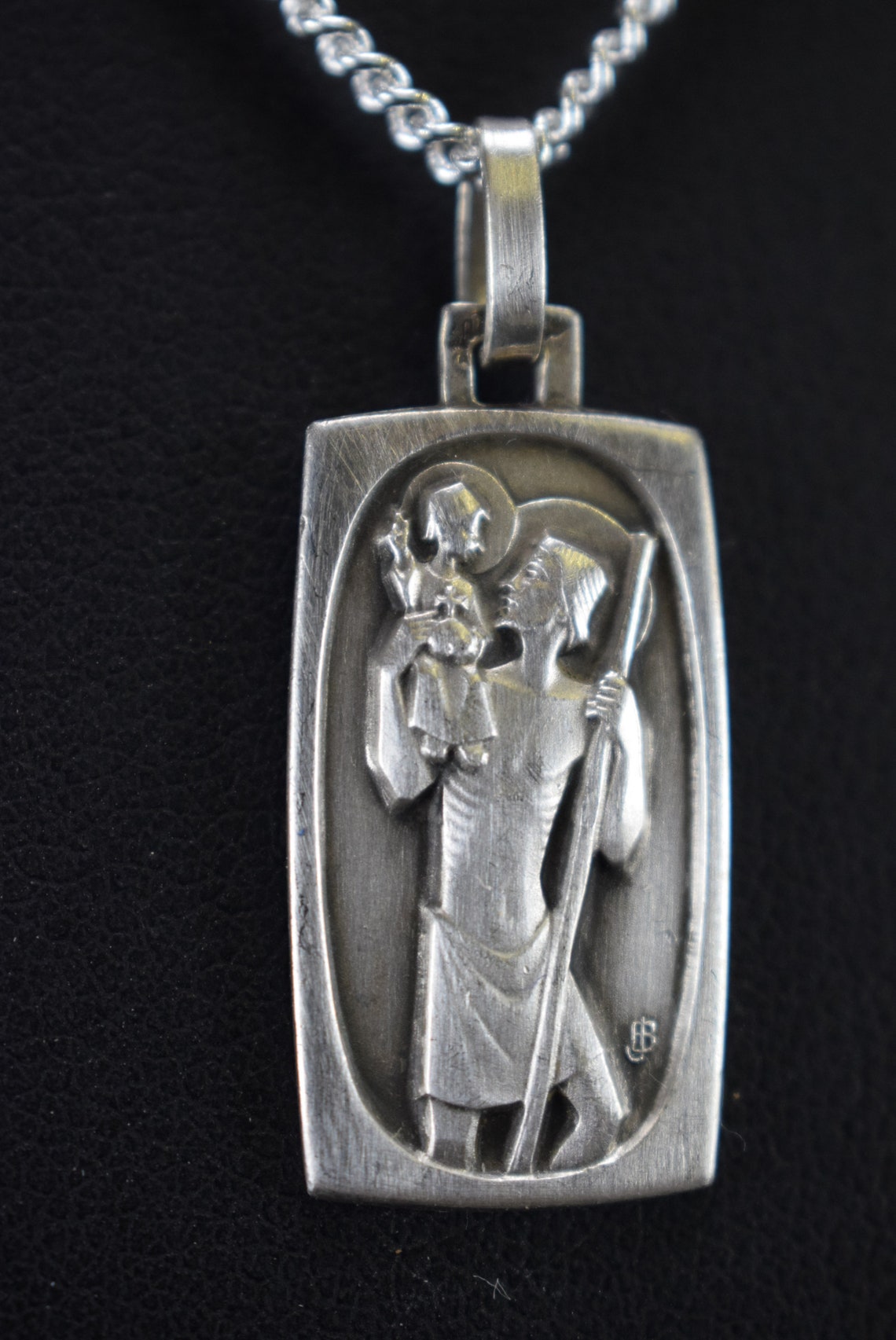 Belle médaille française en laiton argenté. Le pendentif de style moderniste représente avec finesse Saint Christophe, saint patron des conducteurs et des voyageurs.