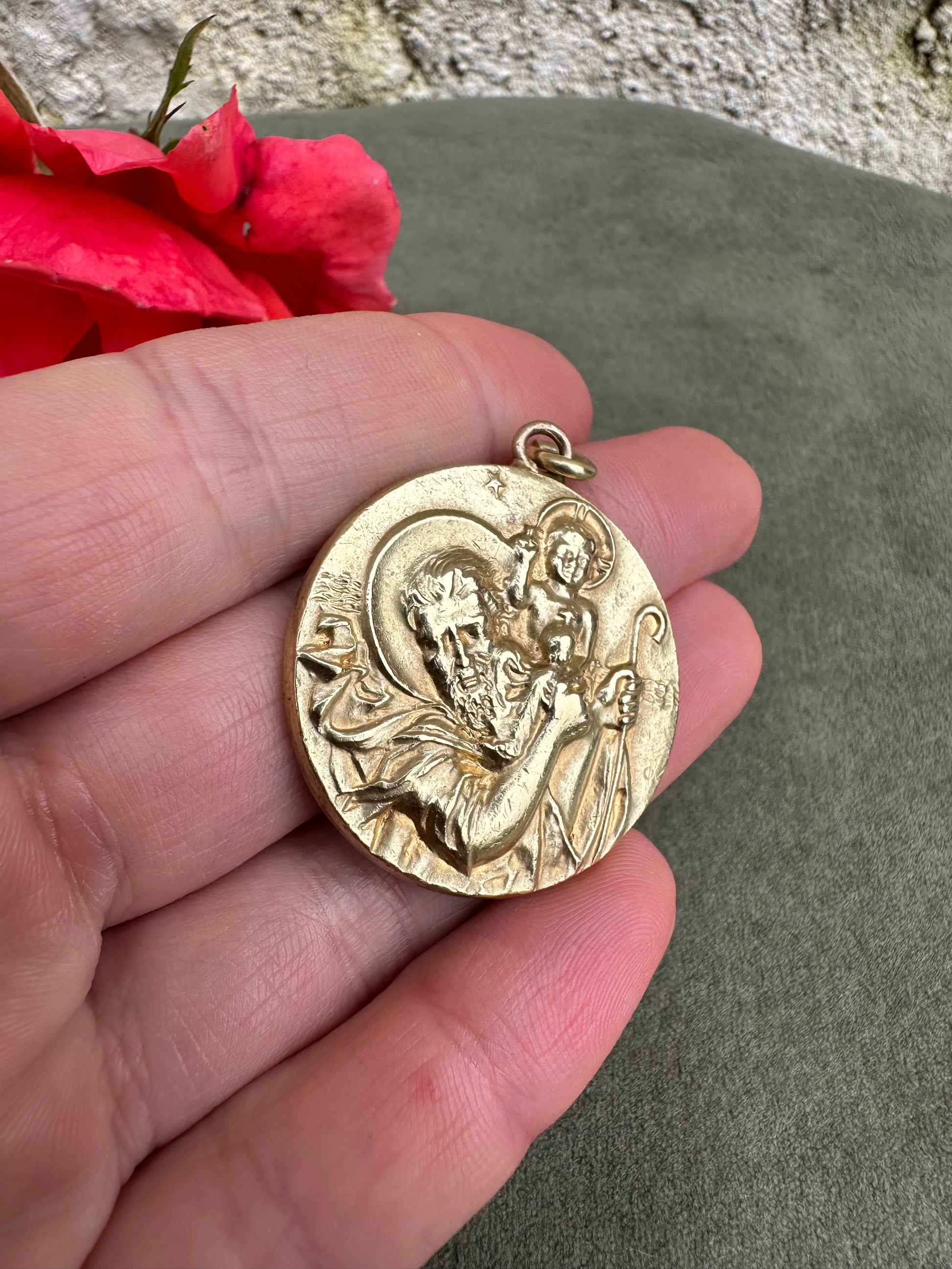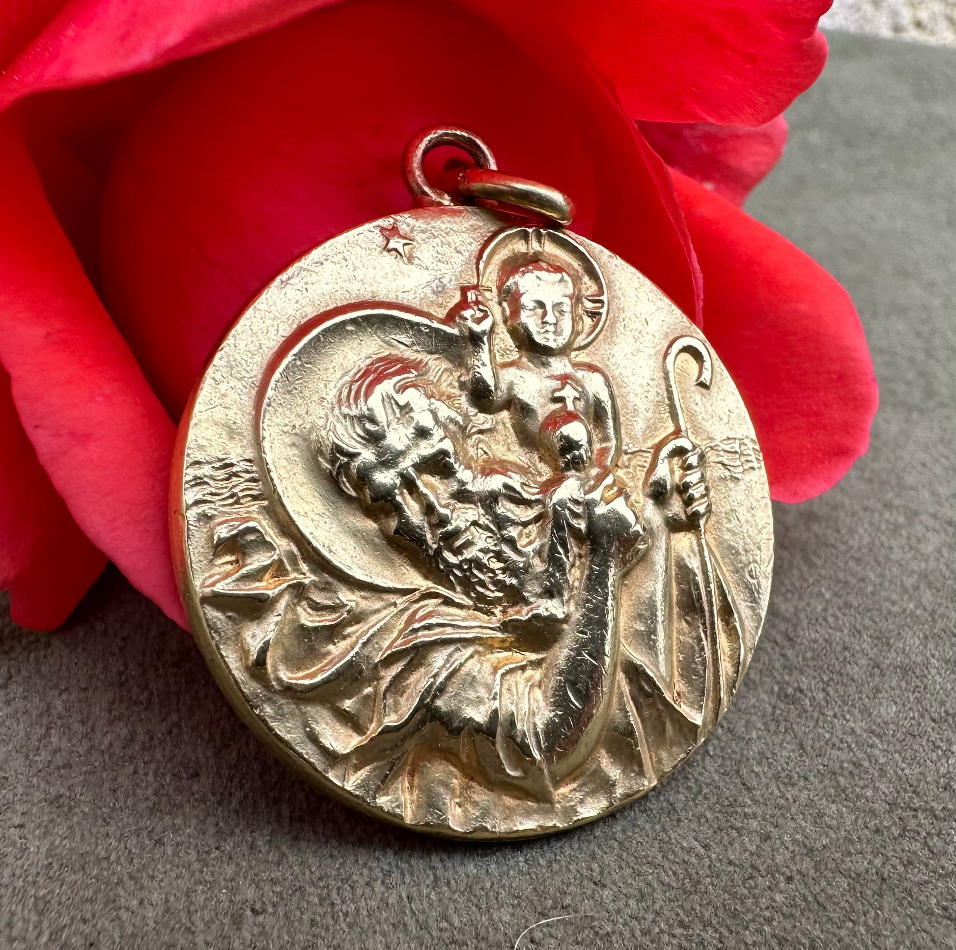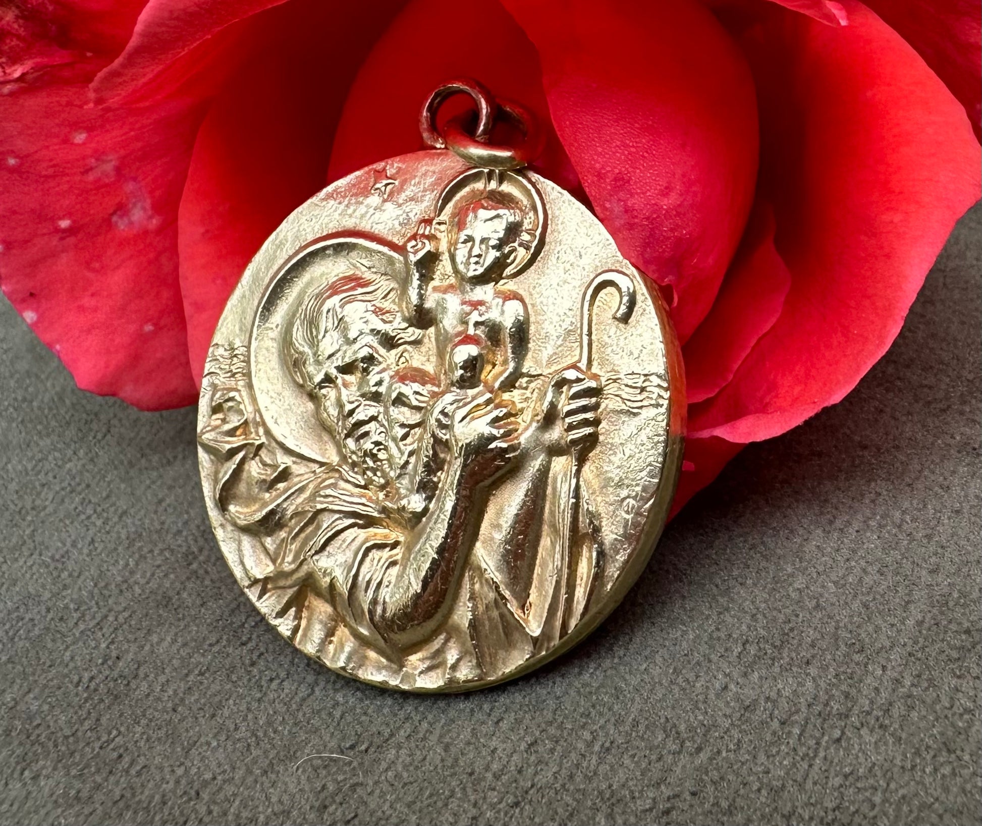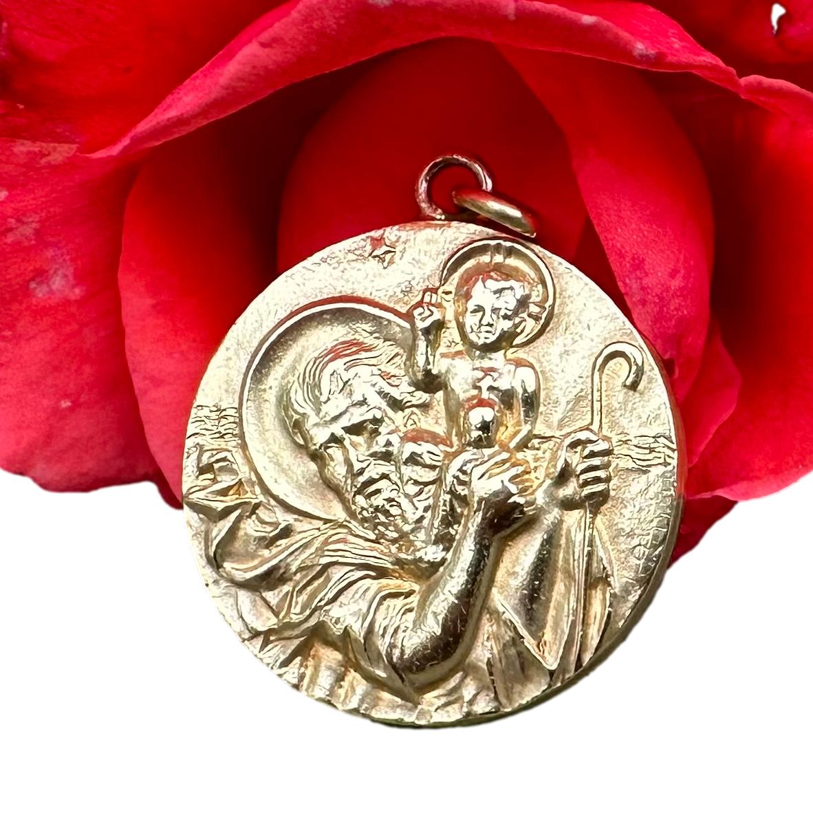 This is a beautiful vintage French medal from the 1960s, featuring a finely detailed depiction of Saint Christopher carrying the Christ Child on his shoulder, symbolizing protection and guidance. The medal is crafted from gold-plated metal, exhibiting a radiant, shiny patina that enhances its intricate design and gives it an elegant, time-worn character. Measuring a substantial 1 1/4 inches in diameter, the piece showcases Saint Christopher’s strong, protective stance and the serene expression of young Jesus, capturing both figures in a moment of grace and strength. The artwork is refined, with delicate lines and textures bringing each feature to life, a hallmark of mid-century French craftsmanship. This medal serves both as a devotional item and as a striking example of vintage religious artistry.