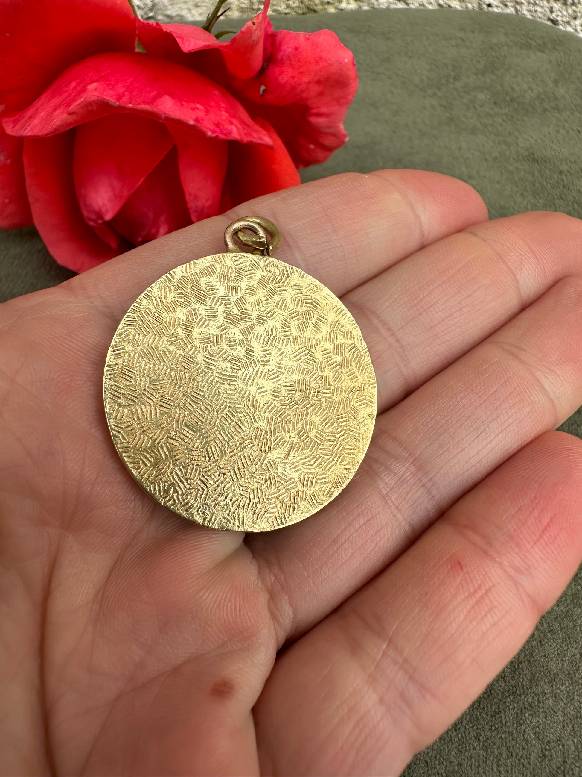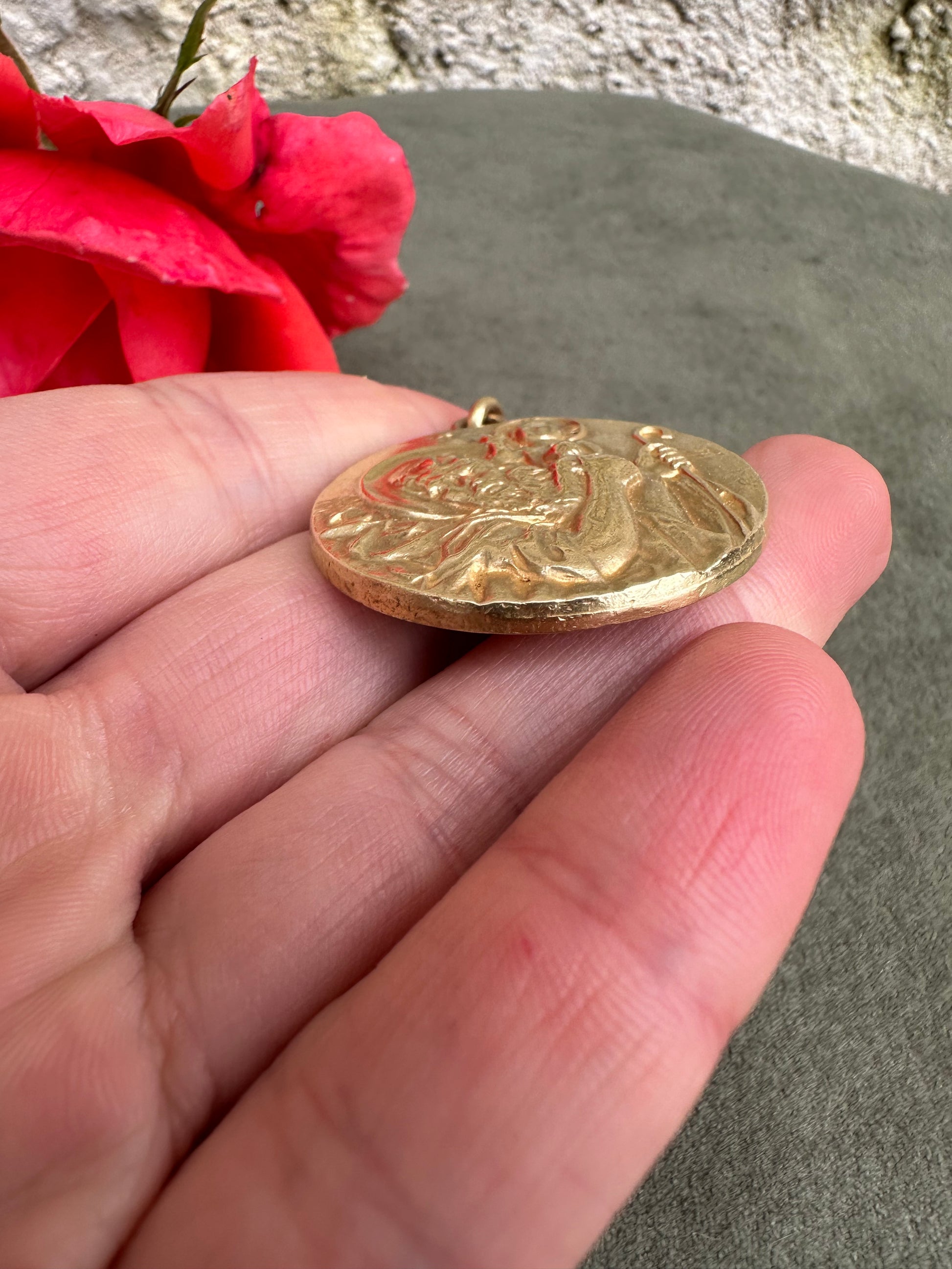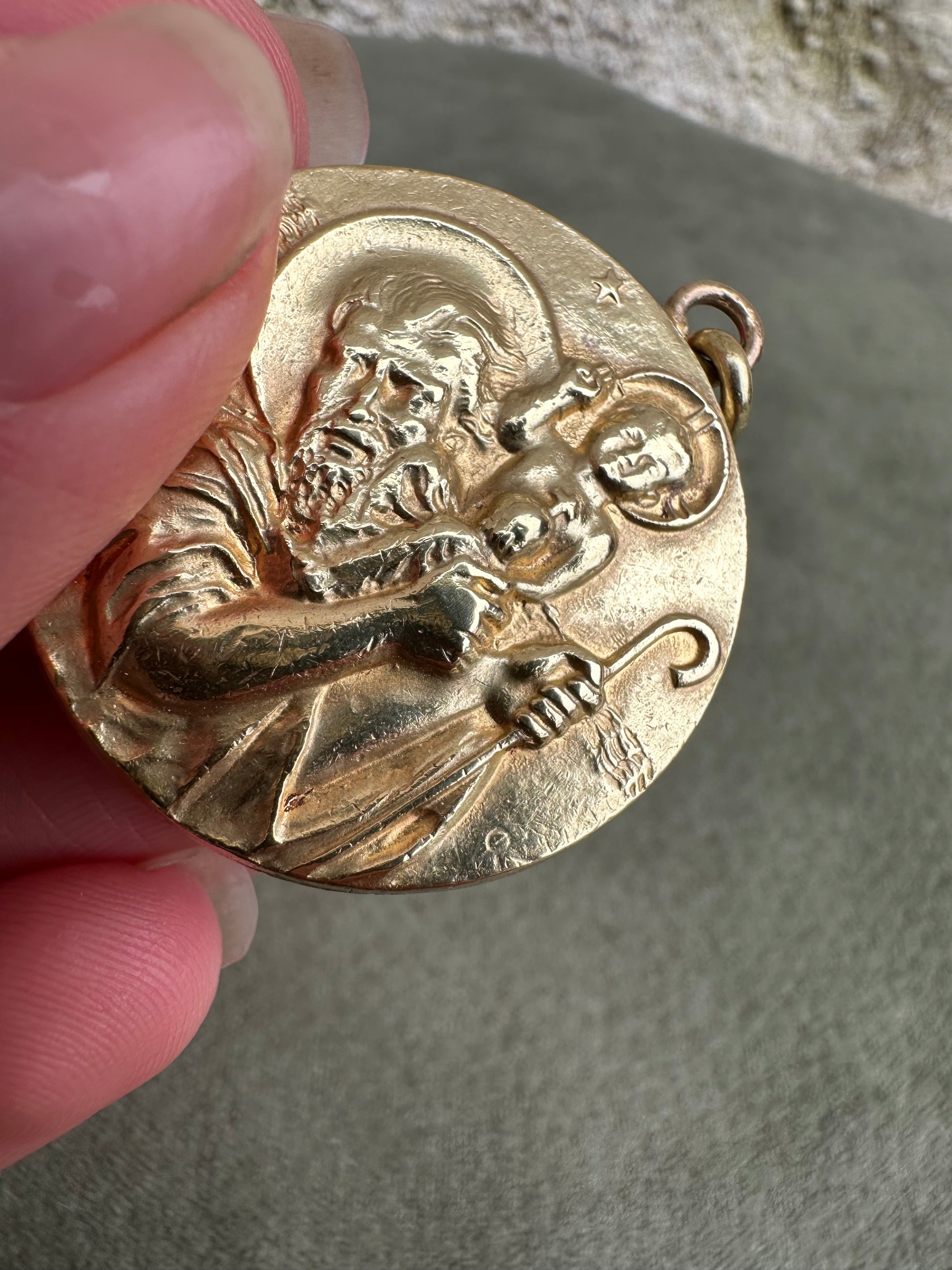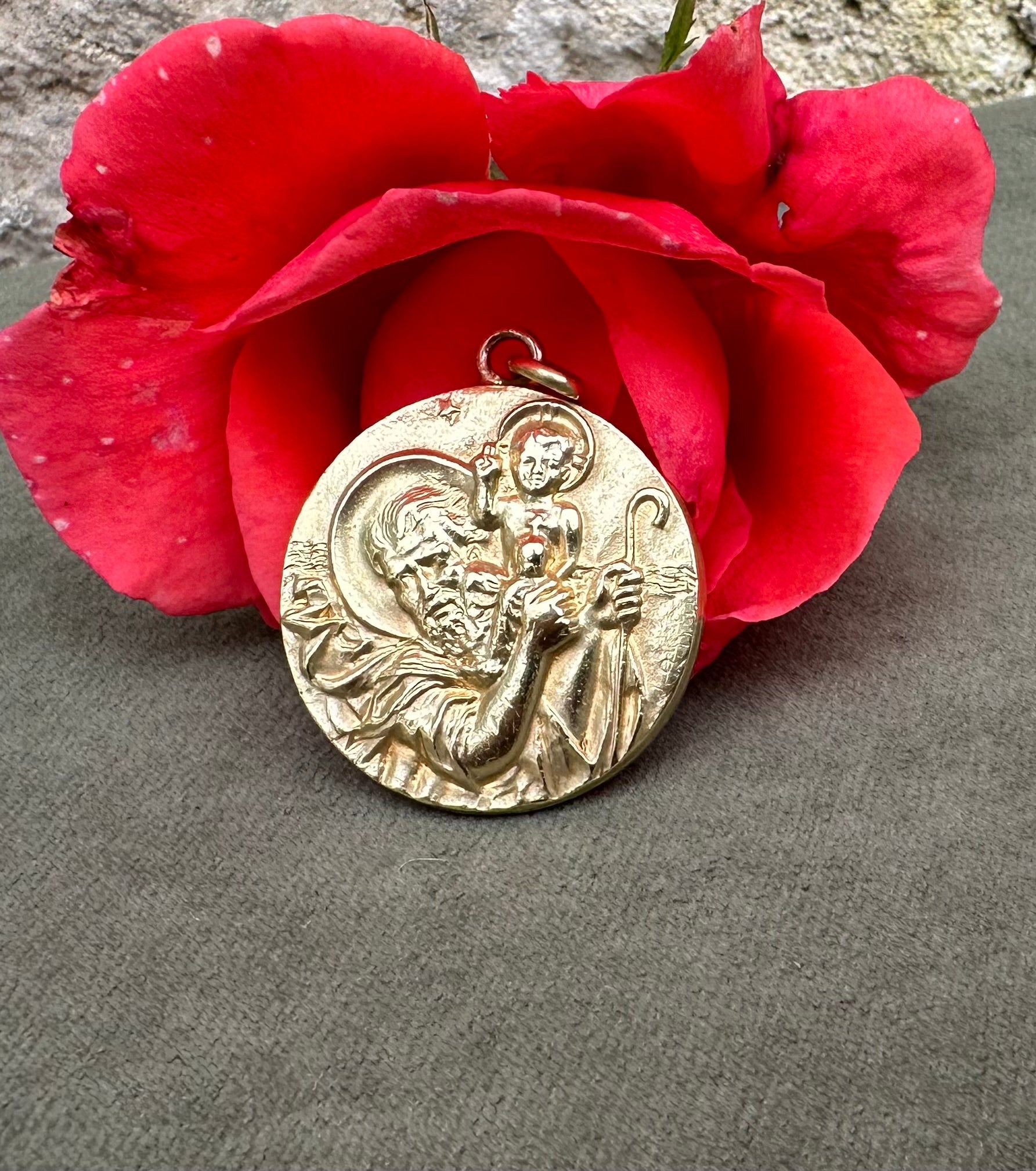 This is a beautiful vintage French medal from the 1960s, featuring a finely detailed depiction of Saint Christopher carrying the Christ Child on his shoulder, symbolizing protection and guidance. The medal is crafted from gold-plated metal, exhibiting a radiant, shiny patina that enhances its intricate design and gives it an elegant, time-worn character. Measuring a substantial 1 1/4 inches in diameter, the piece showcases Saint Christopher’s strong, protective stance and the serene expression of young Jesus, capturing both figures in a moment of grace and strength. The artwork is refined, with delicate lines and textures bringing each feature to life, a hallmark of mid-century French craftsmanship. This medal serves both as a devotional item and as a striking example of vintage religious artistry.