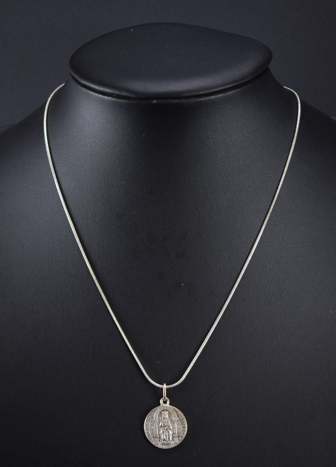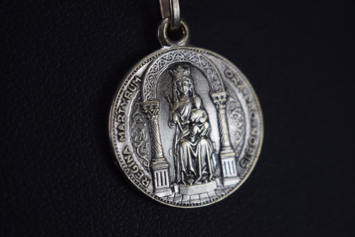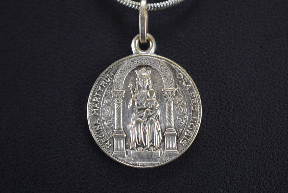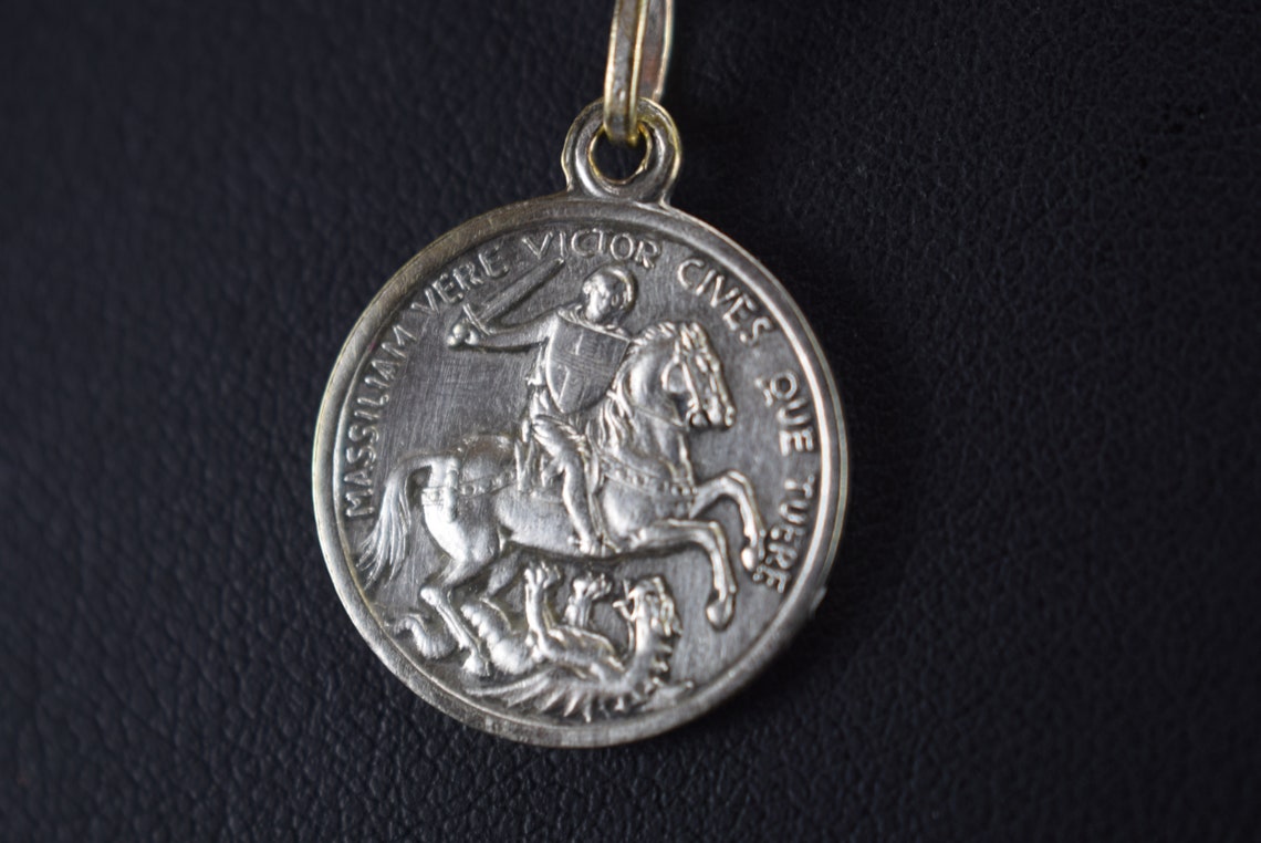 Une belle médaille religieuse antique française en métal argenté. Le pendentif catholique représente Saint Georges et le dragon, saint patron du marin. Au revers, il représente Notre-Dame Vierge Marie, Regina Martyrum (qui signifie Reine des Martyrs).
