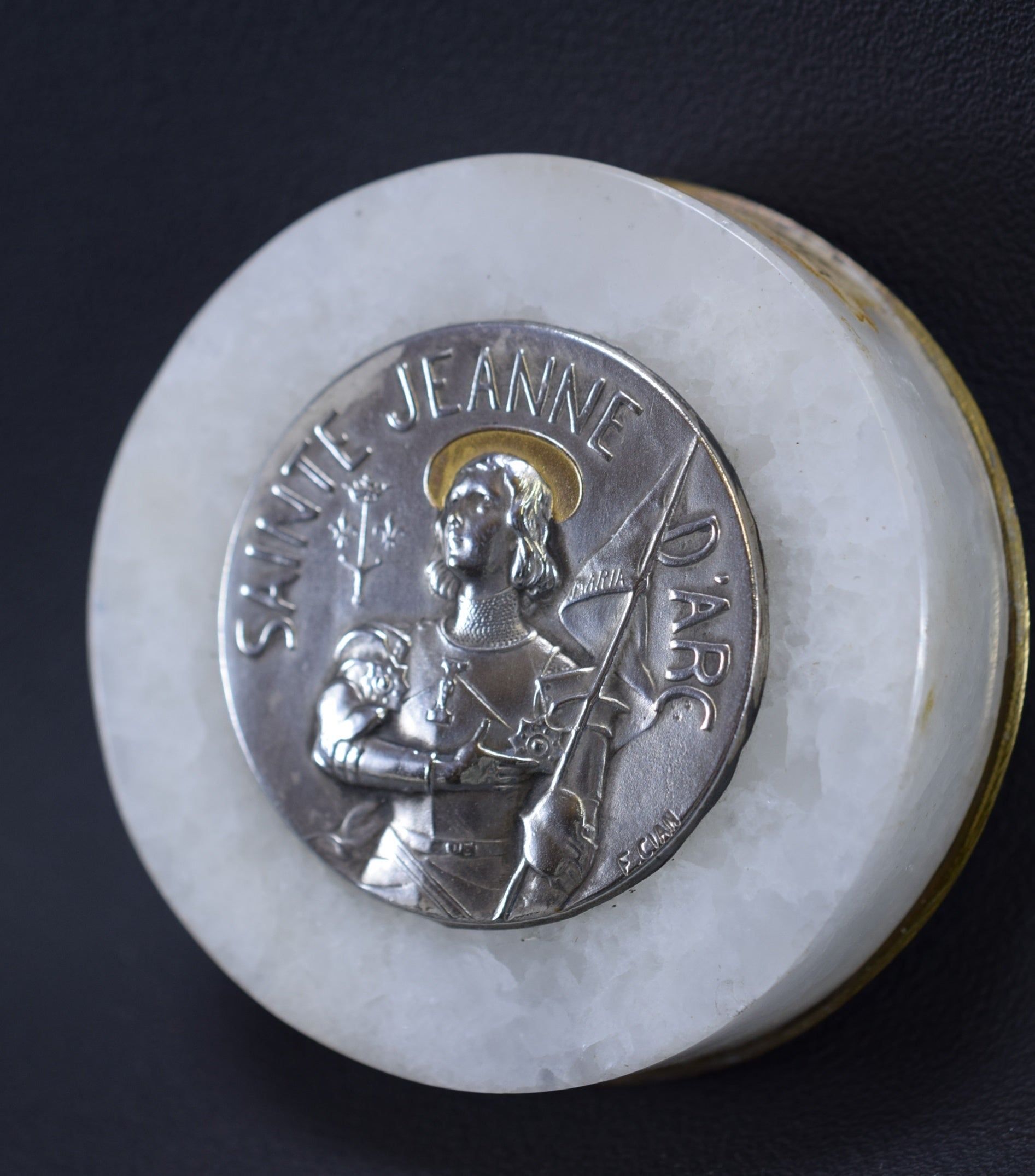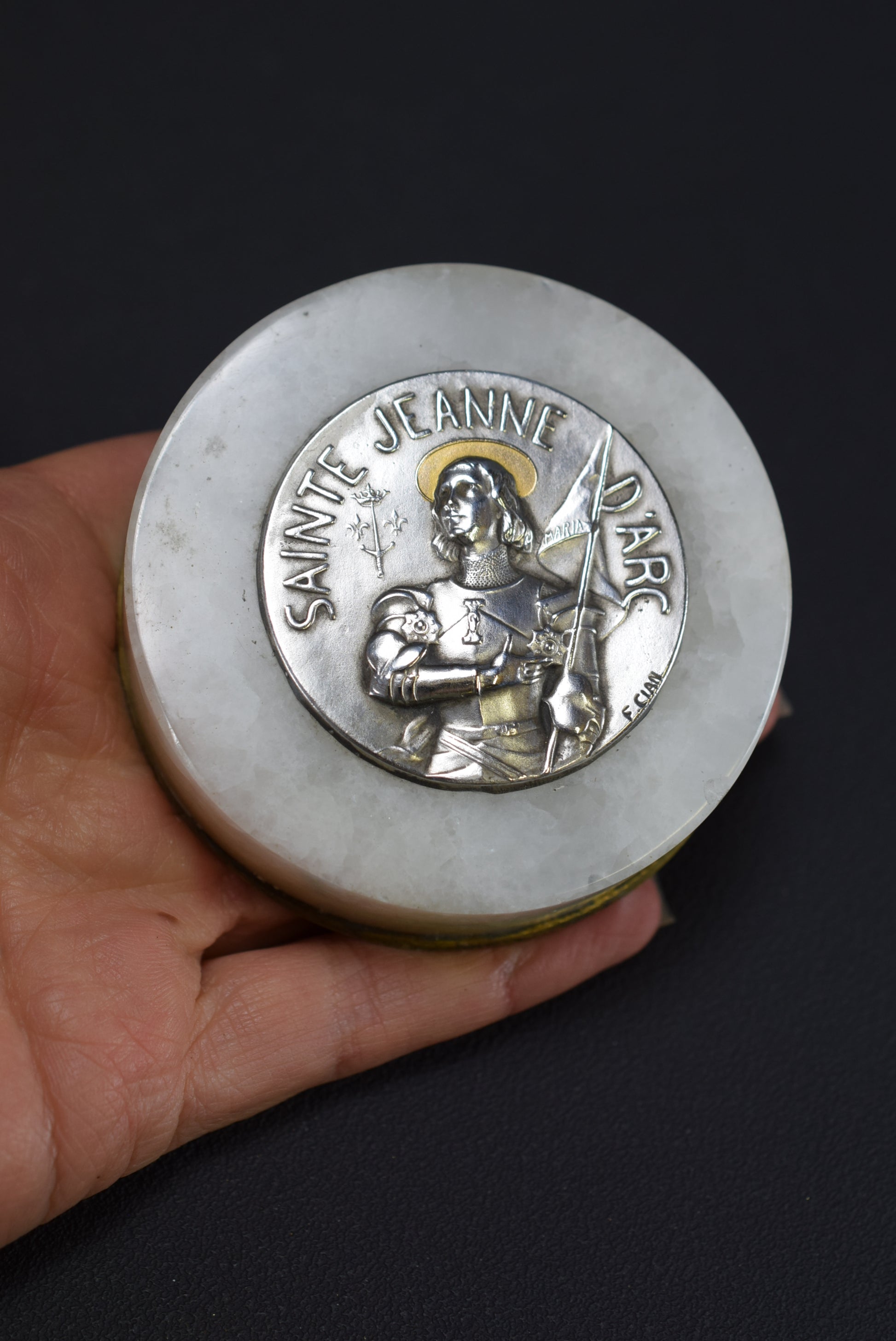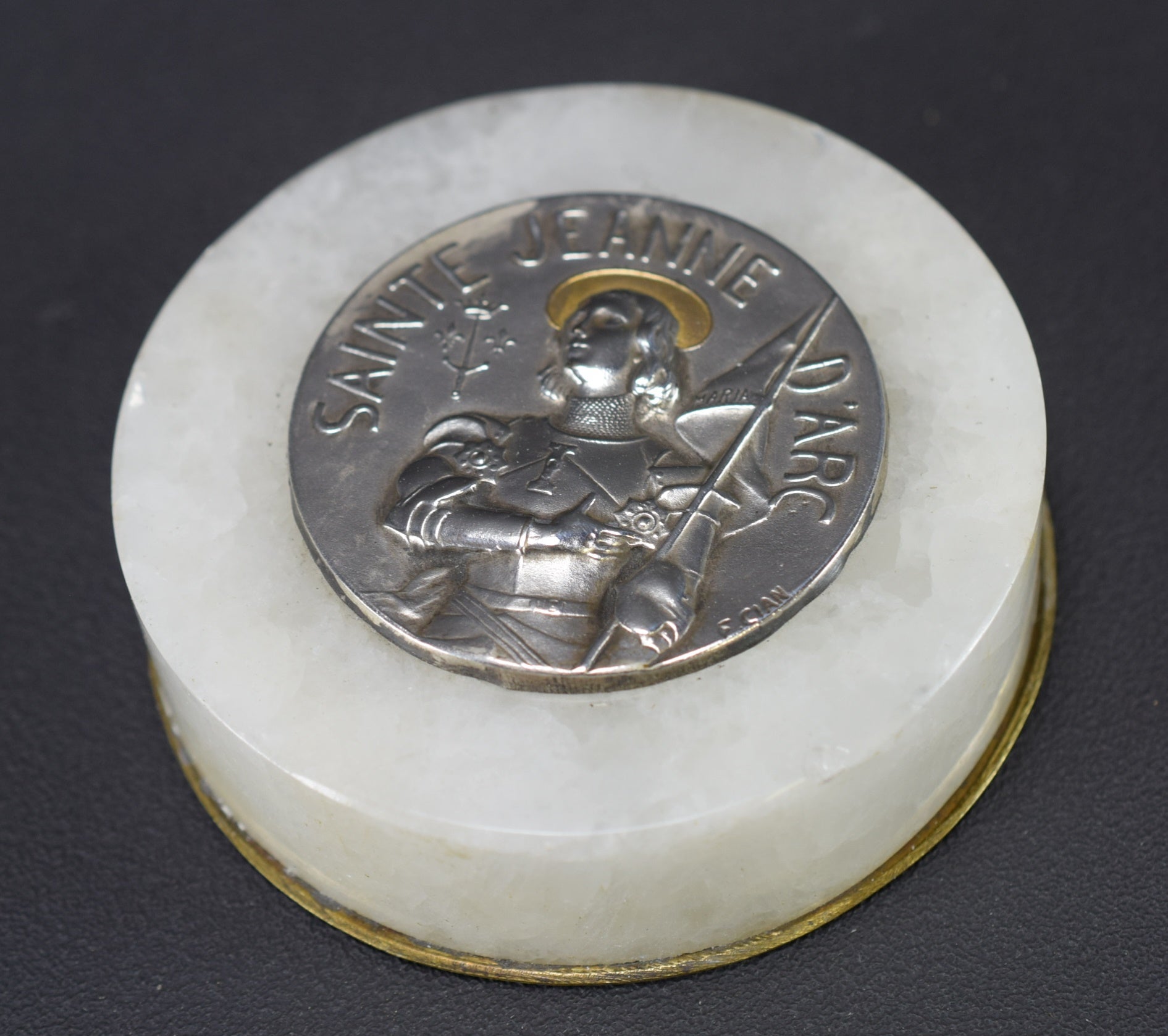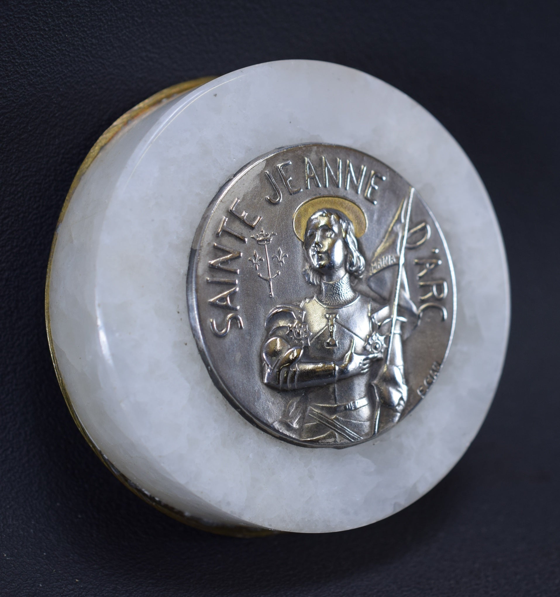 Un presse-papier religieux ancien Art Nouveau français en marbre blanc. La pièce religieuse du début du XXe siècle présente un beau portrait de Sainte Jeanne d'Arc. Il a été signé par l'artiste F.Cian : pour Fernando Ciancianaini ou Fernand Cian. Né à Carrare en 1889, le sculpteur étudie et travaille à Paris auprès de Laporte Blairsy. Il a vécu de nombreuses années à Torbole, sur le lac de Garde, où ses figures en terre cuite ornent encore l'église de la Madonna delle Vittorie ainsi que de nombreuses places publiques de la région. Il est décédé en 1954.
