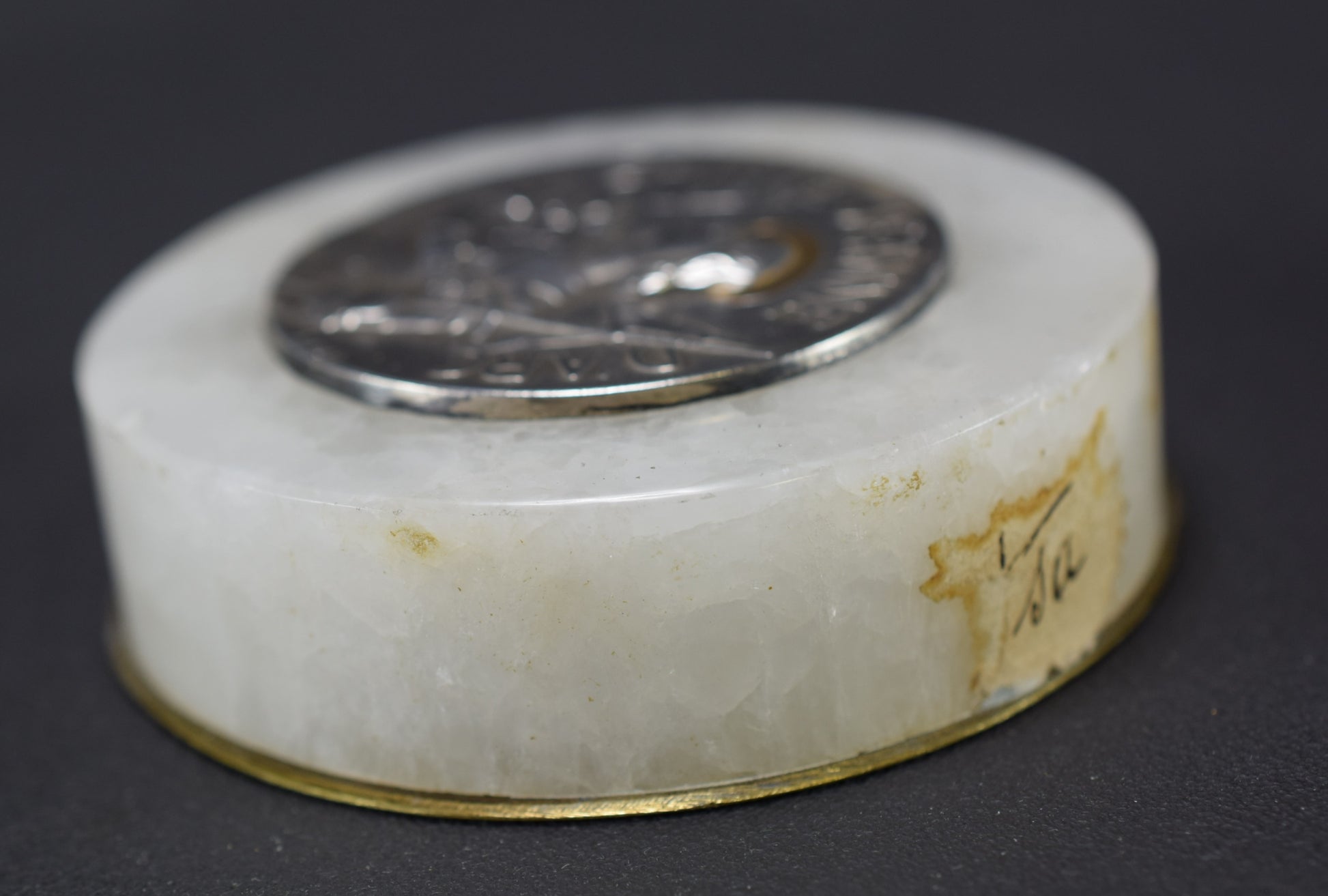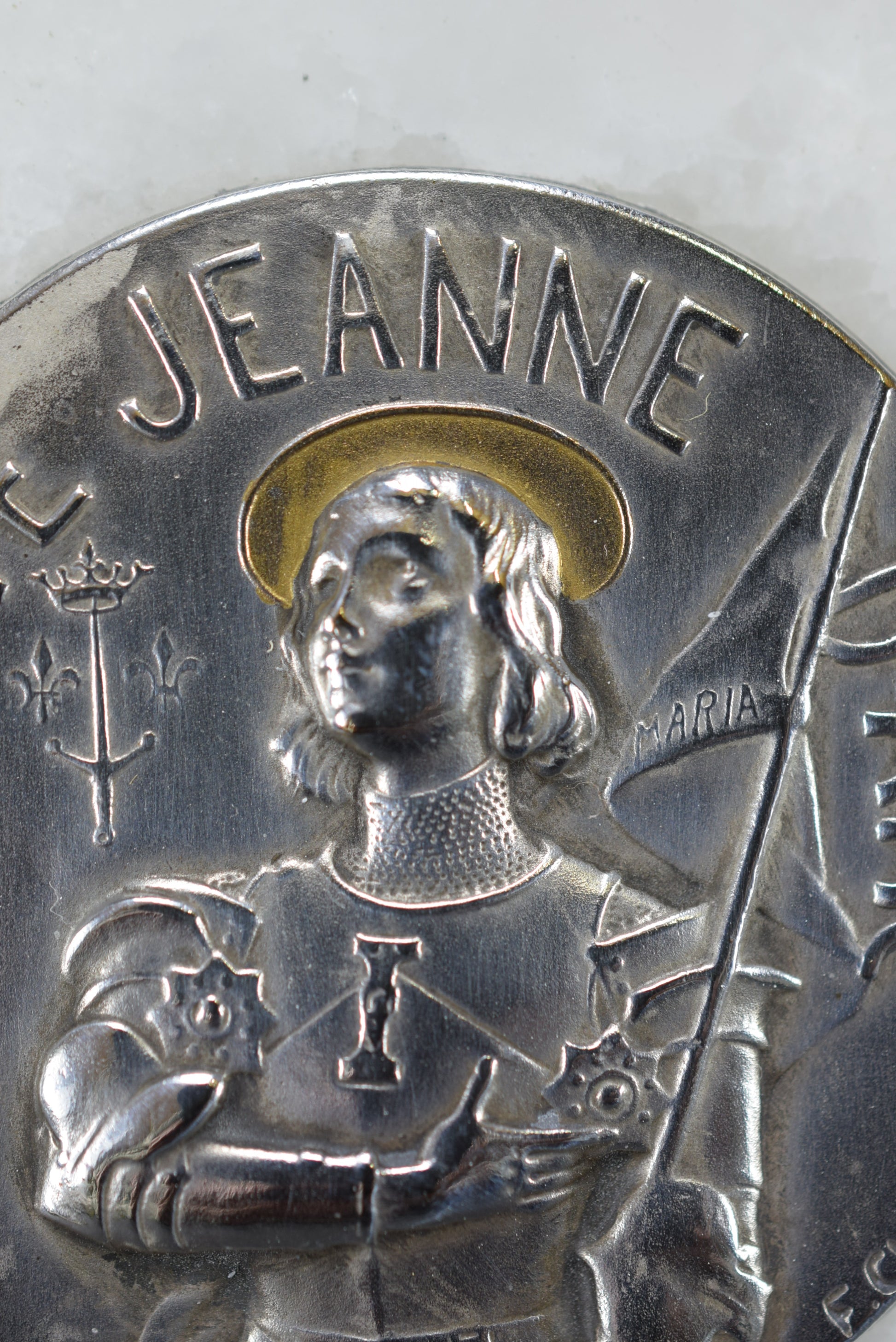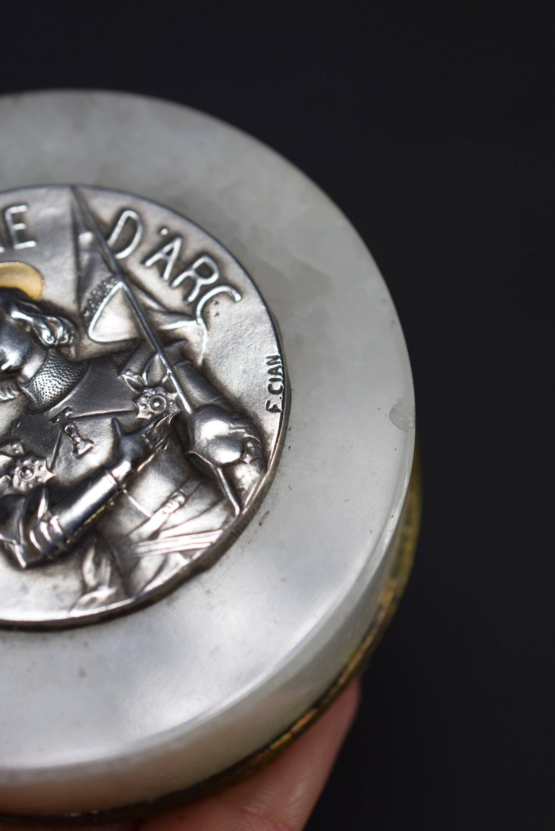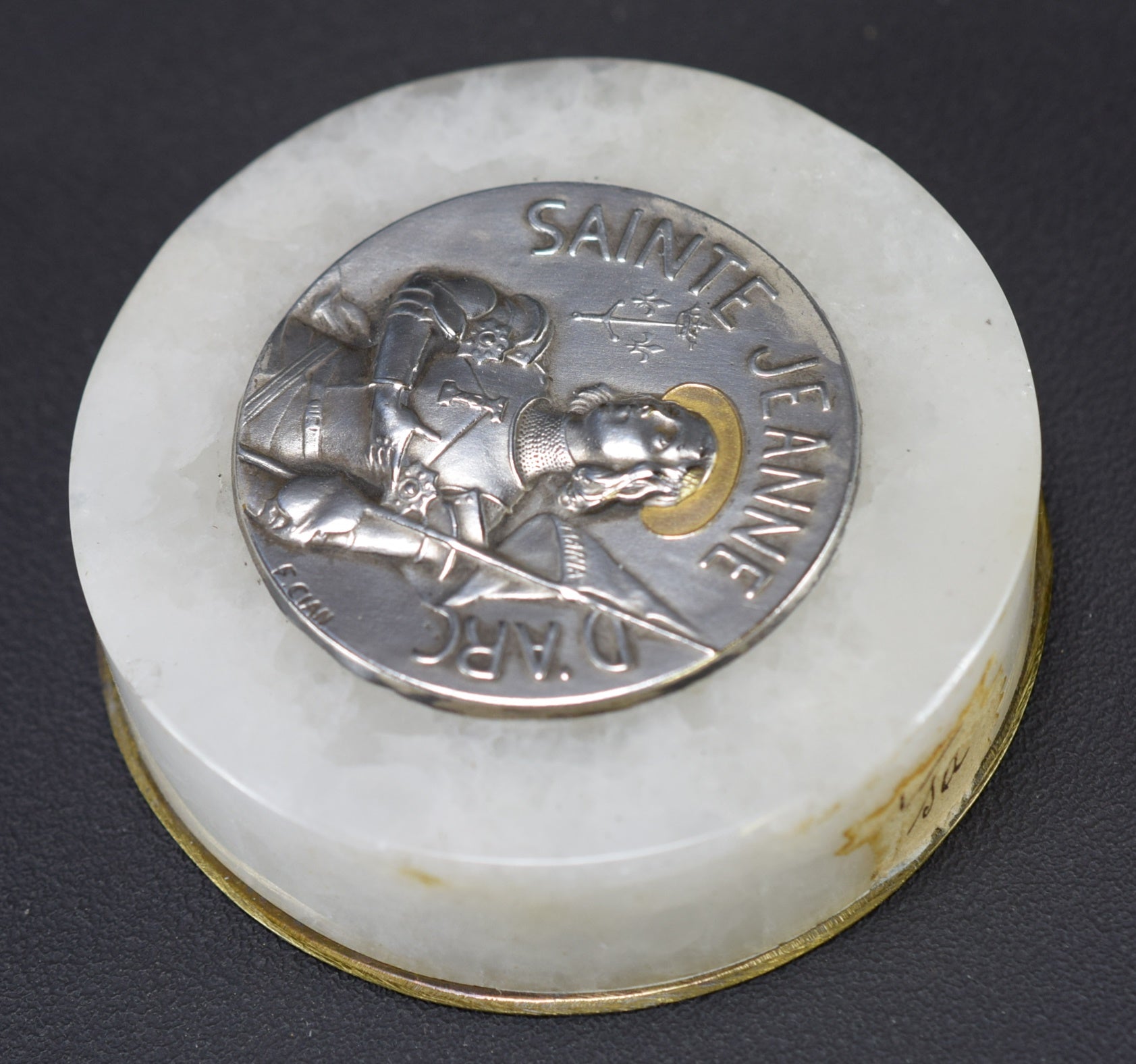 Un presse-papier religieux ancien Art Nouveau français en marbre blanc. La pièce religieuse du début du XXe siècle présente un beau portrait de Sainte Jeanne d'Arc. Il a été signé par l'artiste F.Cian : pour Fernando Ciancianaini ou Fernand Cian. Né à Carrare en 1889, le sculpteur étudie et travaille à Paris auprès de Laporte Blairsy. Il a vécu de nombreuses années à Torbole, sur le lac de Garde, où ses figures en terre cuite ornent encore l'église de la Madonna delle Vittorie ainsi que de nombreuses places publiques de la région. Il est décédé en 1954.