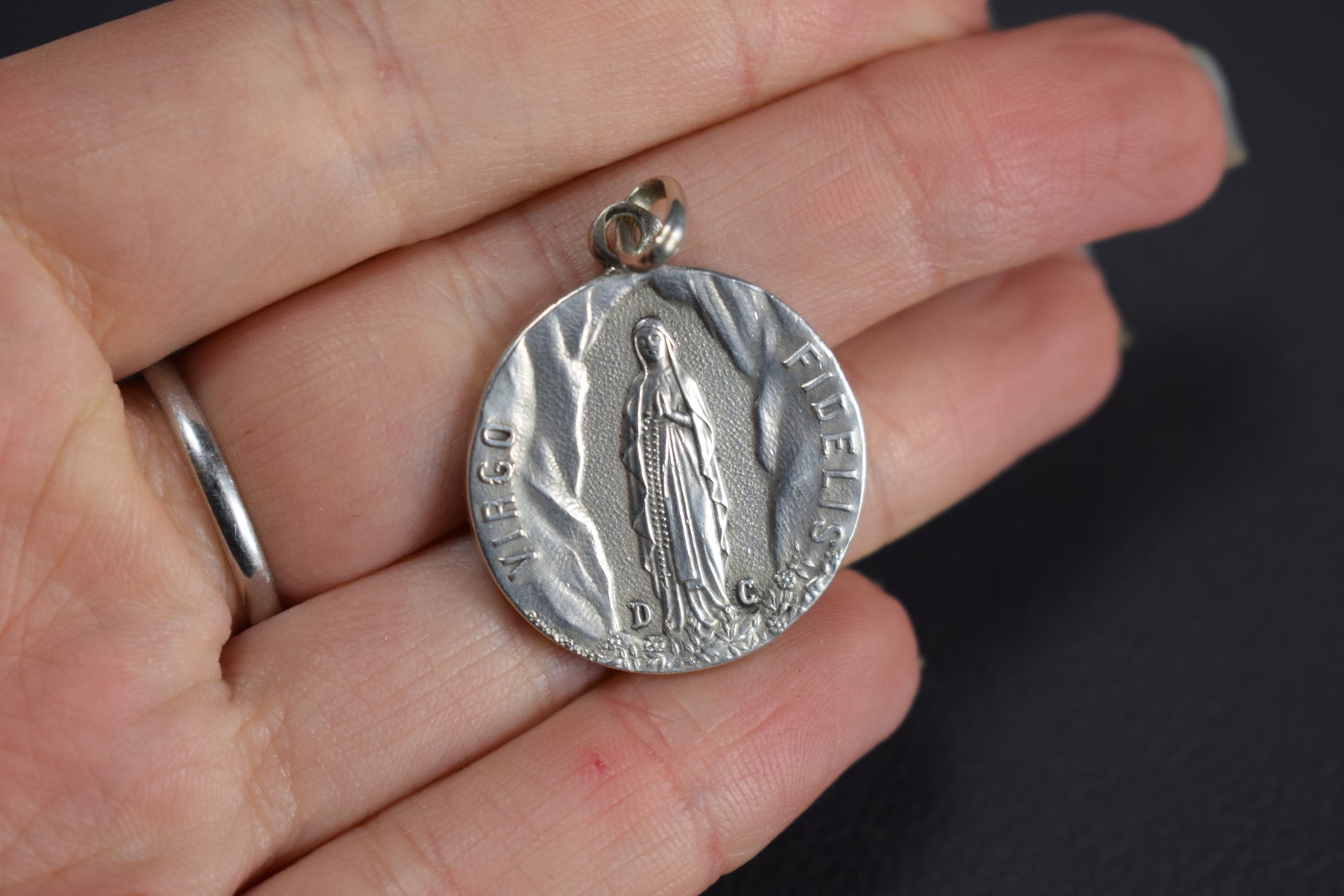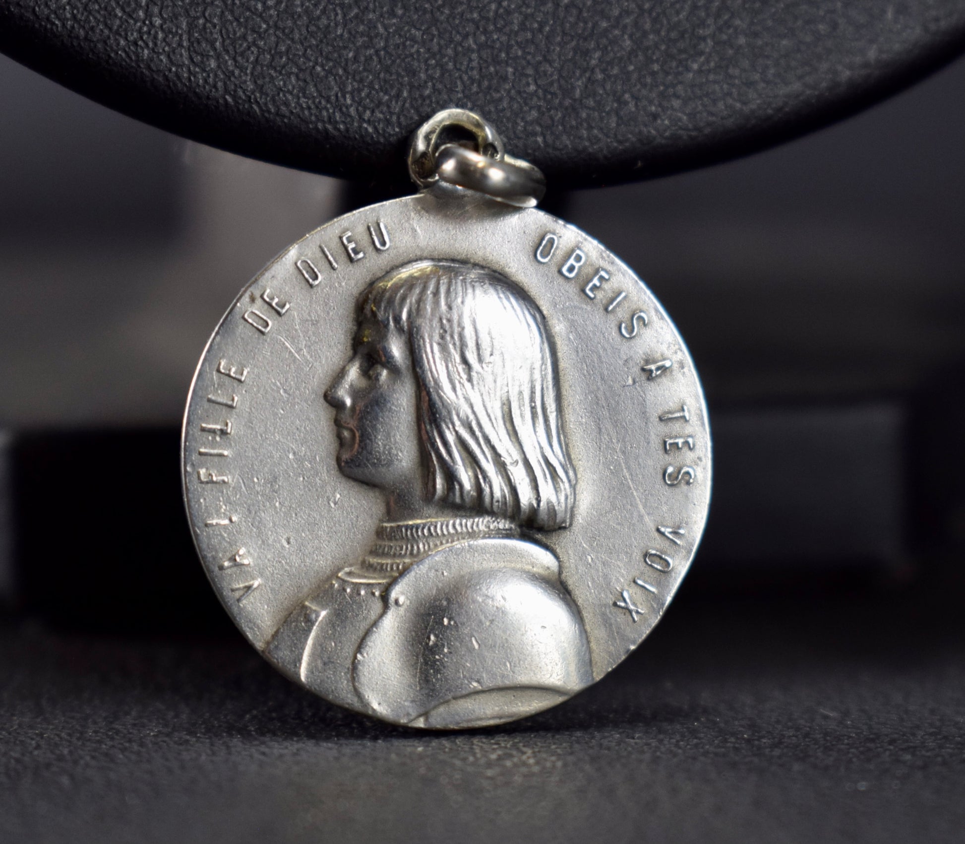 Une magnifique médaille antique française de Sainte Jeanne d'Arc datant du début du 20ème siècle. Le rare pendentif en argent sterling présente un beau portrait de Sainte Jeanne d'Arc. Sa tête est relevée avec un air déterminé. Elle est entourée des mots français : « Va Fille de Dieu, Obéis à tes Voix ». Le revers représente Notre-Dame Vierge Marie de Lourdes. Vierge Fideli. Il a été signé par les graveurs français Penin Poncet.