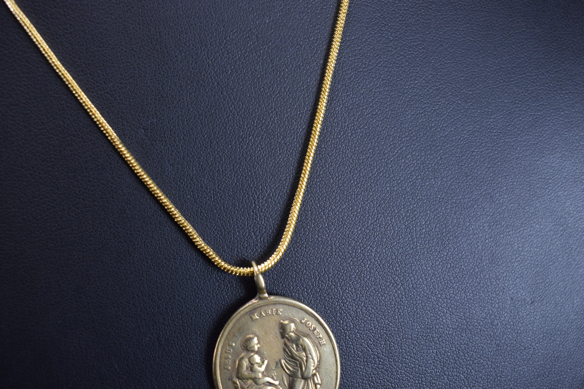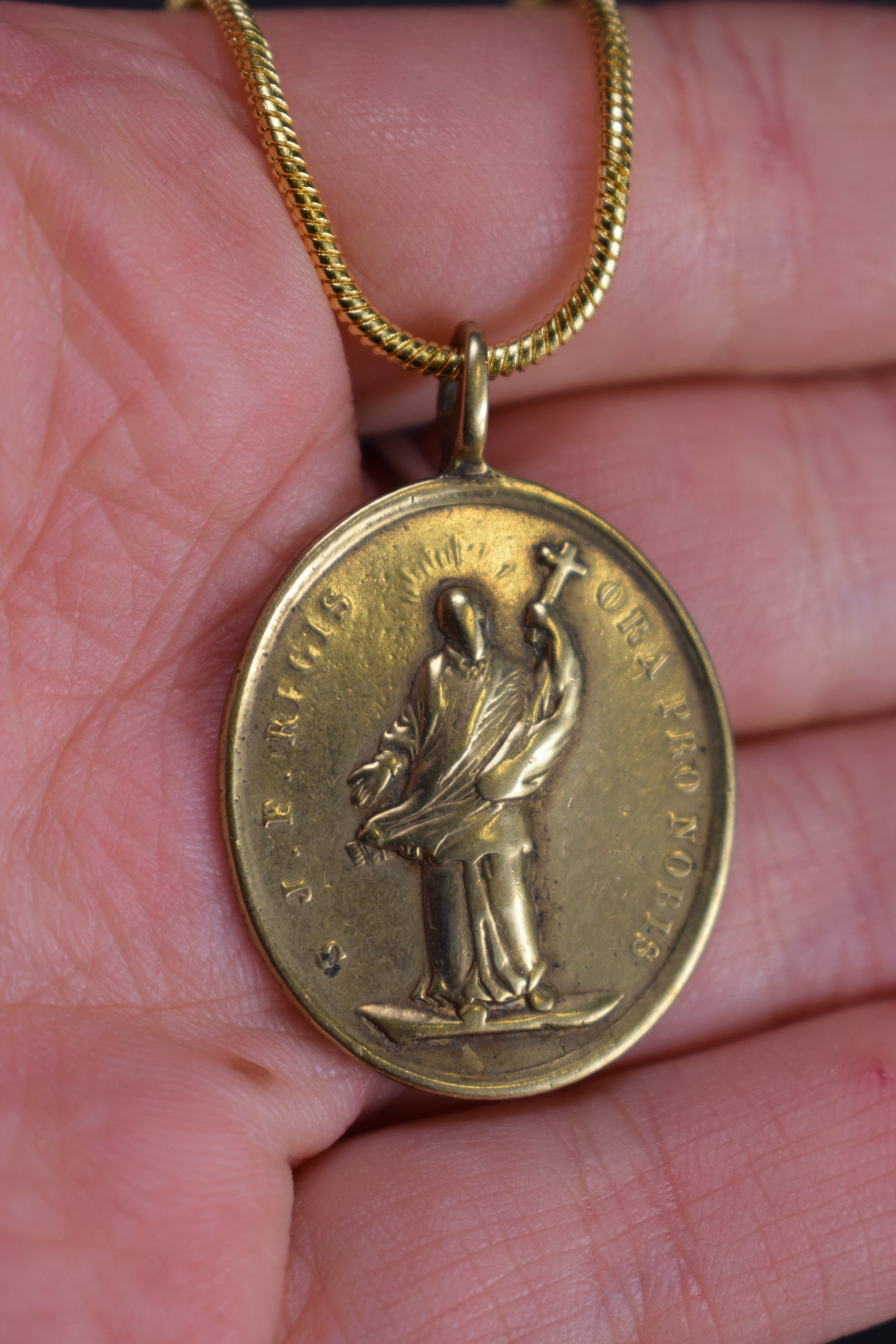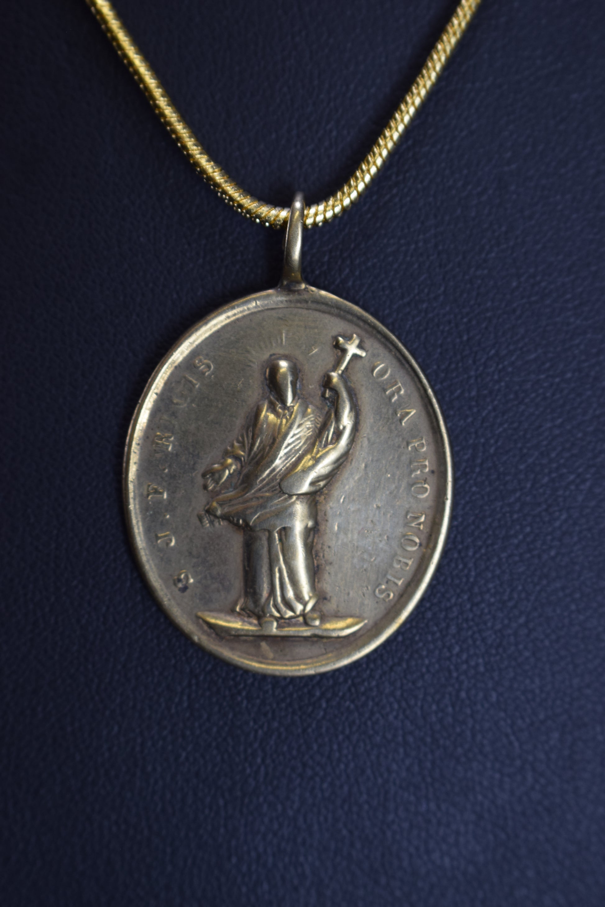 La médaille flotte sur une nouvelle chaîne serpentine plaquée or 18 carats mesurant 20 pouces (50 cm) de long.