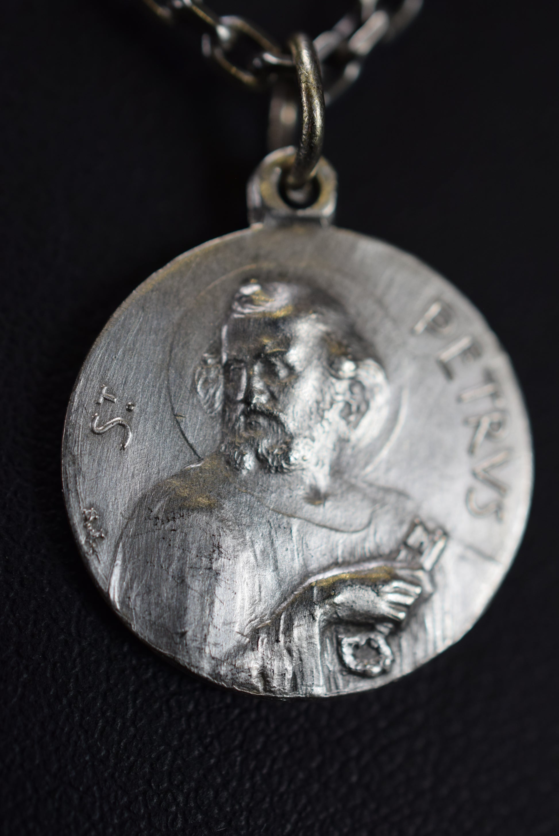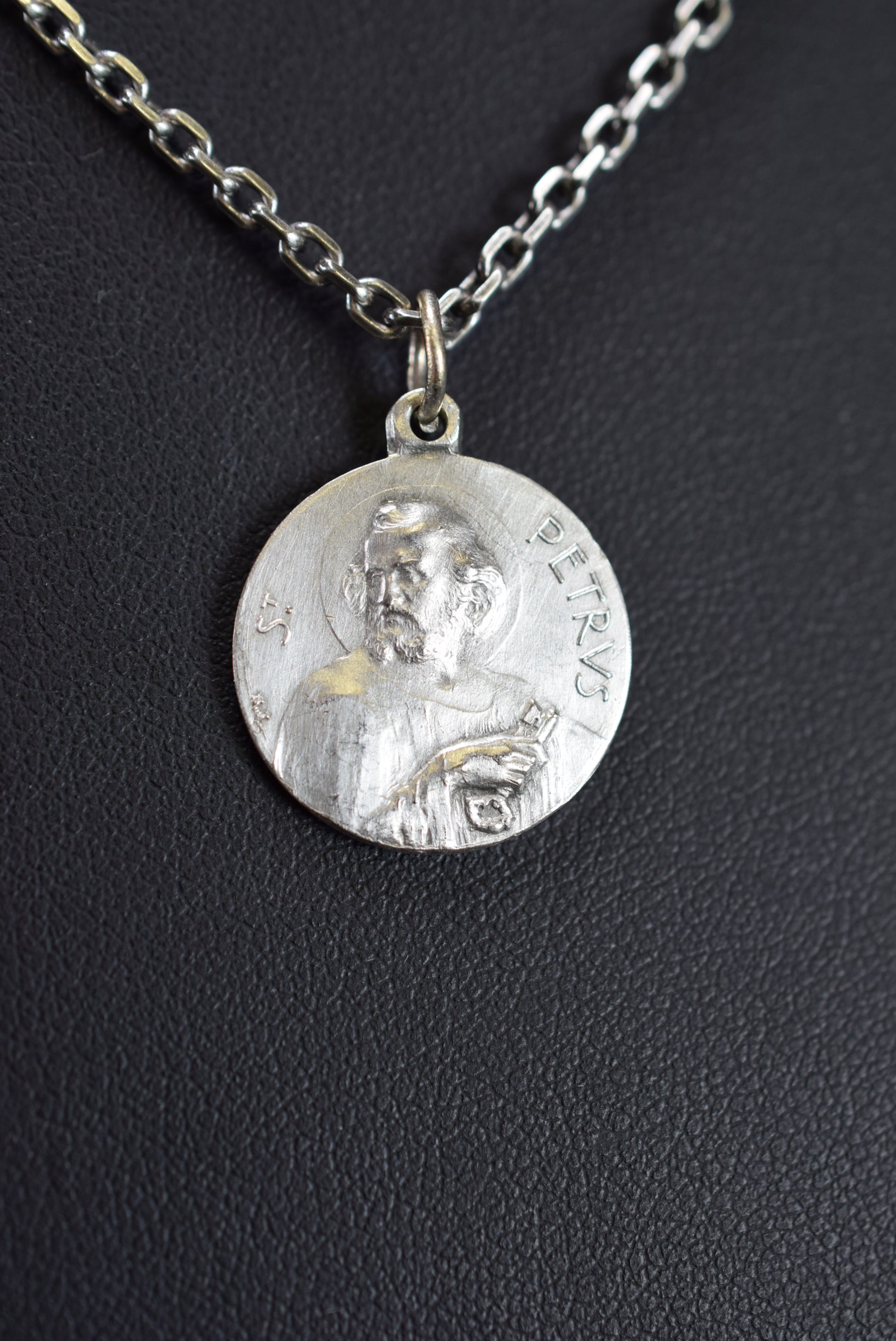 Une médaille religieuse française vintage en métal plaqué argent datant des années 1940. Il représente finement Saint Pierre avec les deux clés, la clé céleste et la clé terrestre pour ouvrir et fermer les portes du paradis. Au revers, il représente finement un portrait du Pape XI (1857-1939).