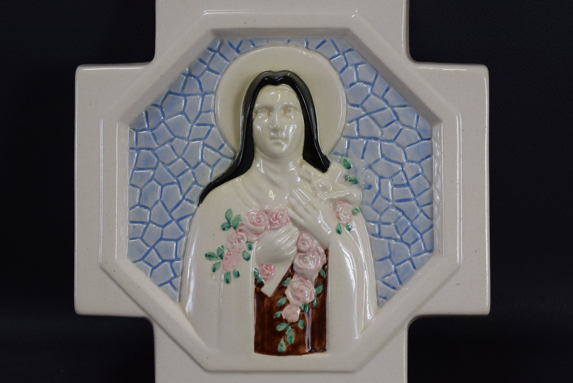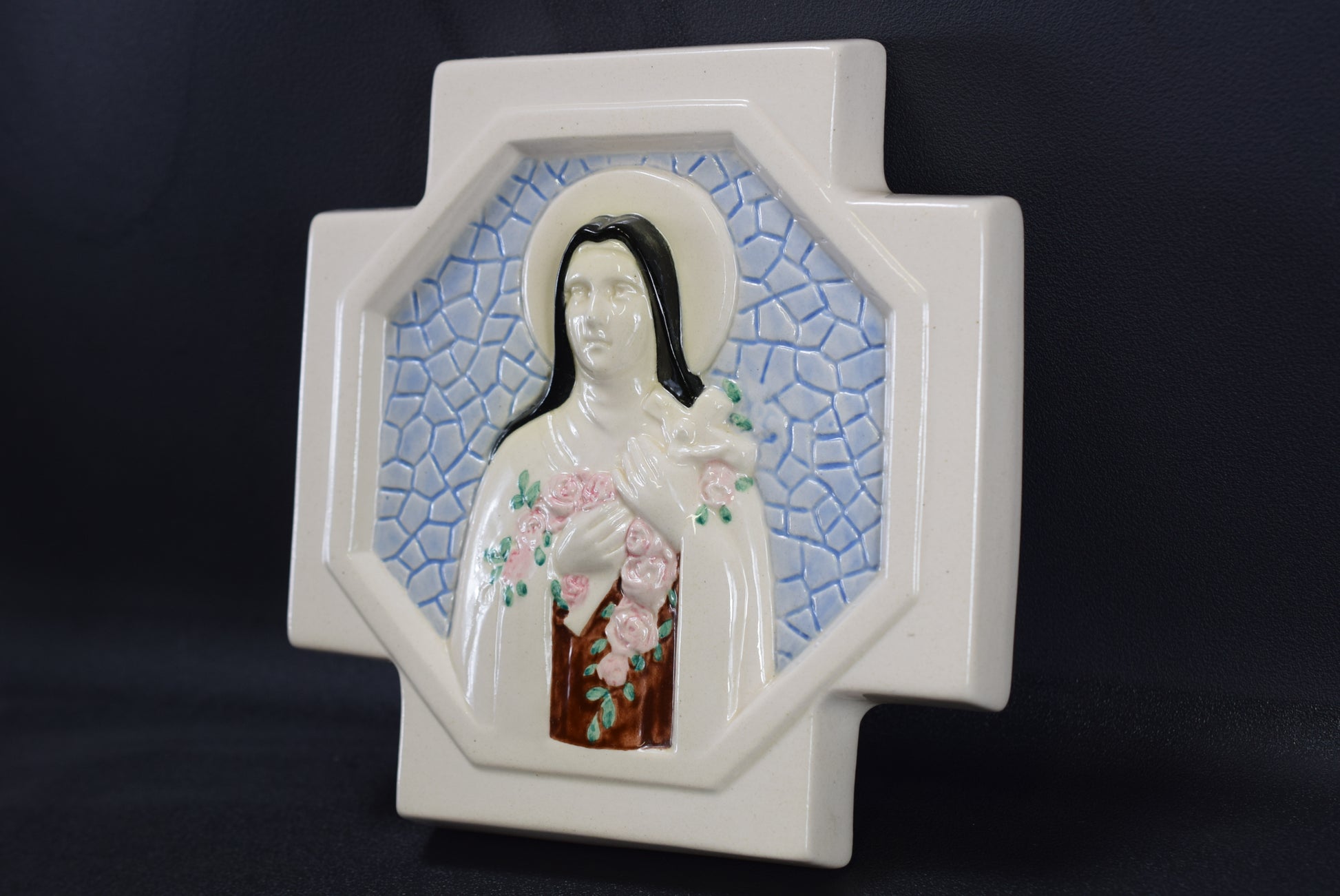 Belle plaque murale représentant Ste Thérèse de Lisieux. Faience de Desvres. Design créé par l'artiste Maria Caullet Nantard.