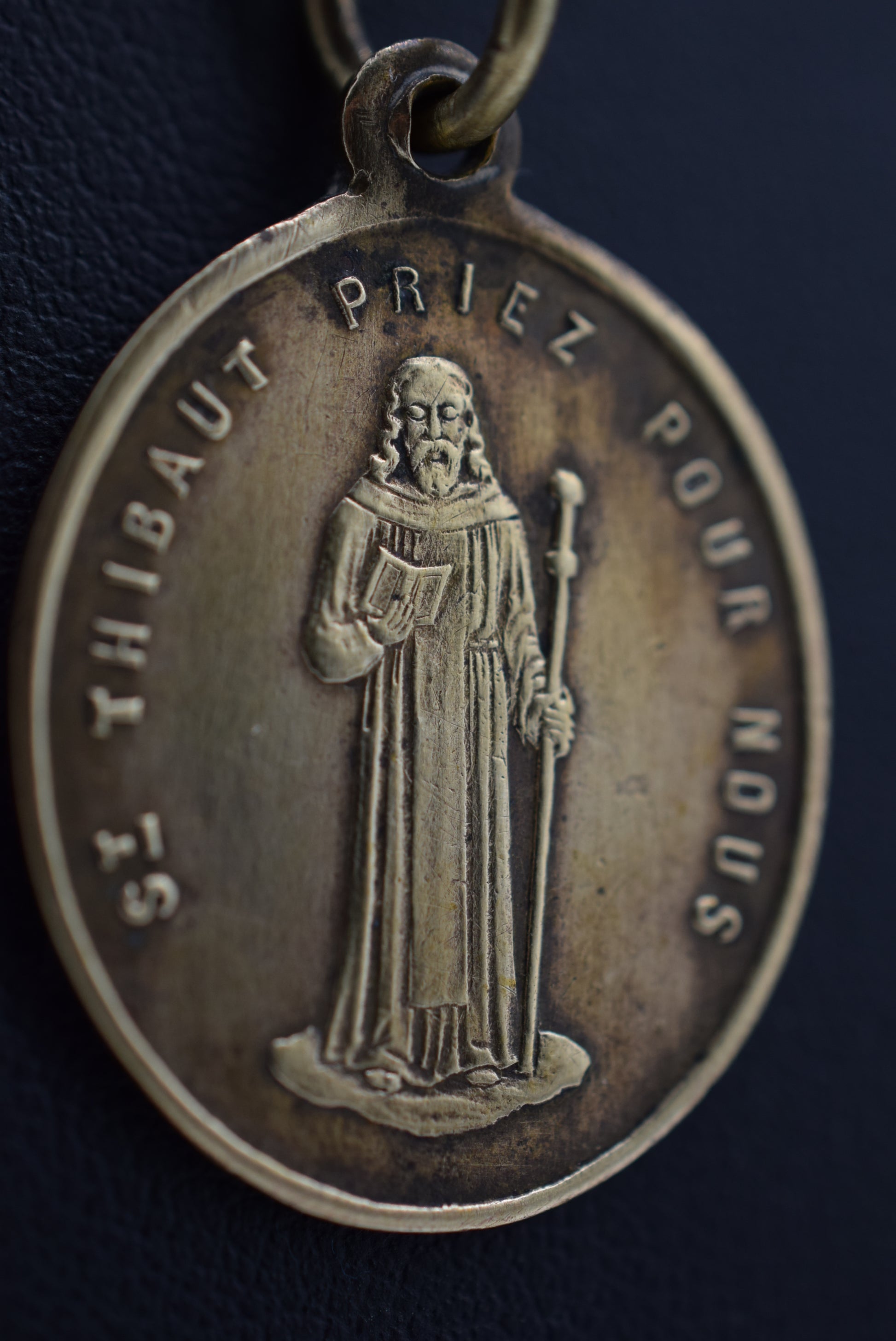 Une médaille religieuse authentique française en métal laiton. Le pendentif raffiné met en scène avec finesse Saint Thibaut ou Saint Théobald de Provins. " Théobald mourut à Sossano le 30 juin, aujourd'hui jour de sa fête, en 1066 après JC. Ses reliques furent transférées dans un monastère près de Sens, puis à Auxerre, au Prieuré de Saint-Thibault-en-Auxois, Côte-d'Or. .