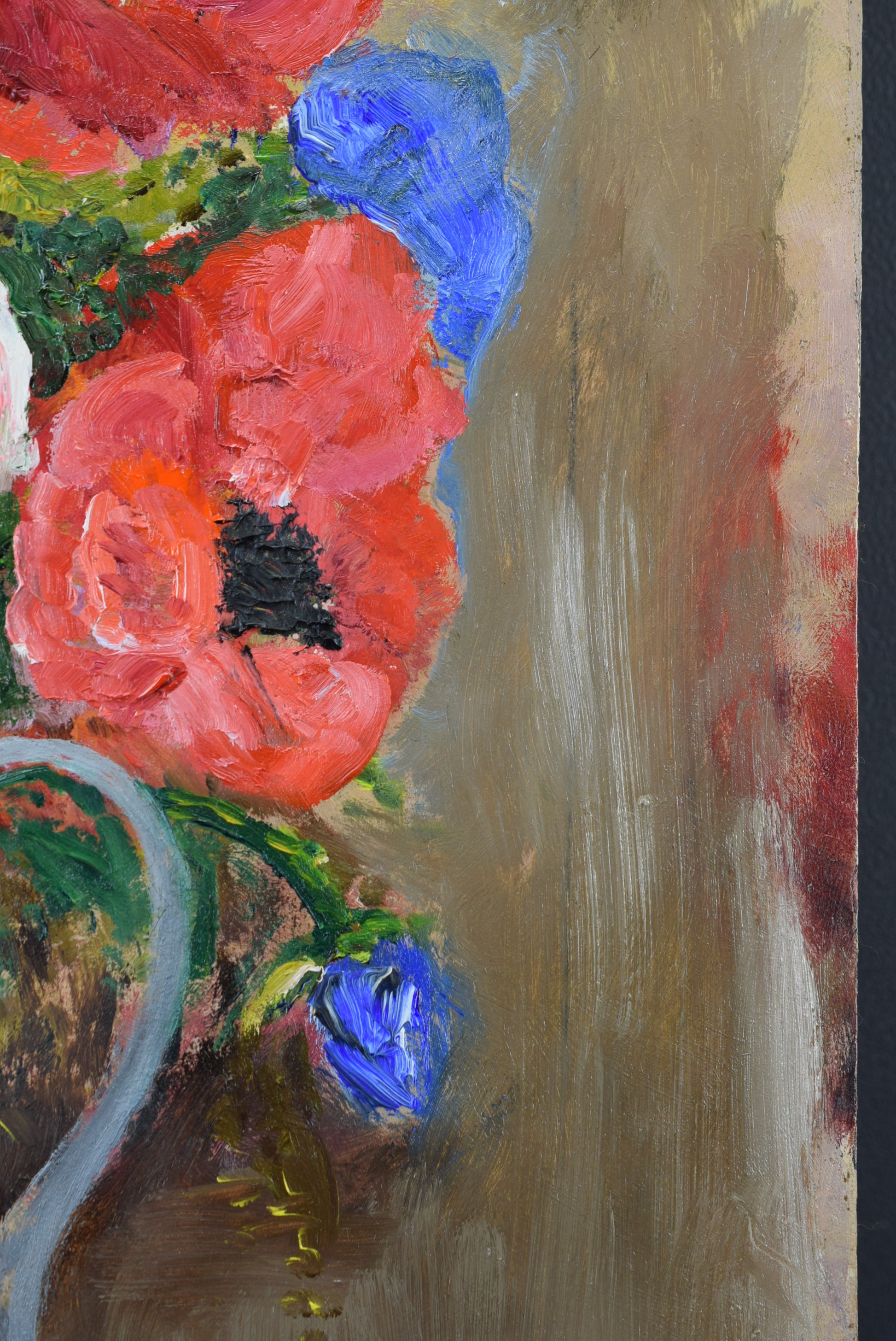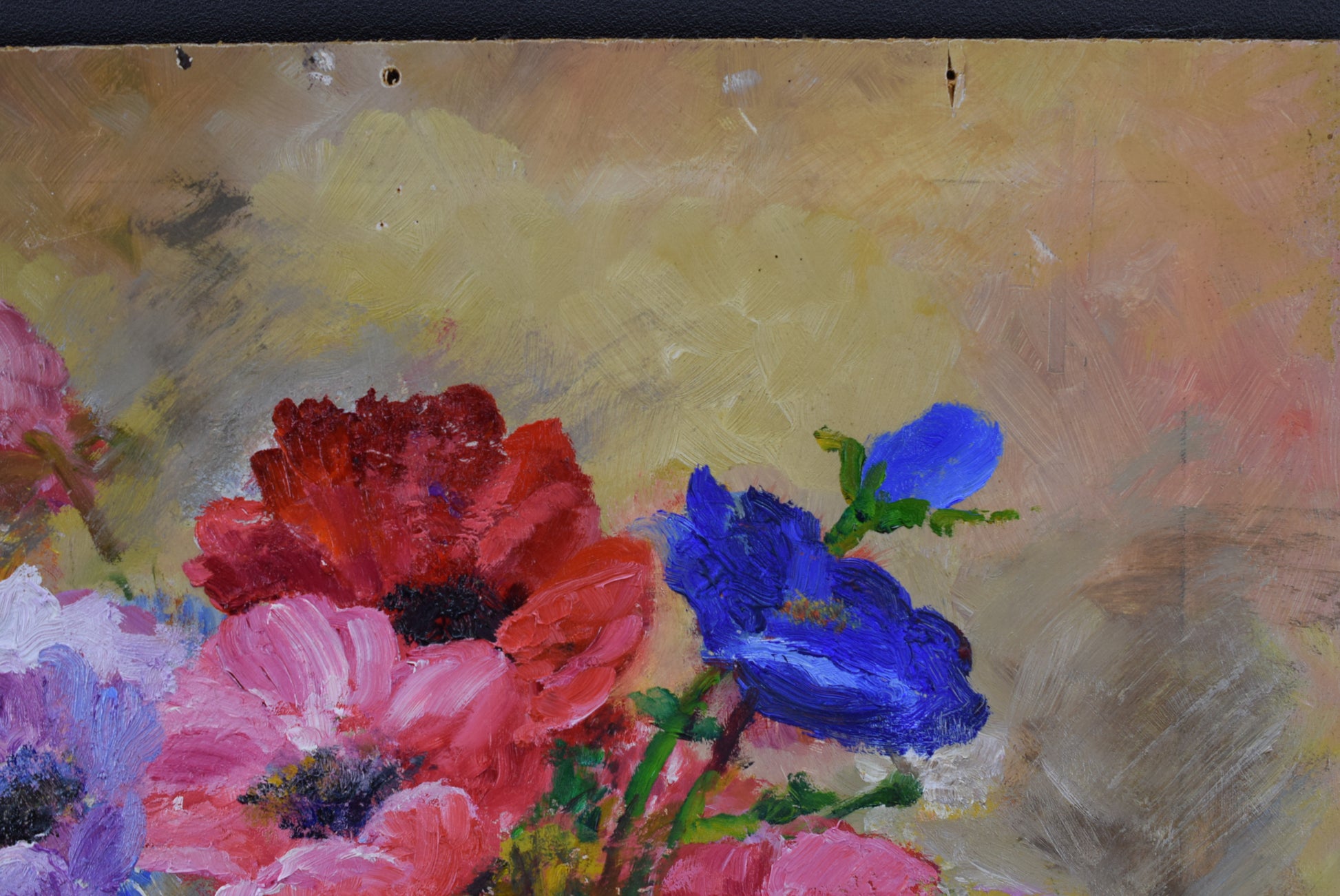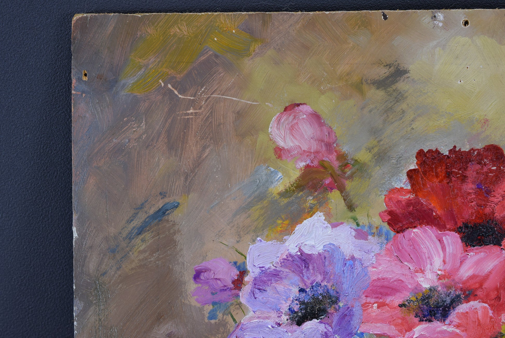 Une belle peinture à l’huile vintage française sur panneau de bois. L’image représente un bouquet floral de fleurs d’été roses, blanches et bleues dans un pichet en poterie grise.