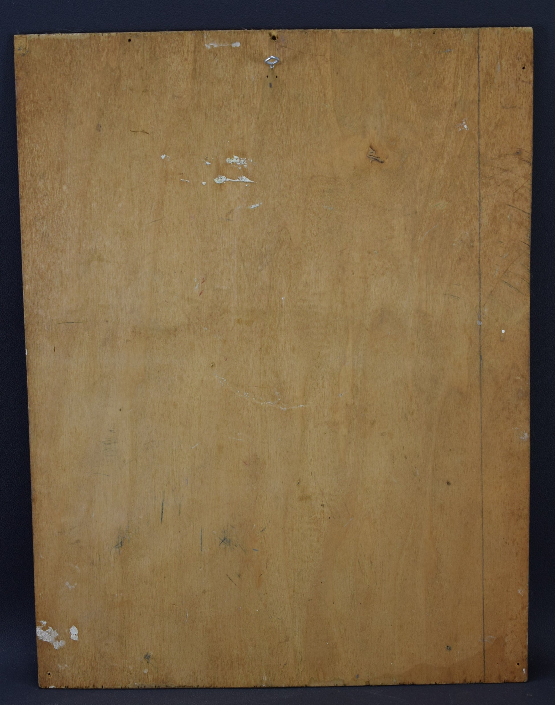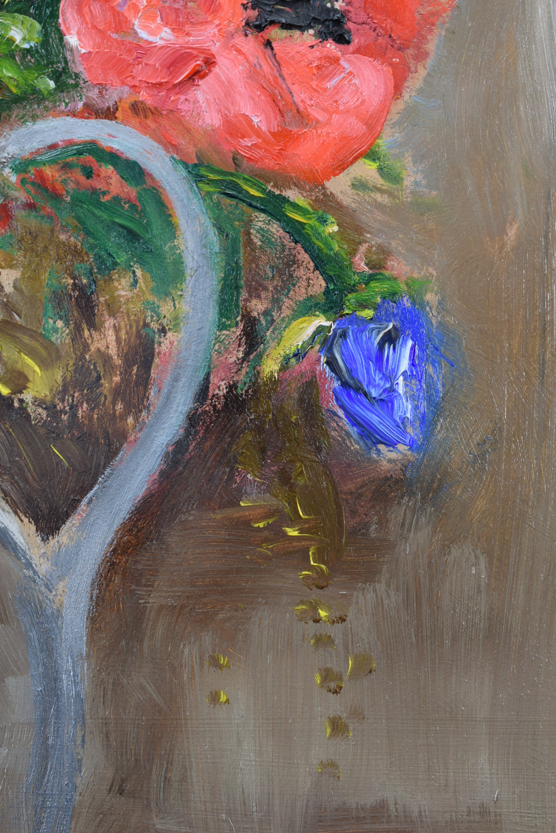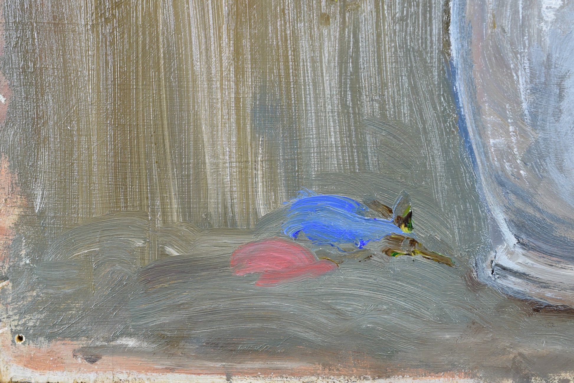 Une belle peinture à l’huile vintage française sur panneau de bois. L’image représente un bouquet floral de fleurs d’été roses, blanches et bleues dans un pichet en poterie grise.