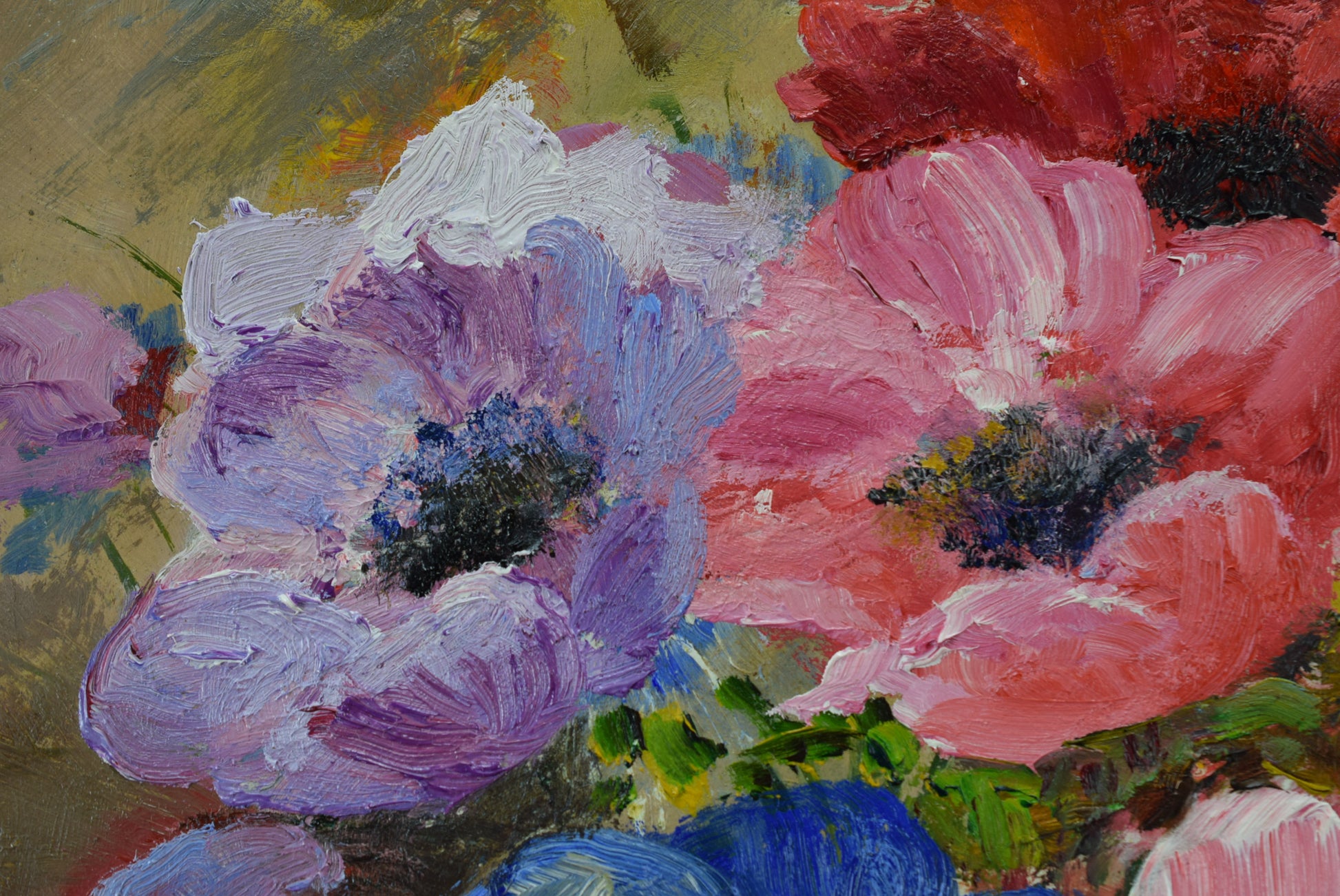 Cette nature morte florale est dans l’ensemble en bon état vintage avec quelques signes d’âge comme quelques trous d’épingle.