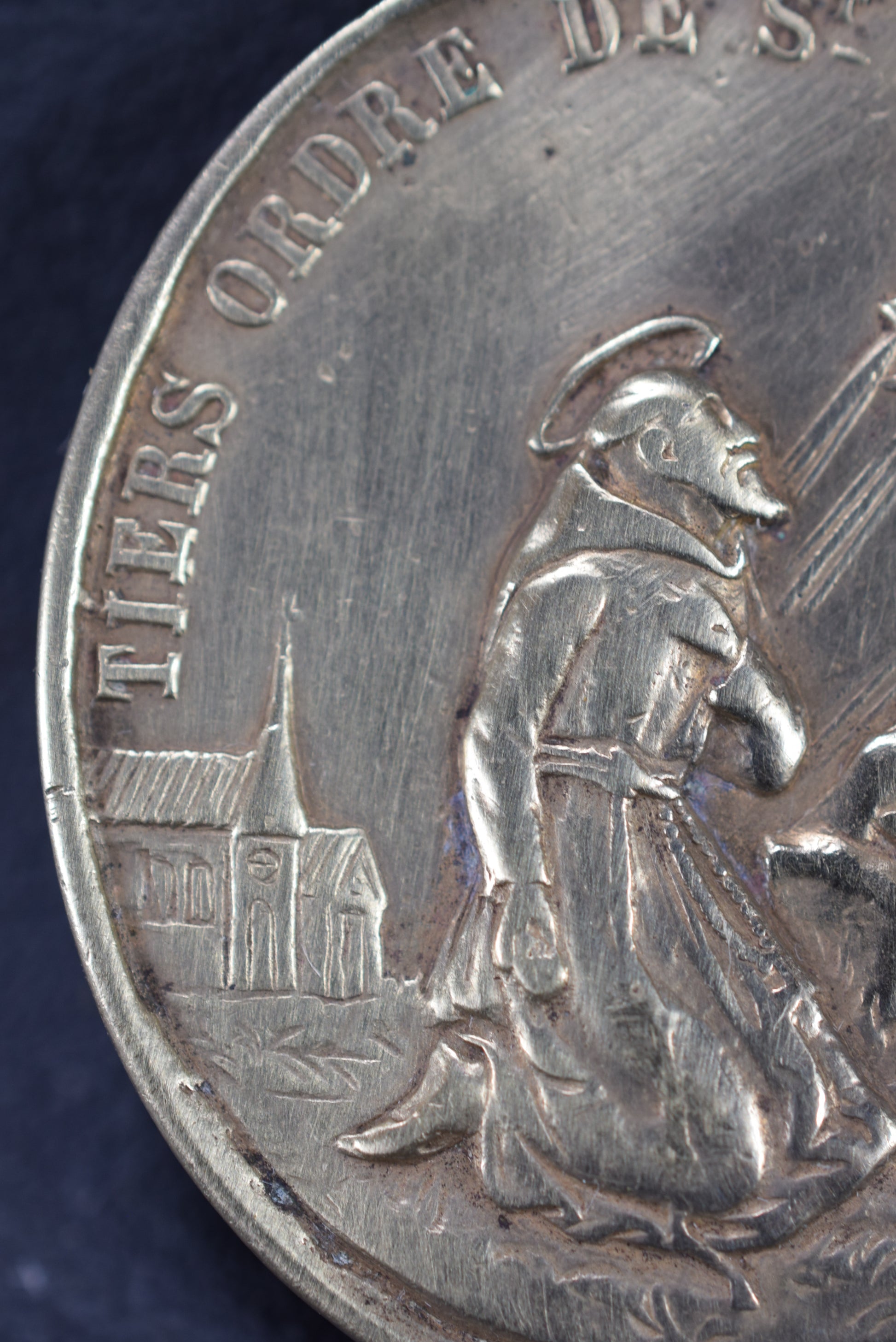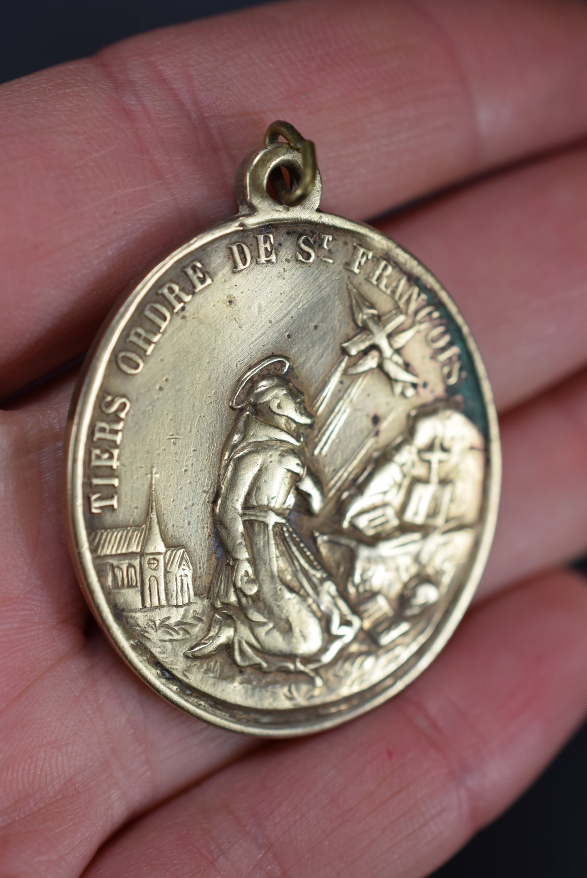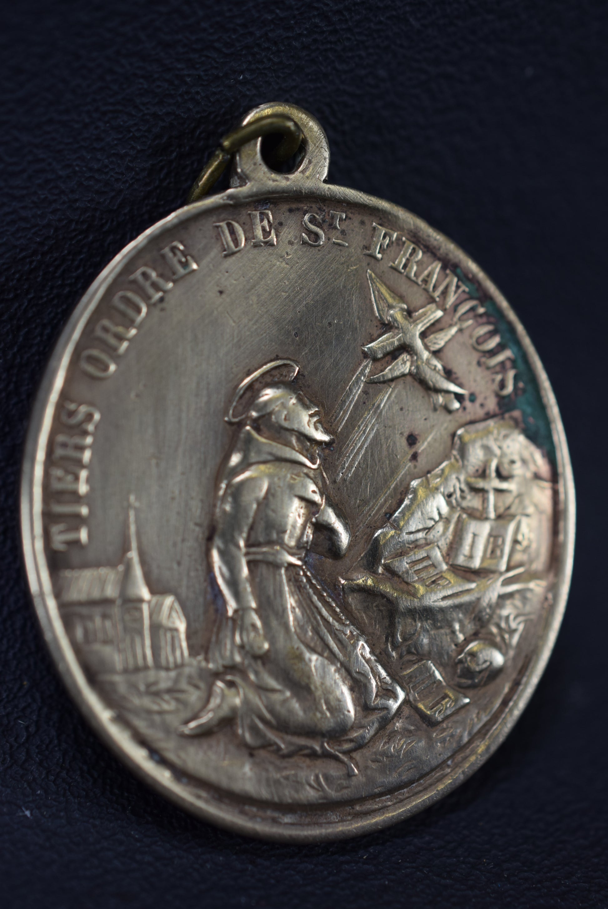 Une rare médaille française antique datant du 19ème siècle. Le pendentif religieux représente saint François d'Assise avec de fins détails. Sur ce côté vous pouvez lire les mots français : Tiers Ordre de St François signifiant en anglais Tiers Ordre de Saint François.