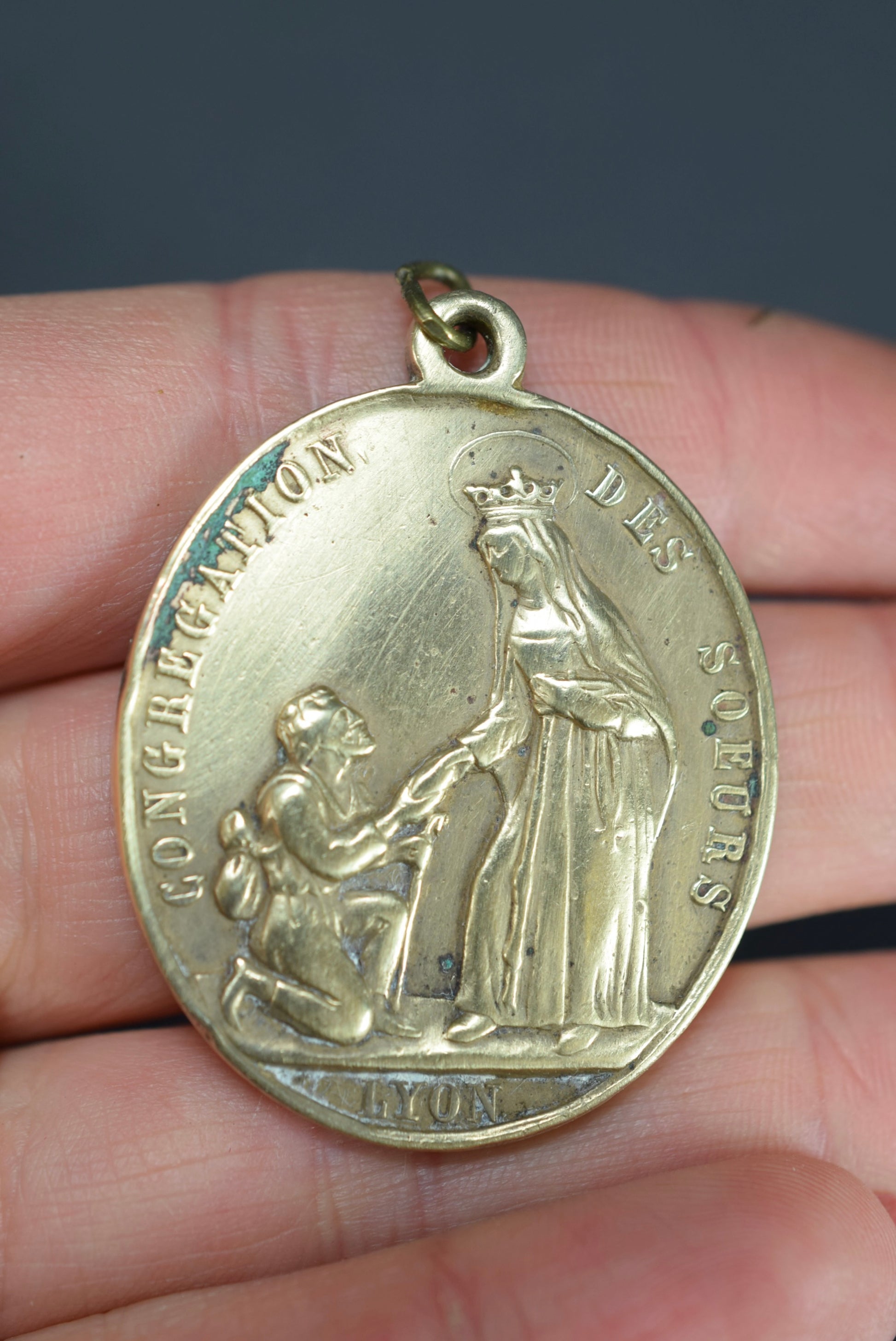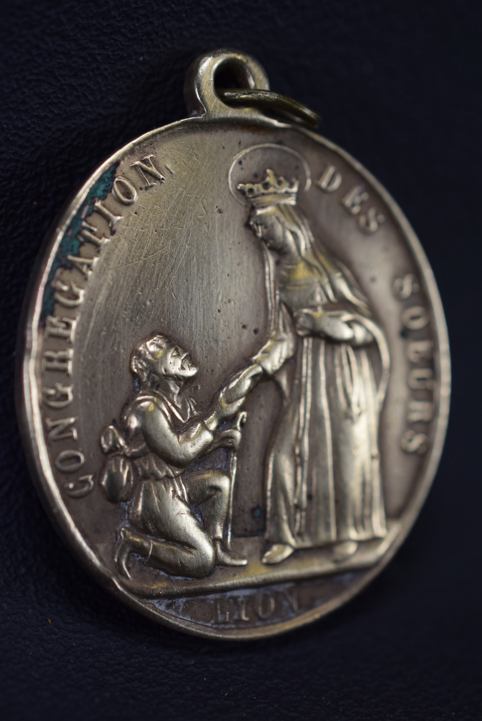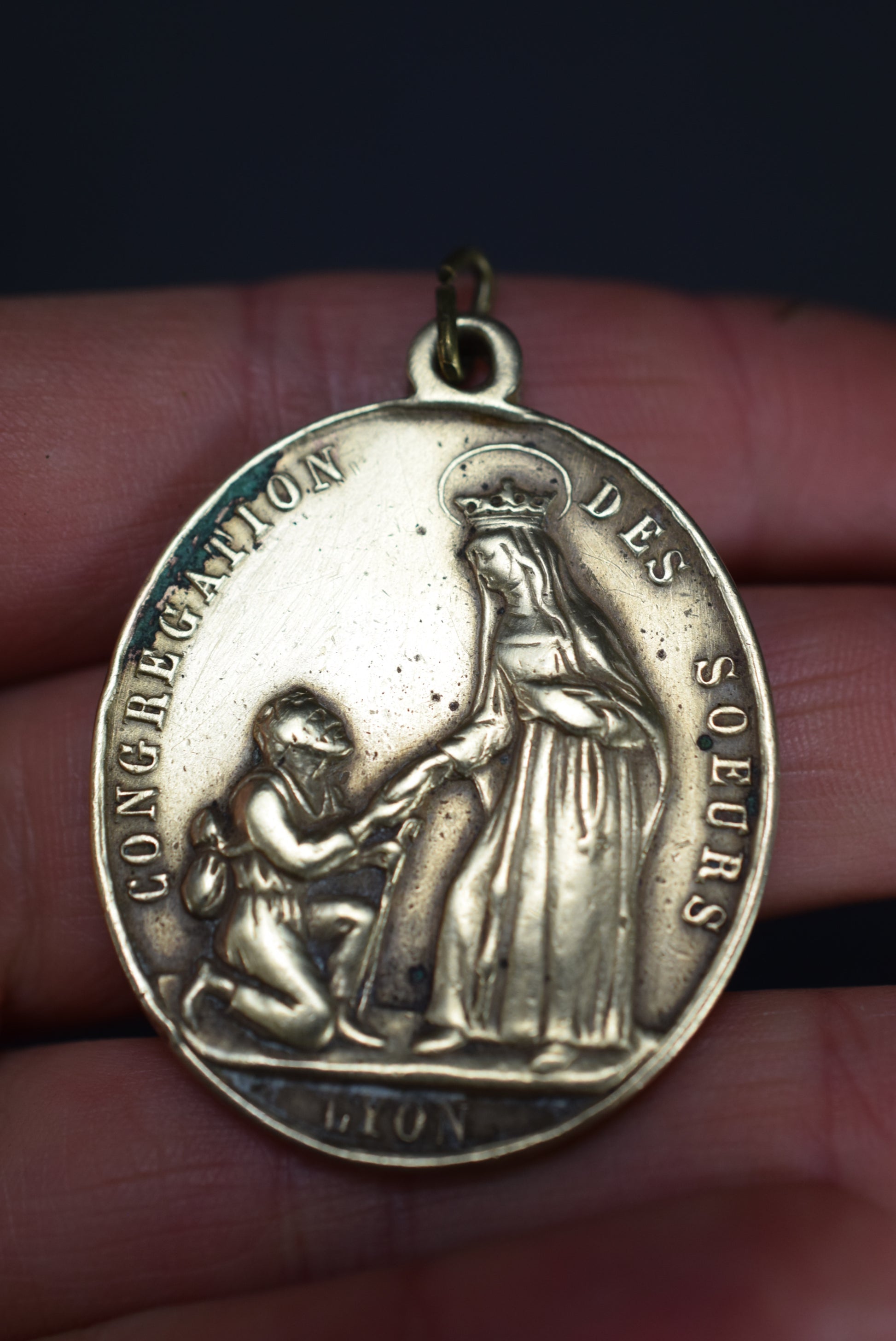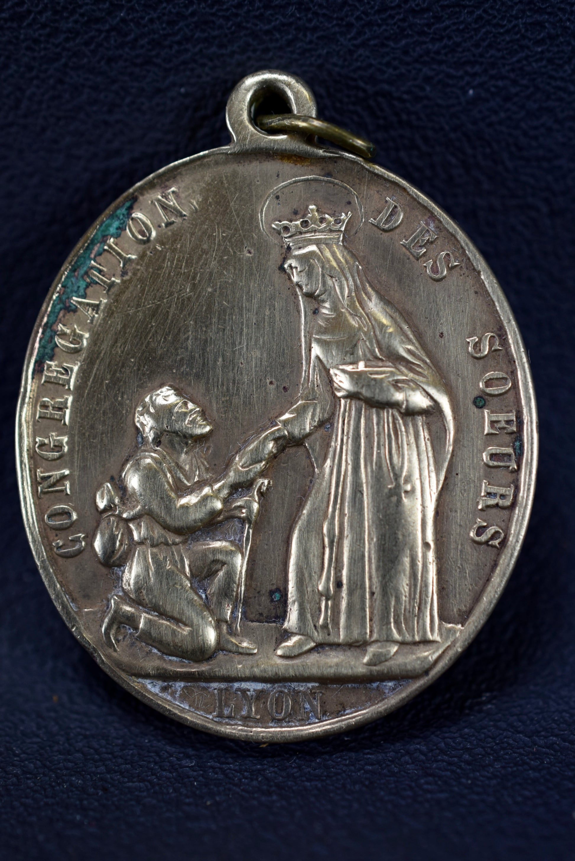 Au revers, la médaille représente un pèlerin ou un pauvre, agenouillé devant Marie. Ils sont entourés des mots français : « Congrégation des Soeurs, Lyon » signifiant « Congrégation des Sœurs, Lyon ».