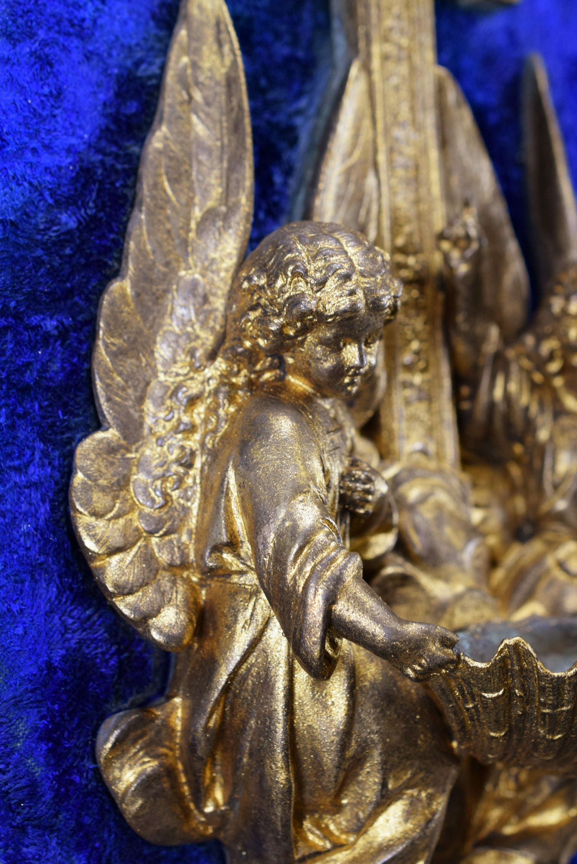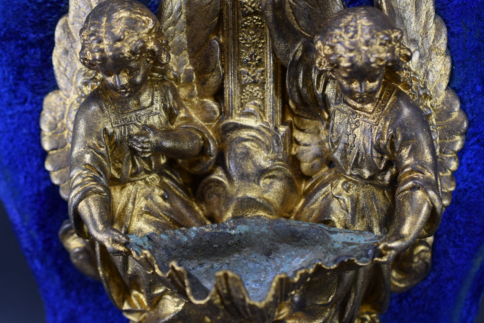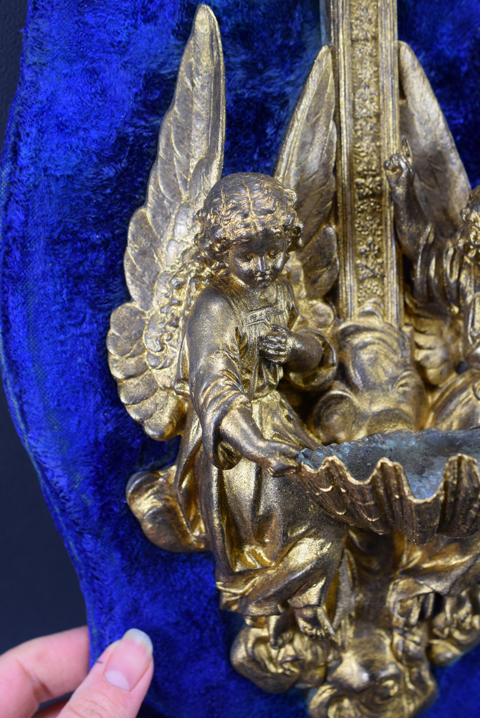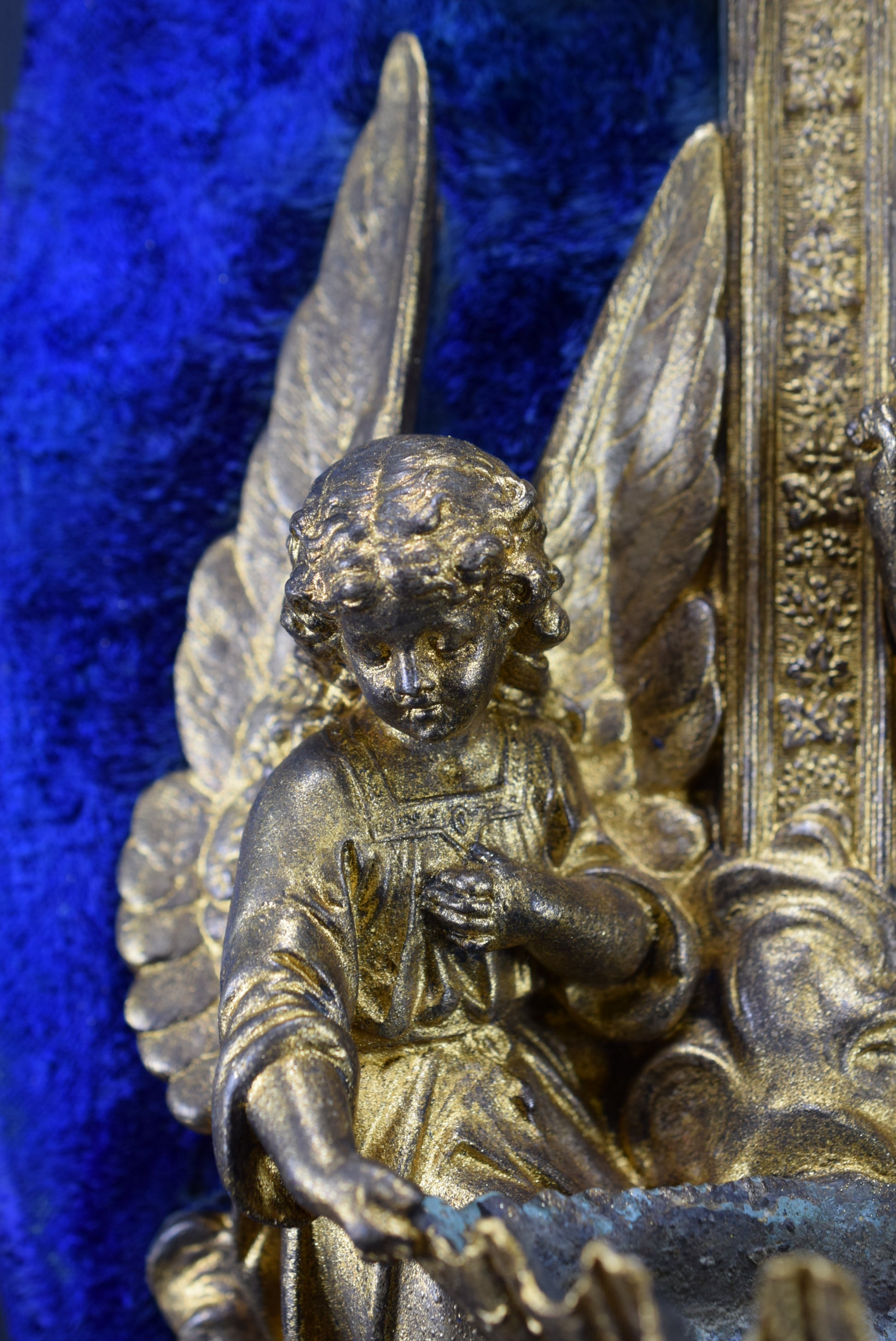 Un superbe bénitier mural antique français en régule et velours bleu. La pièce religieuse met en scène finement deux anges tenant une coquille. Ce beau bénitier date de la fin du 19ème siècle. Il présente une patine dorée qui a été restaurée.