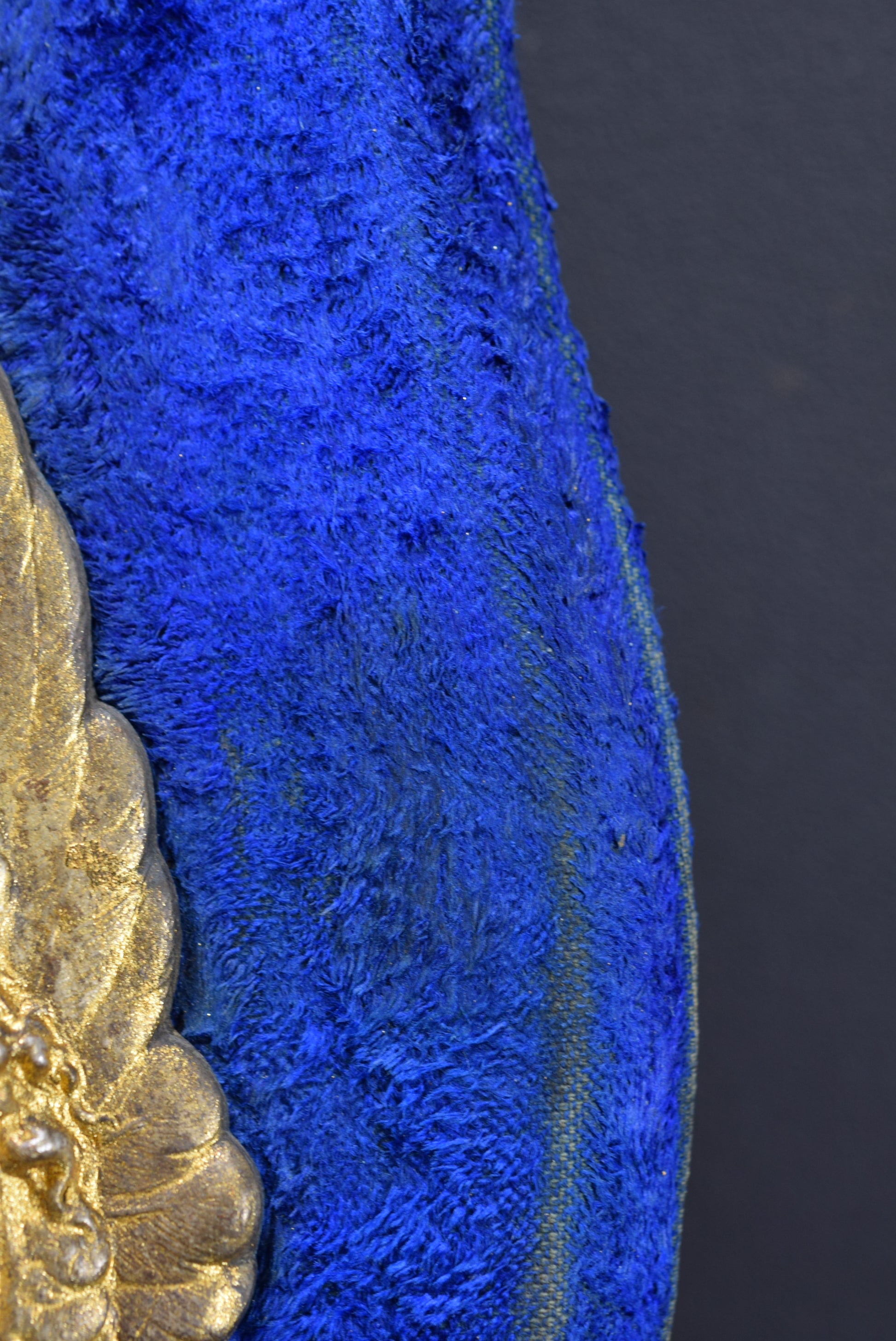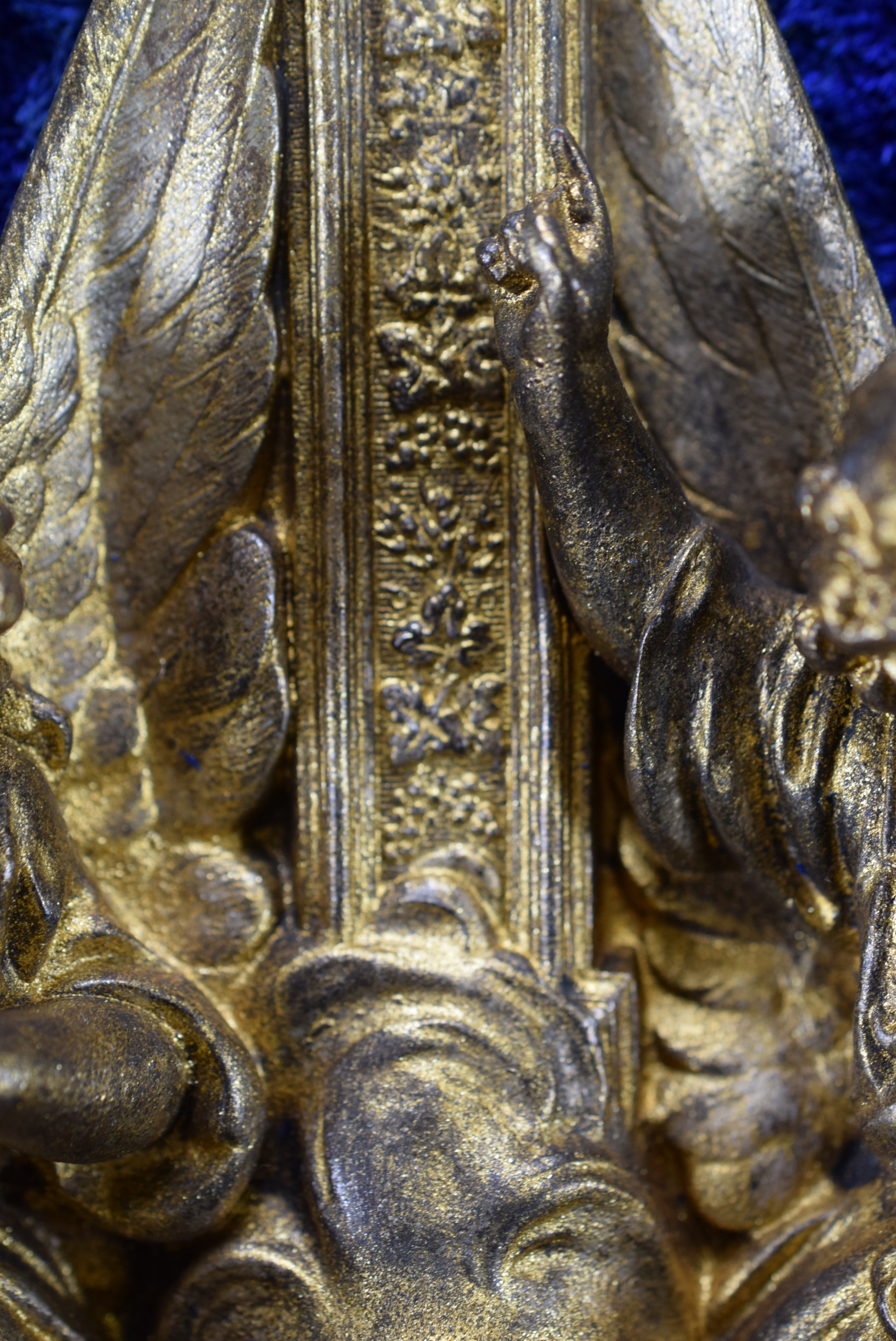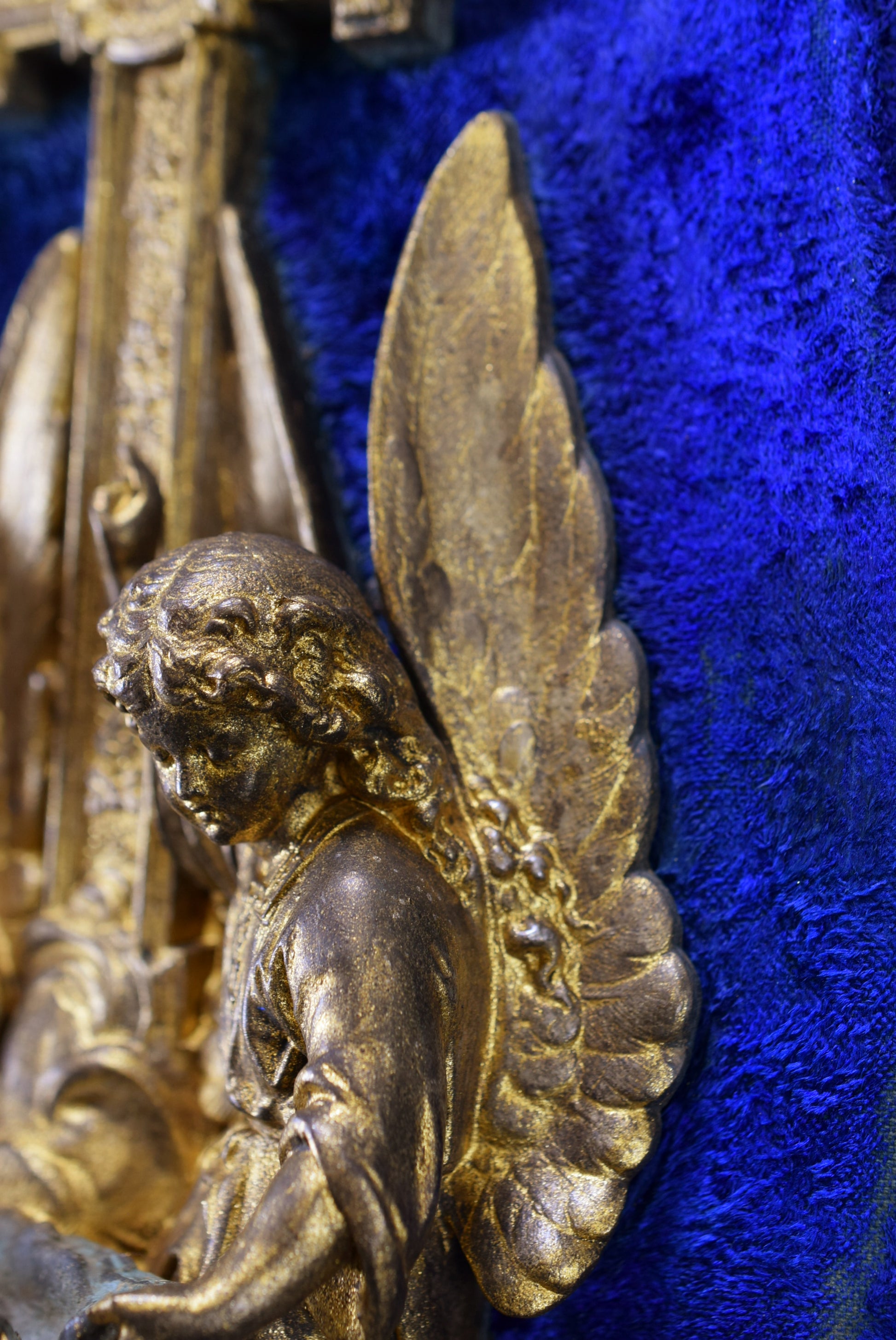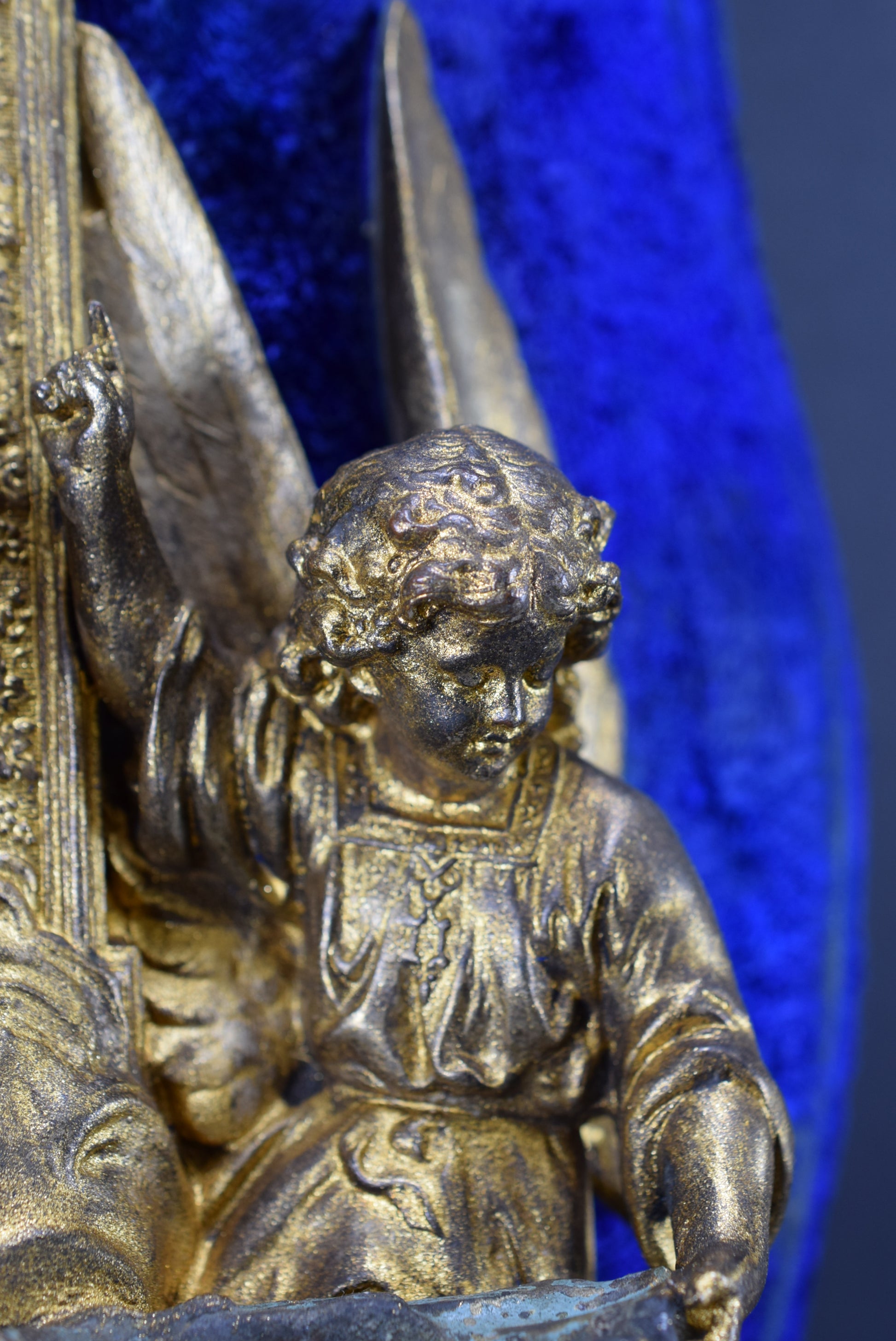 Un superbe bénitier mural antique français en régule et velours bleu. La pièce religieuse met en scène finement deux anges tenant une coquille. Ce beau bénitier date de la fin du 19ème siècle. Il présente une patine dorée qui a été restaurée.