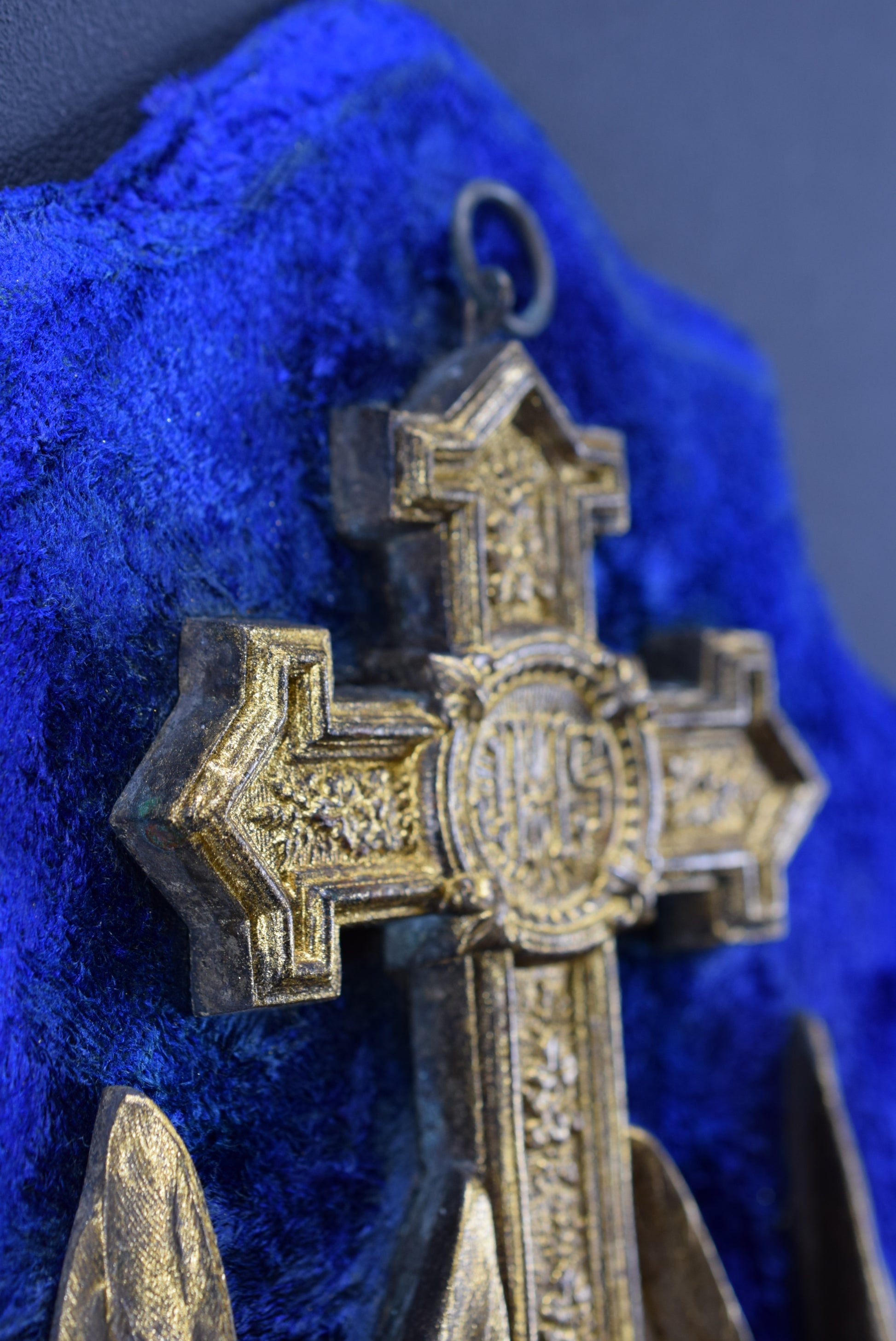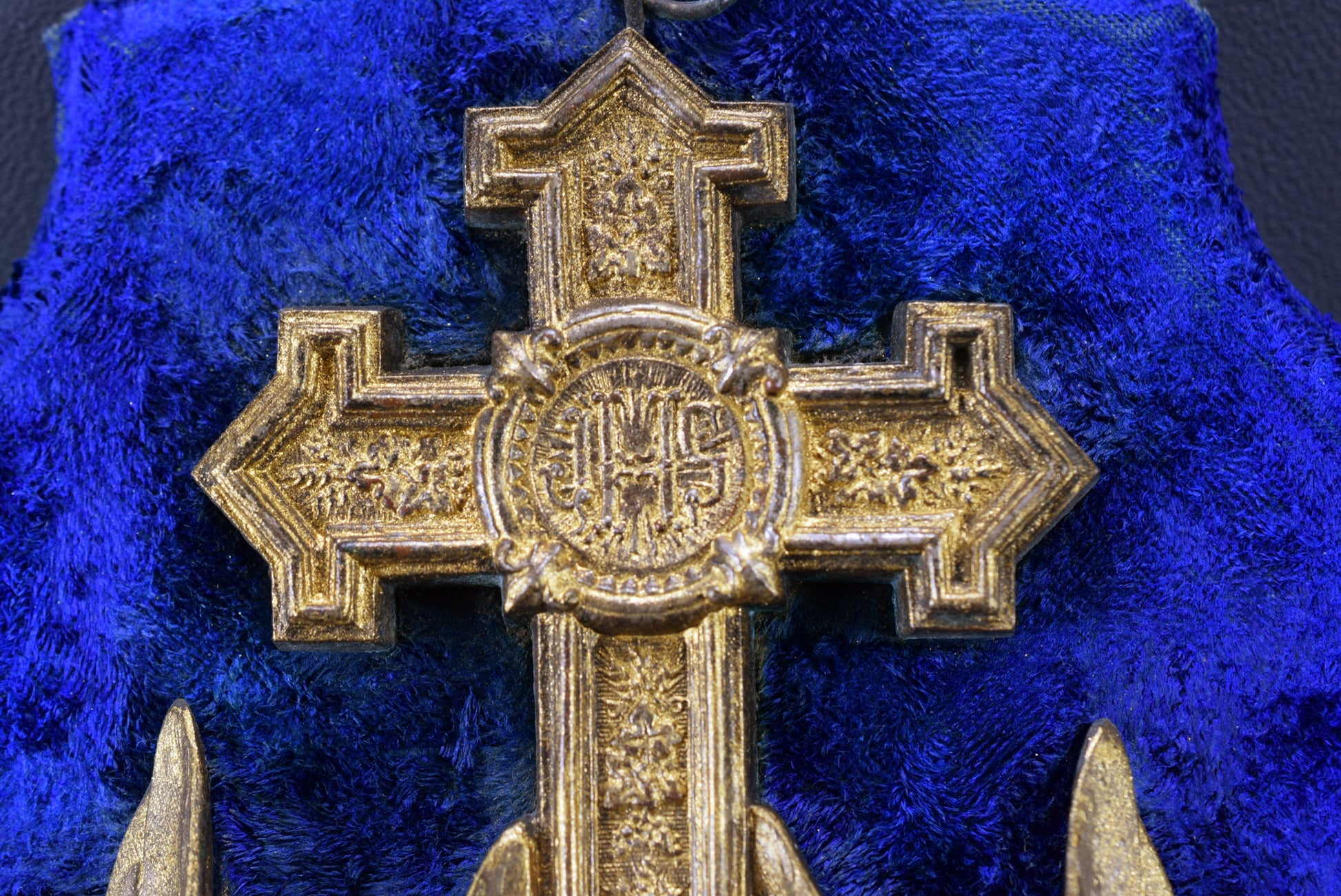 Bon état antique avec quelques signes normaux du temps : le velours bleu foncé est utilisé. Patine antique.