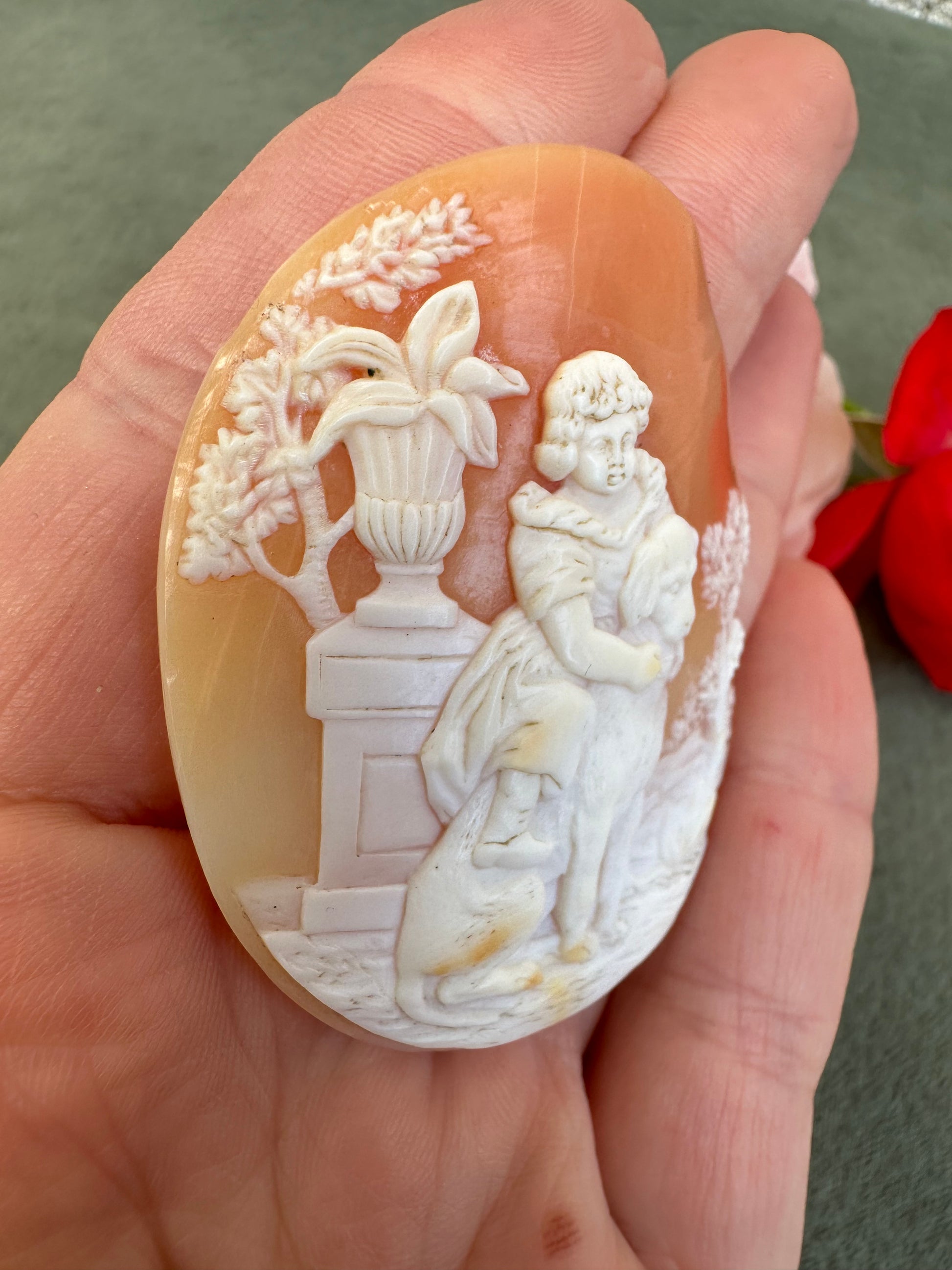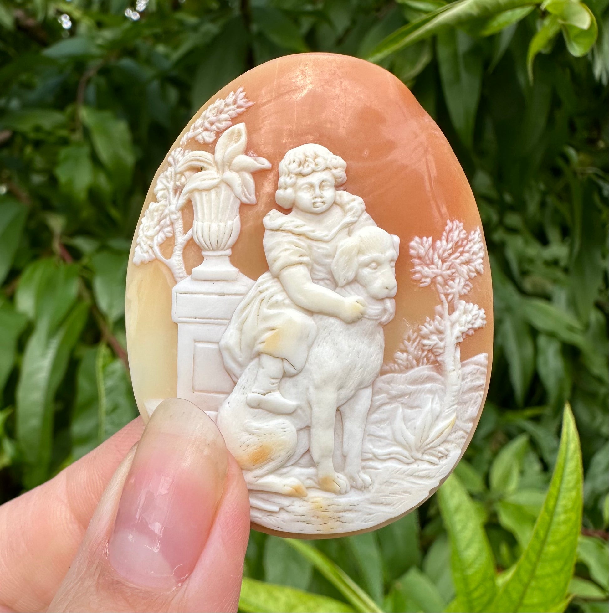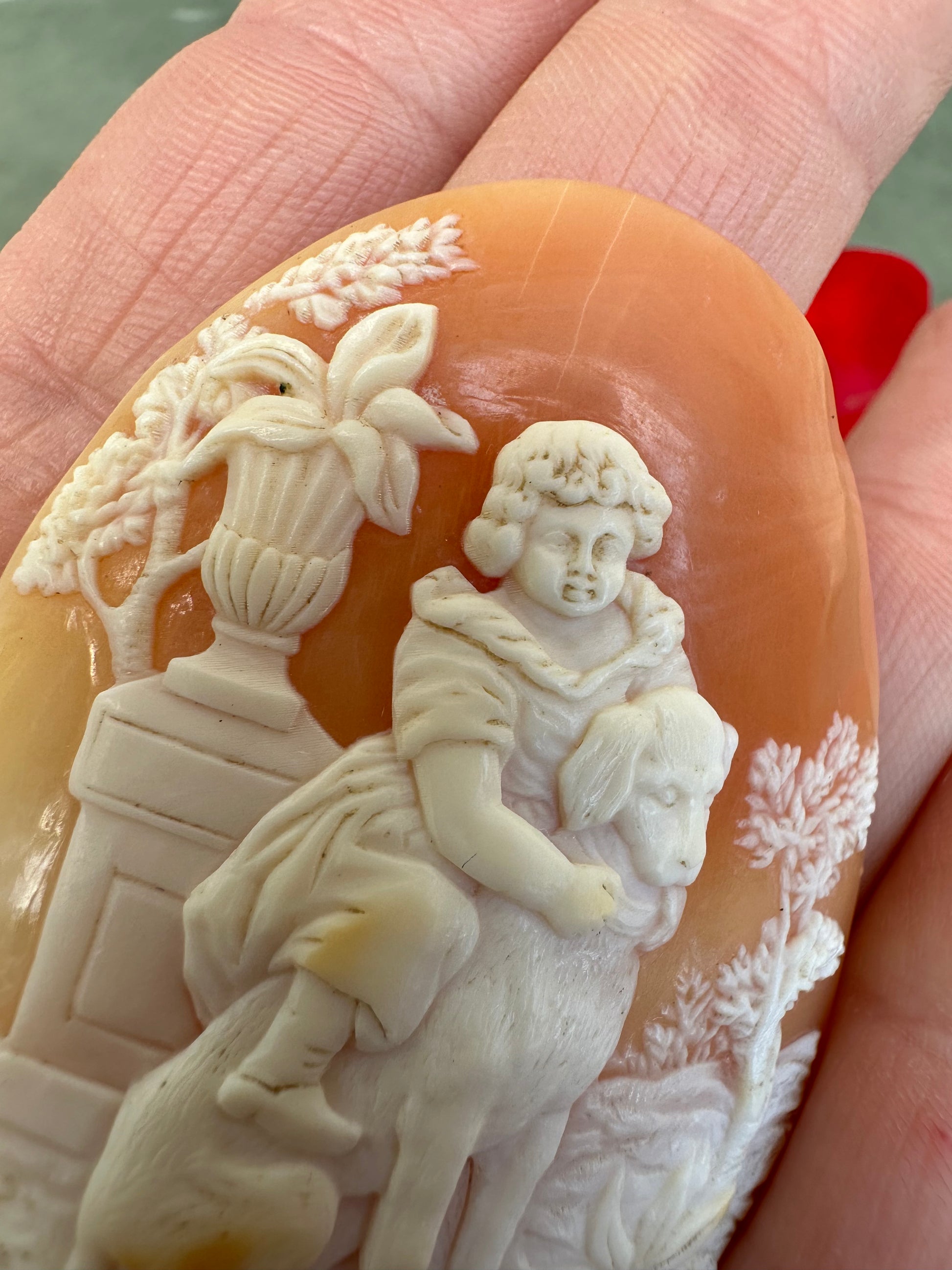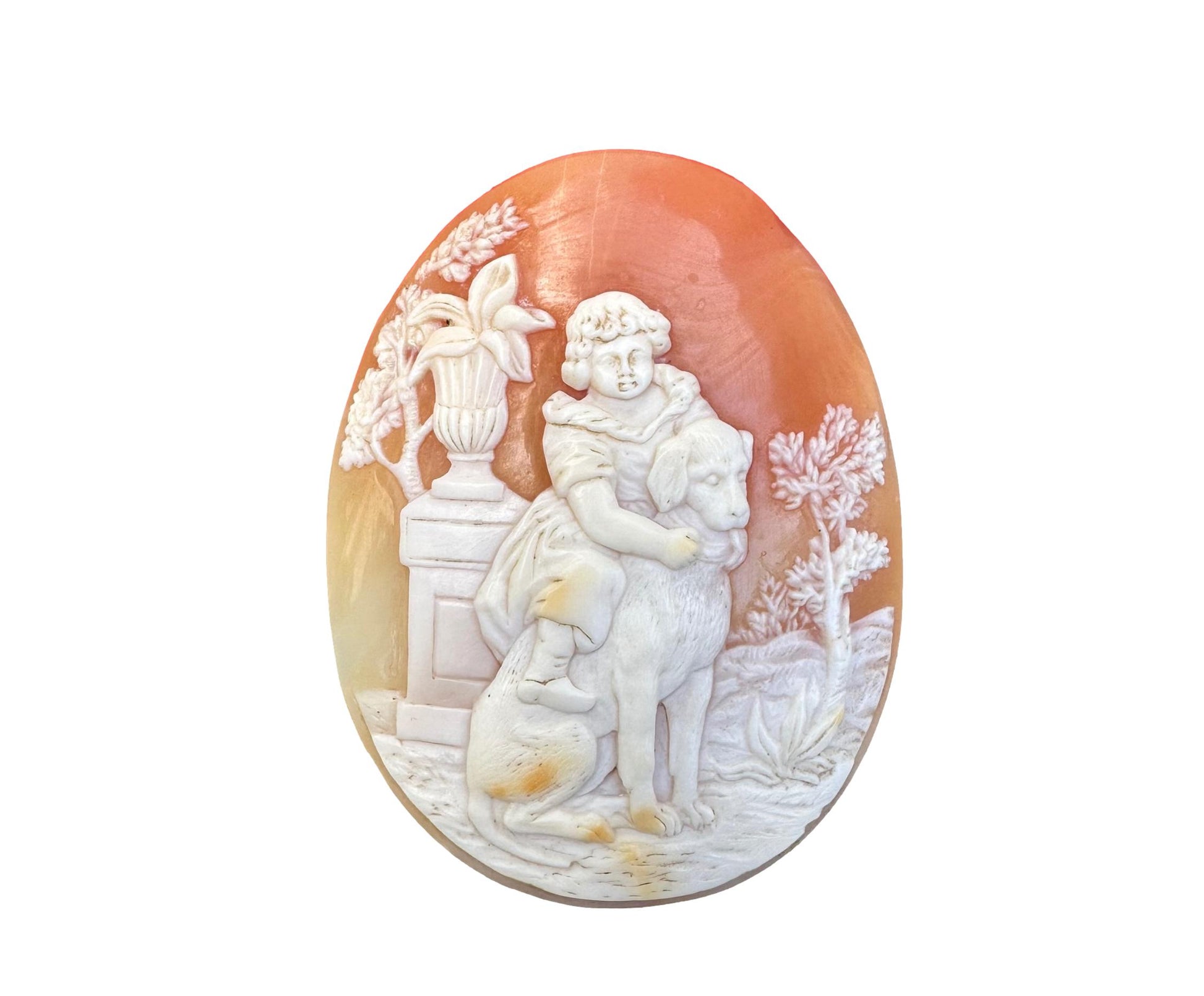 This rare Victorian unmounted shell cameo, dating to the late 19th century, is a beautifully intricate work of art. The cameo is meticulously carved from shell, featuring a heartwarming scene of a little girl riding on the back of a dog. The tender connection between the child and the dog is rendered with exceptional detail, capturing the girl's delicate features and the loyal, protective stance of the dog beneath her. In the background, a finely detailed Medici planter is adorned with lush plants, adding depth and context to the pastoral setting.