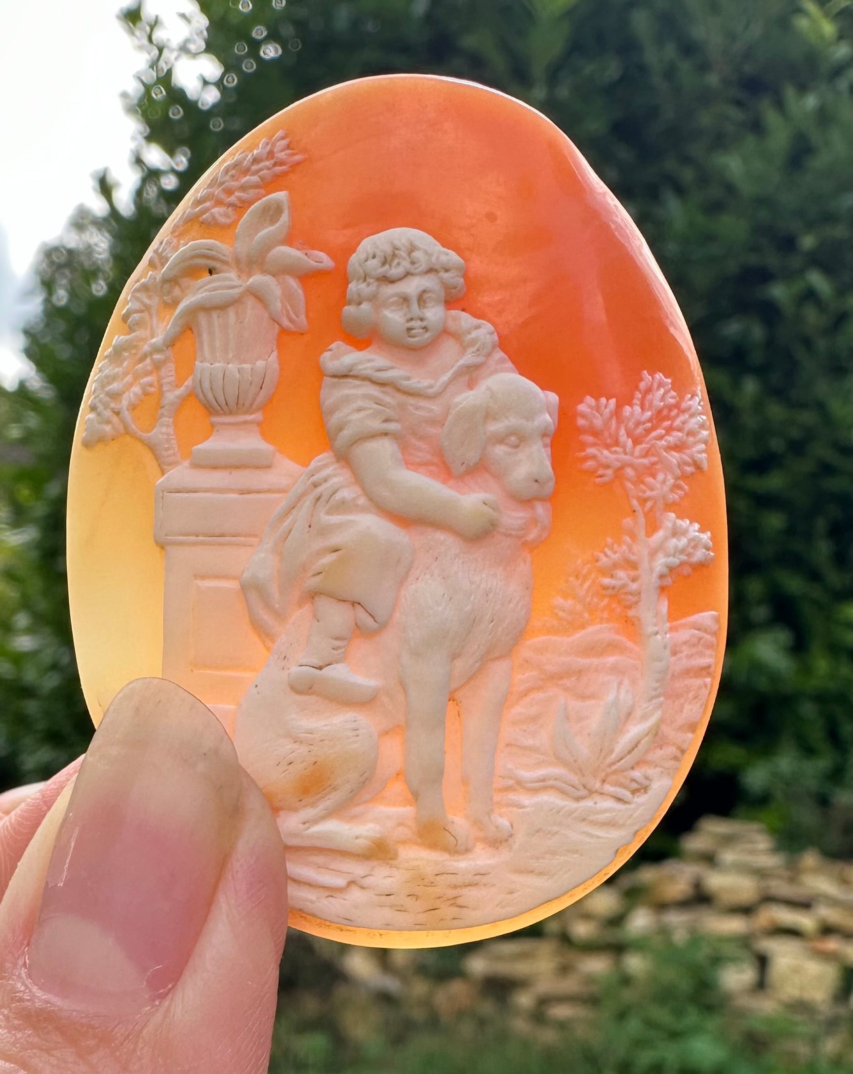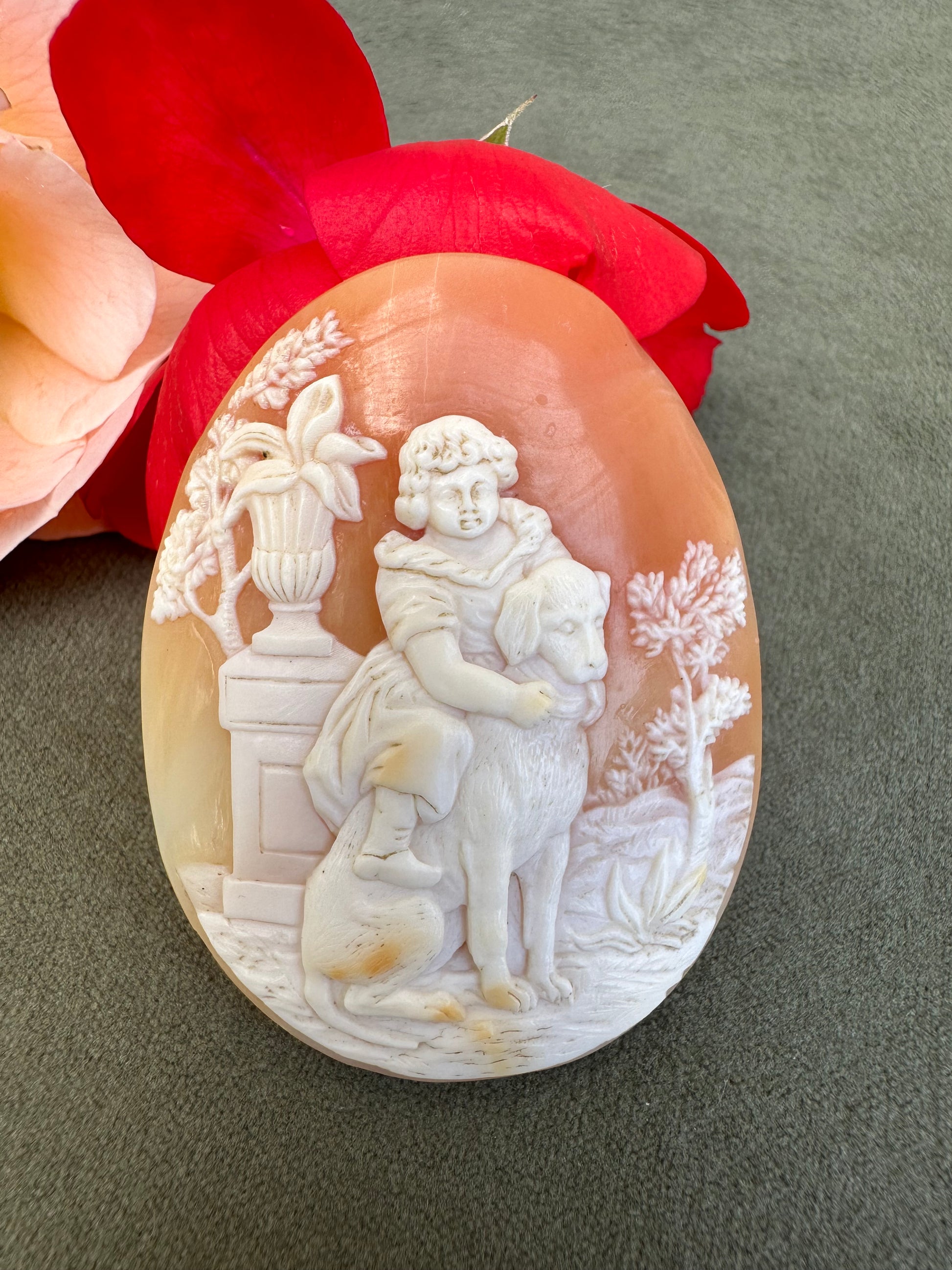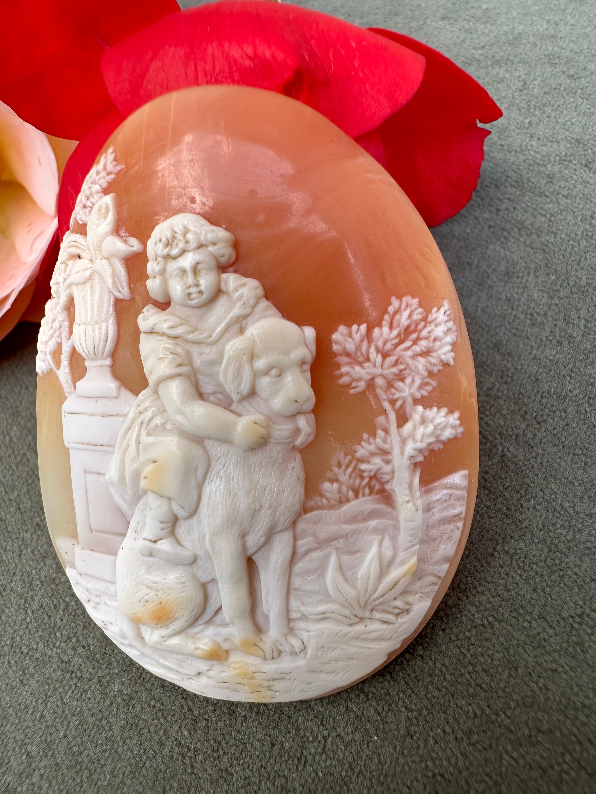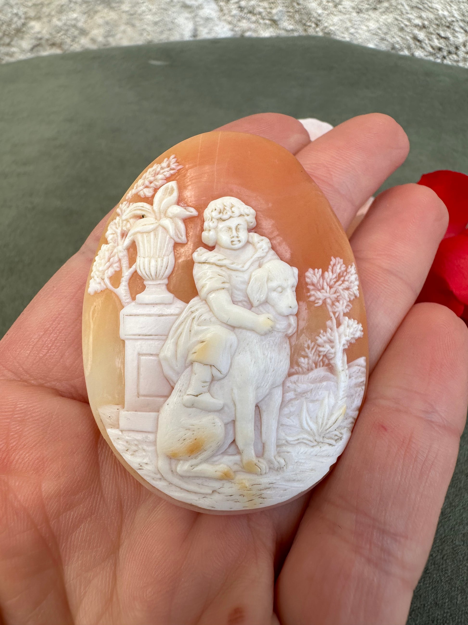This rare Victorian unmounted shell cameo, dating to the late 19th century, is a beautifully intricate work of art. The cameo is meticulously carved from shell, featuring a heartwarming scene of a little girl riding on the back of a dog. The tender connection between the child and the dog is rendered with exceptional detail, capturing the girl's delicate features and the loyal, protective stance of the dog beneath her. In the background, a finely detailed Medici planter is adorned with lush plants, adding depth and context to the pastoral setting.