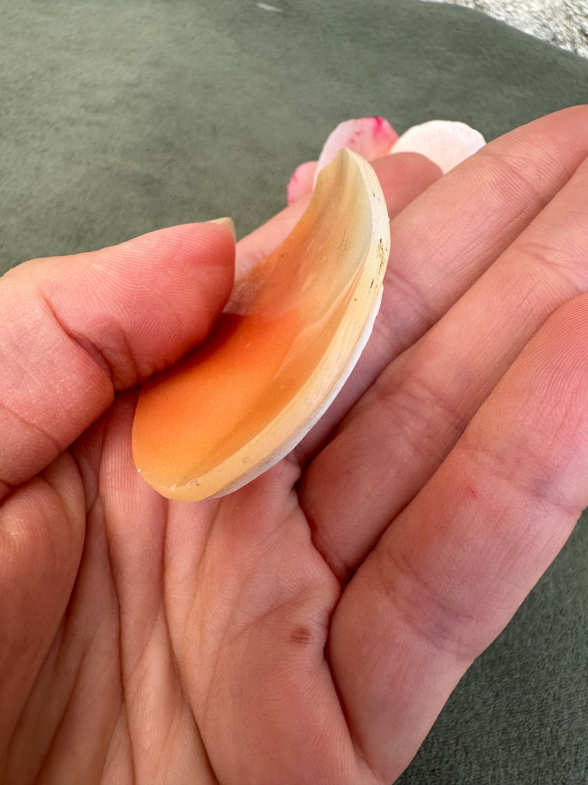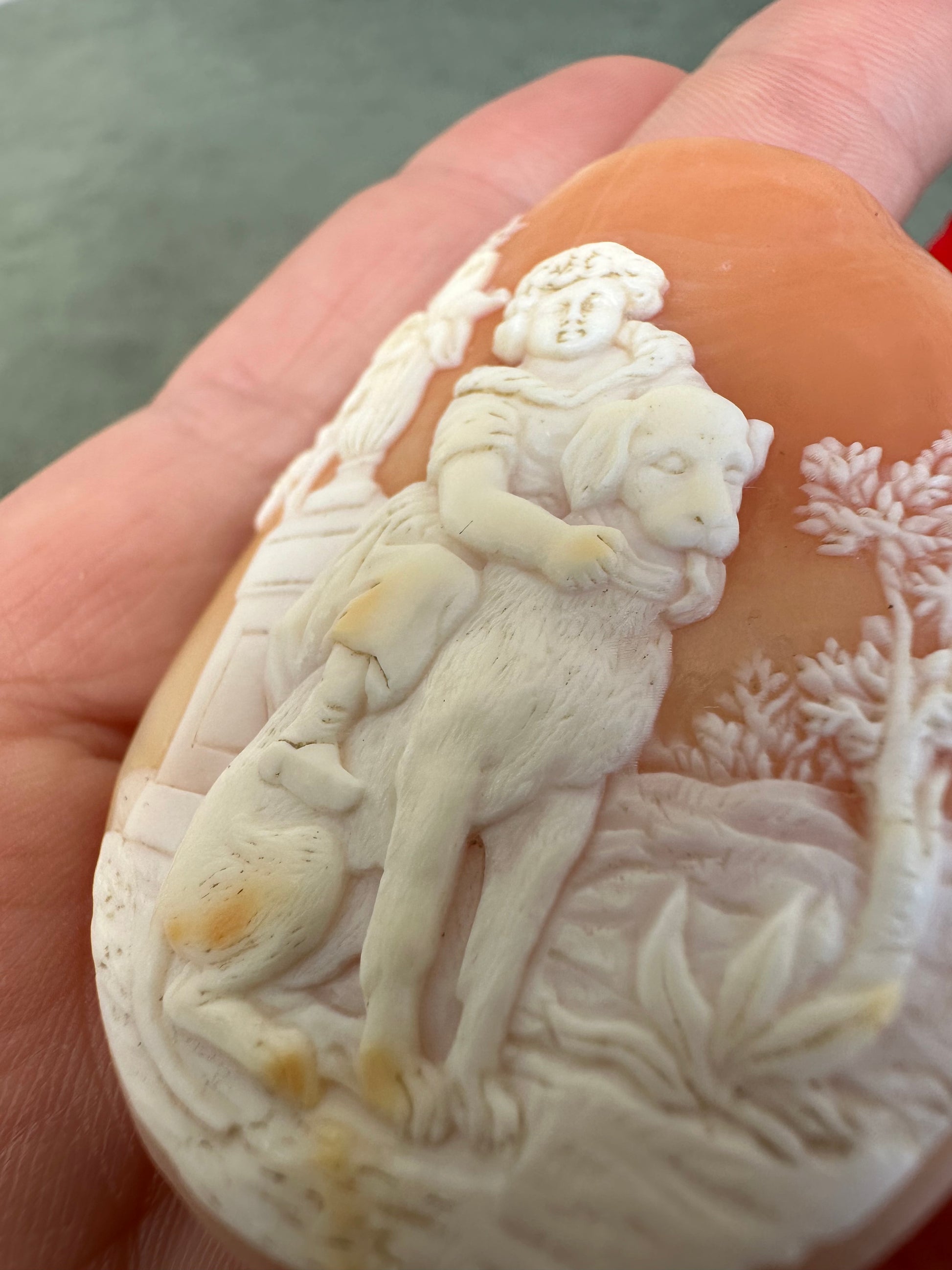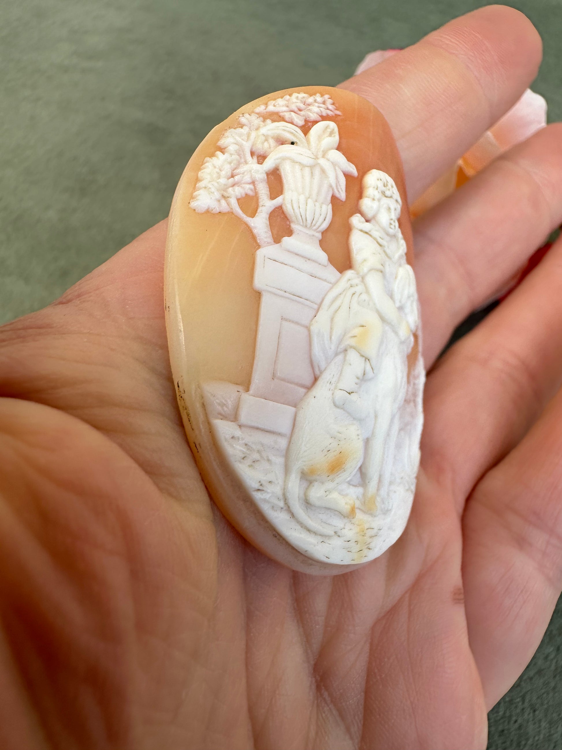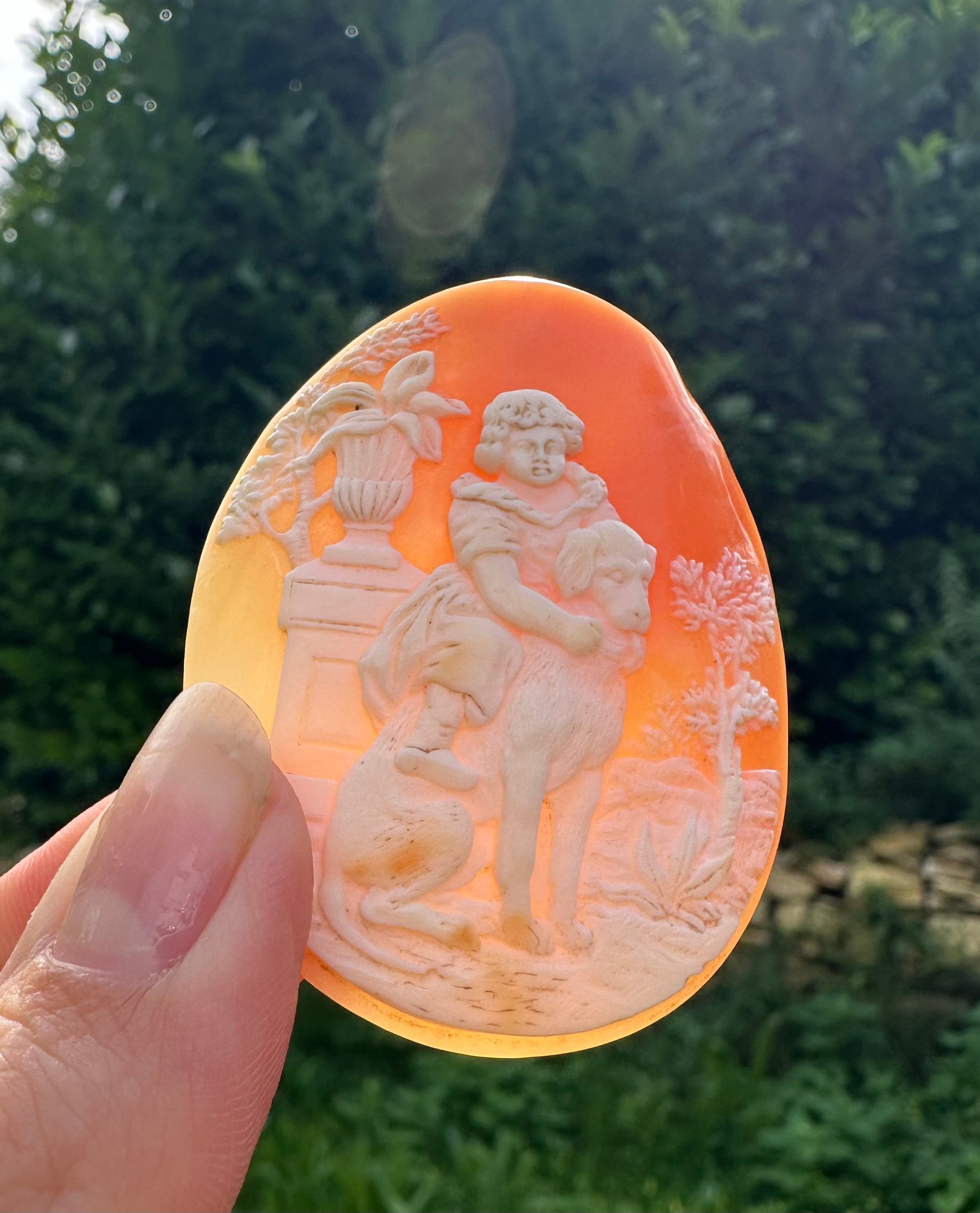 This rare Victorian unmounted shell cameo, dating to the late 19th century, is a beautifully intricate work of art. The cameo is meticulously carved from shell, featuring a heartwarming scene of a little girl riding on the back of a dog. The tender connection between the child and the dog is rendered with exceptional detail, capturing the girl's delicate features and the loyal, protective stance of the dog beneath her. In the background, a finely detailed Medici planter is adorned with lush plants, adding depth and context to the pastoral setting.