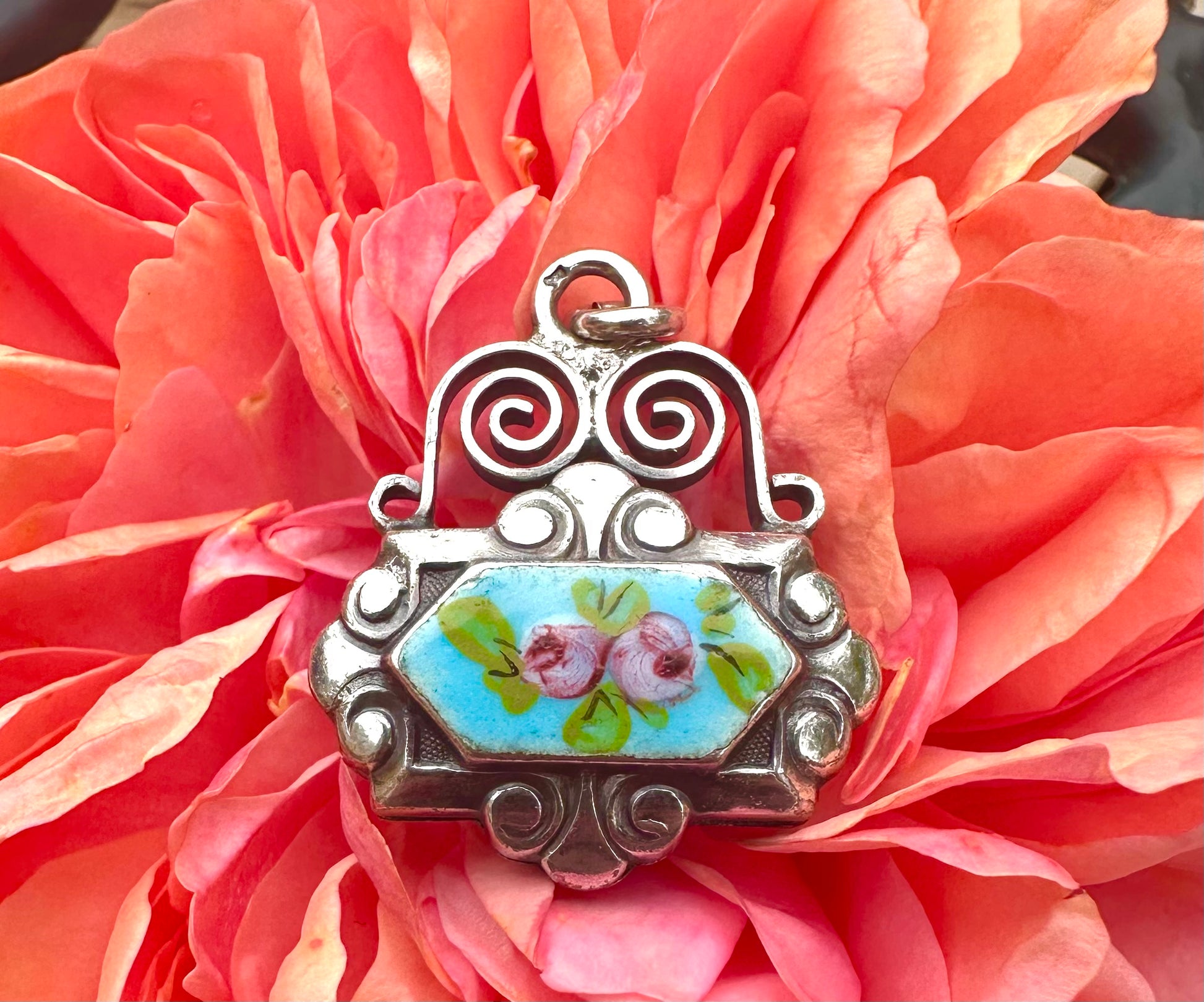 Cet exquis pendentif antique français en émail bleu argenté est un superbe bijou de l'ère victorienne qui capture magnifiquement l'élégance et le savoir-faire de l'époque. Le pendentif présente un délicat décor floral avec des roses roses, méticuleusement entourées d'une couleur bleue vibrante, créant un contraste saisissant avec l'argent brillant.