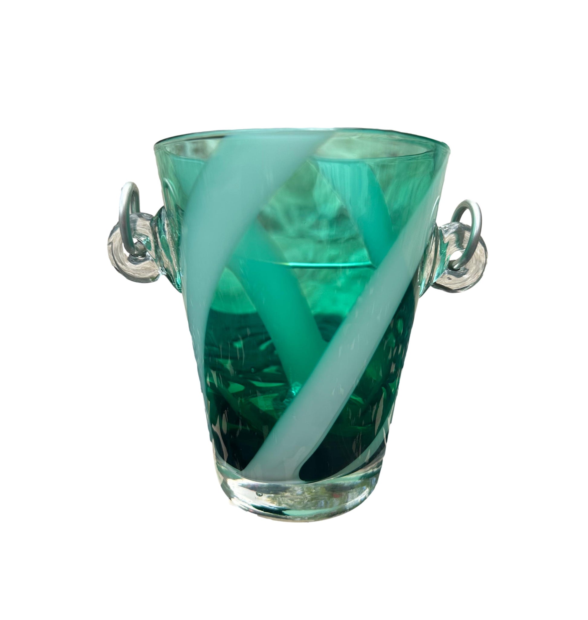 Un magnifique seau à glace vintage italien. Le seau en verre d'art de Murano présente des tourbillons blancs sur fond vert. Ce seau à glaçons date des années 1970. Il est parfait pour servir des glaçons avec élégance.