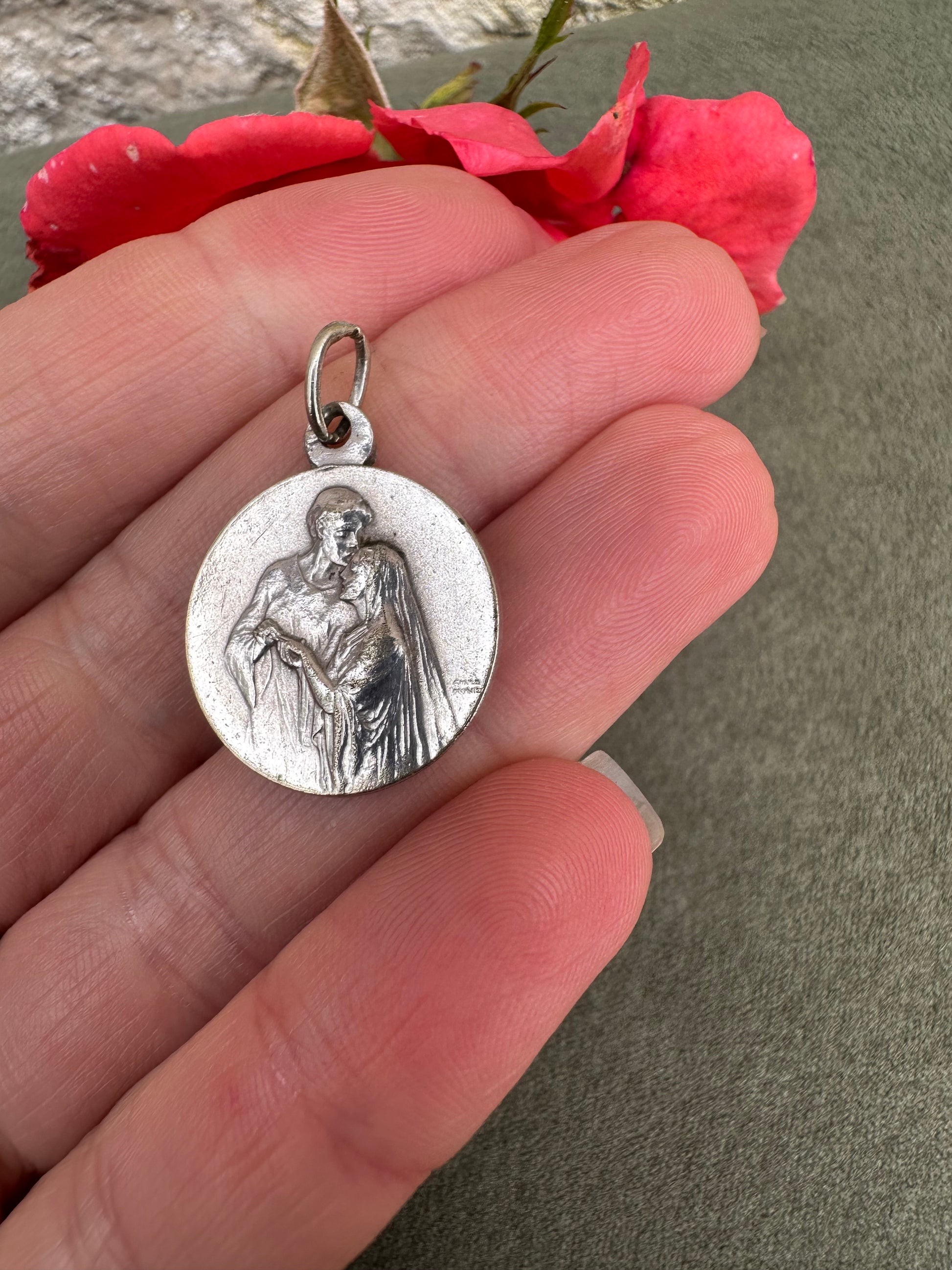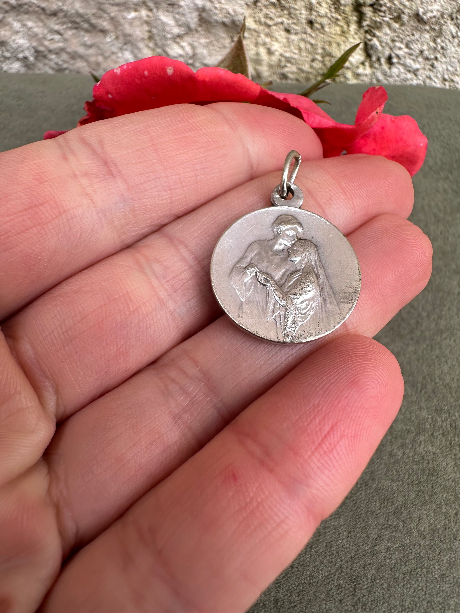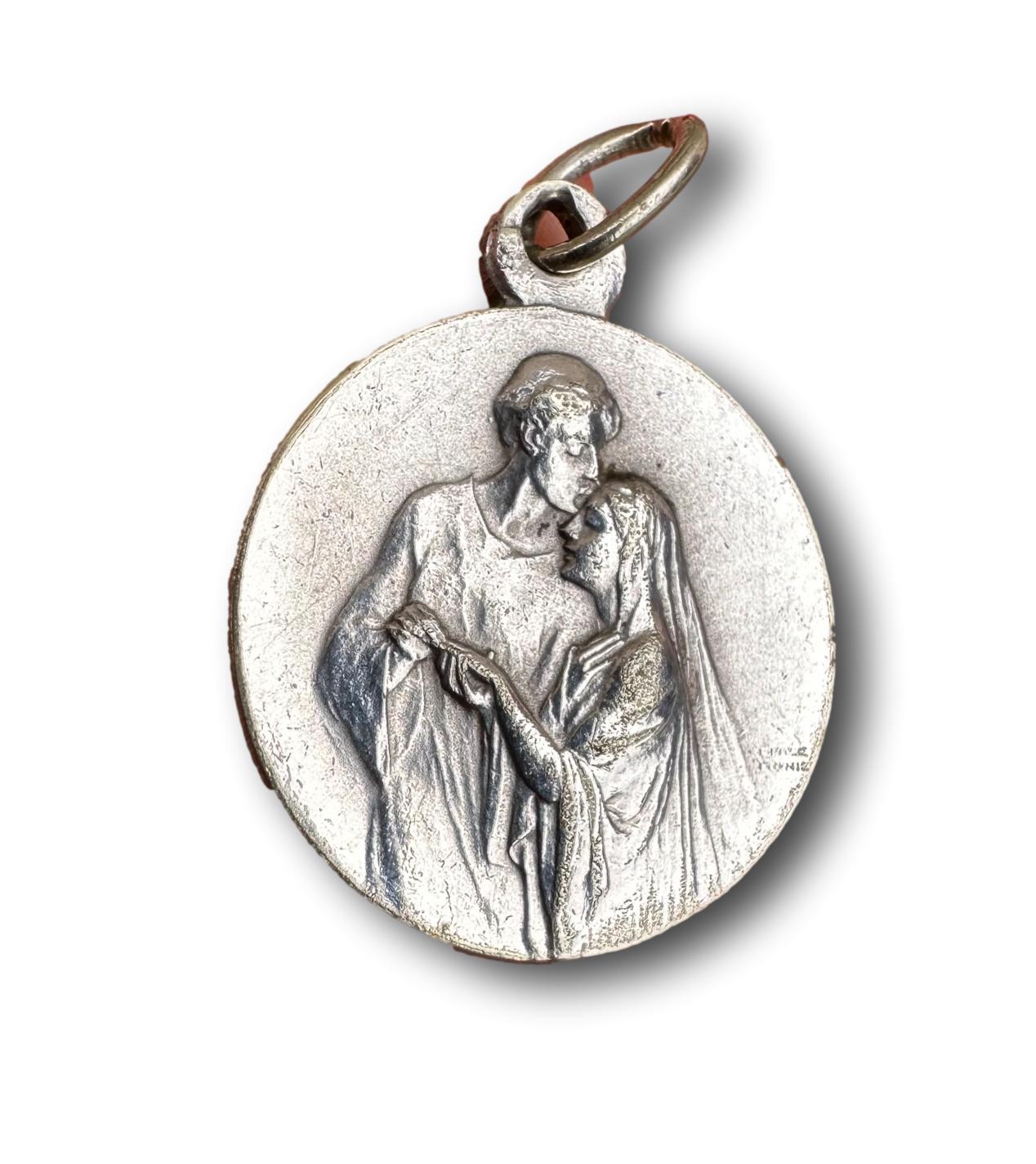 This superb vintage wedding pendant, crafted in silver-plated metal, is a romantic piece of jewelry from the 1930s, designed by the renowned French artist Emile Monier: (1883-1970), sculptor and engraver. The pendant features a tender scene of a groom gently placing a ring on his bride's finger and kissing her lovingly on the forehead, capturing a moment of pure devotion and romance. The finely detailed artistry brings depth and emotion to the figures, making it a truly sentimental piece. The back of the pendant is engraved with the initials “IF” and the date “February 10, 1934,” adding a personal, historical touch. This exquisite piece, with its intricate design and heartfelt symbolism, is both a wearable work of art and a timeless keepsake celebrating love.