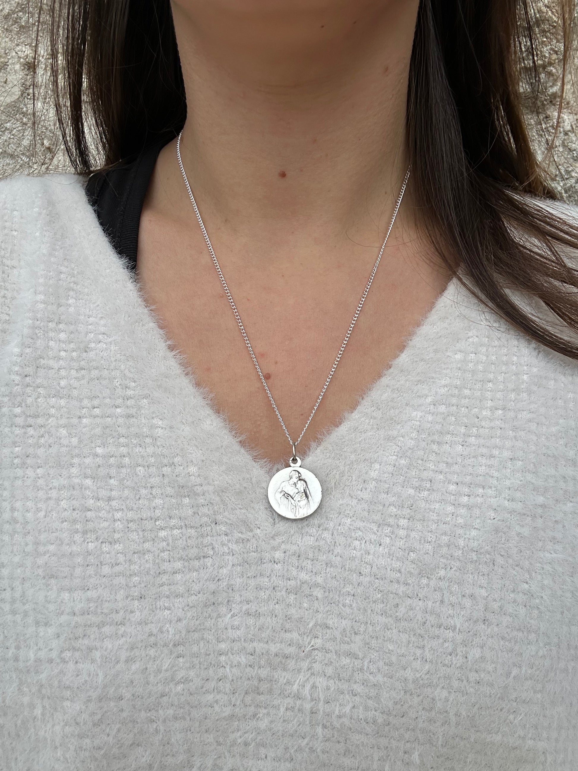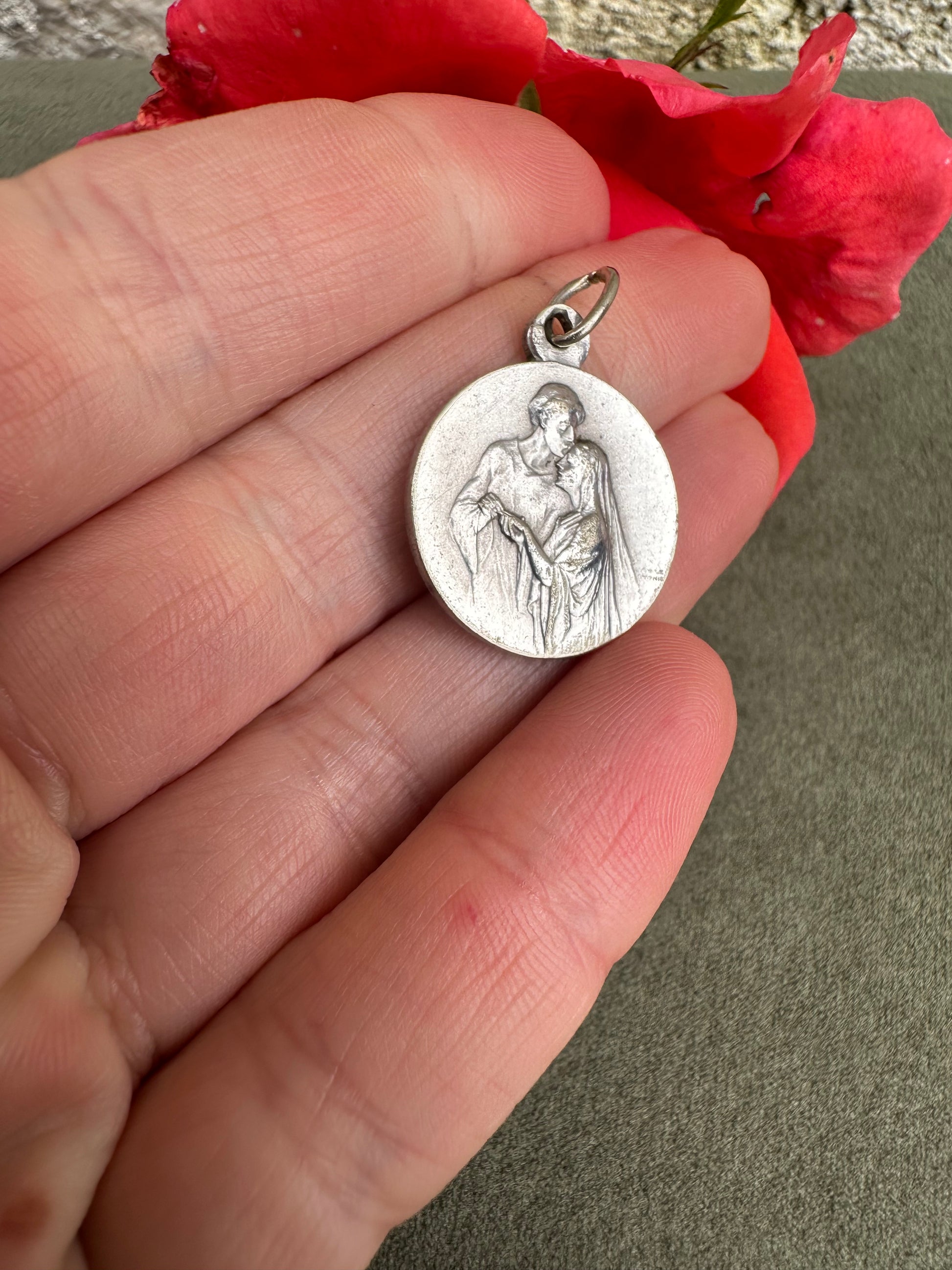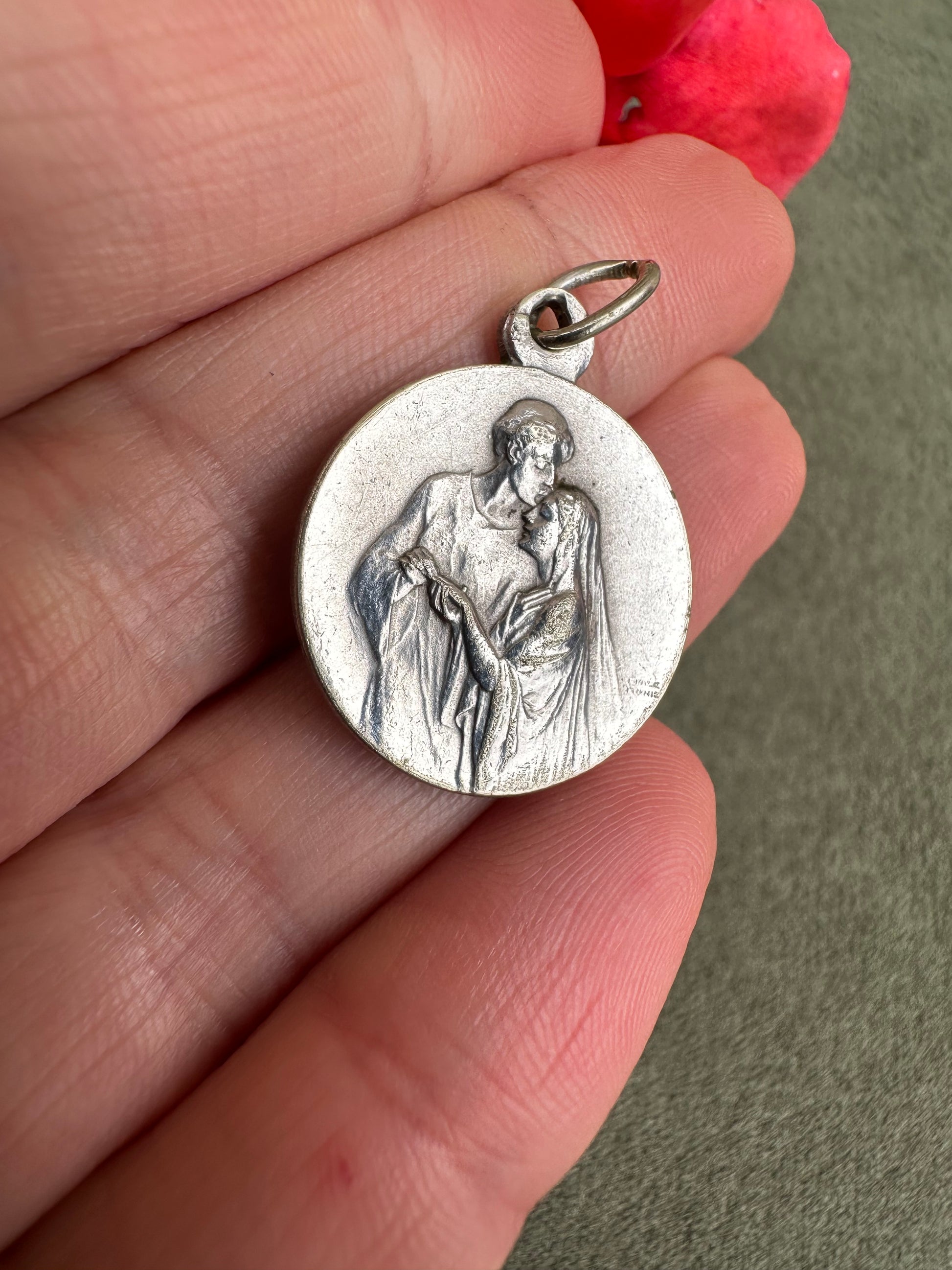 This superb vintage wedding pendant, crafted in silver-plated metal, is a romantic piece of jewelry from the 1930s, designed by the renowned French artist Emile Monier: (1883-1970), sculptor and engraver. The pendant features a tender scene of a groom gently placing a ring on his bride's finger and kissing her lovingly on the forehead, capturing a moment of pure devotion and romance. The finely detailed artistry brings depth and emotion to the figures, making it a truly sentimental piece. The back of the pendant is engraved with the initials “IF” and the date “February 10, 1934,” adding a personal, historical touch. This exquisite piece, with its intricate design and heartfelt symbolism, is both a wearable work of art and a timeless keepsake celebrating love.