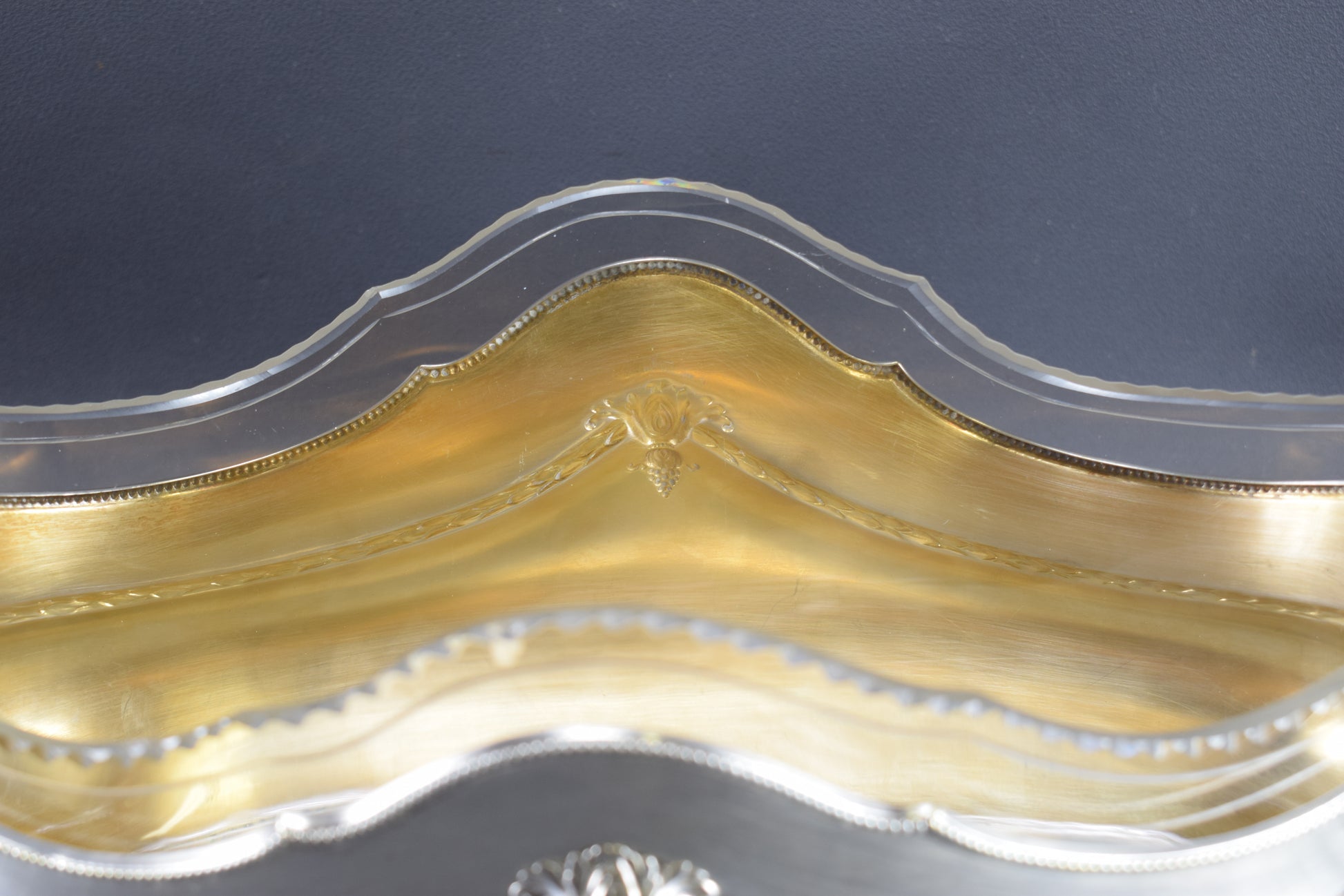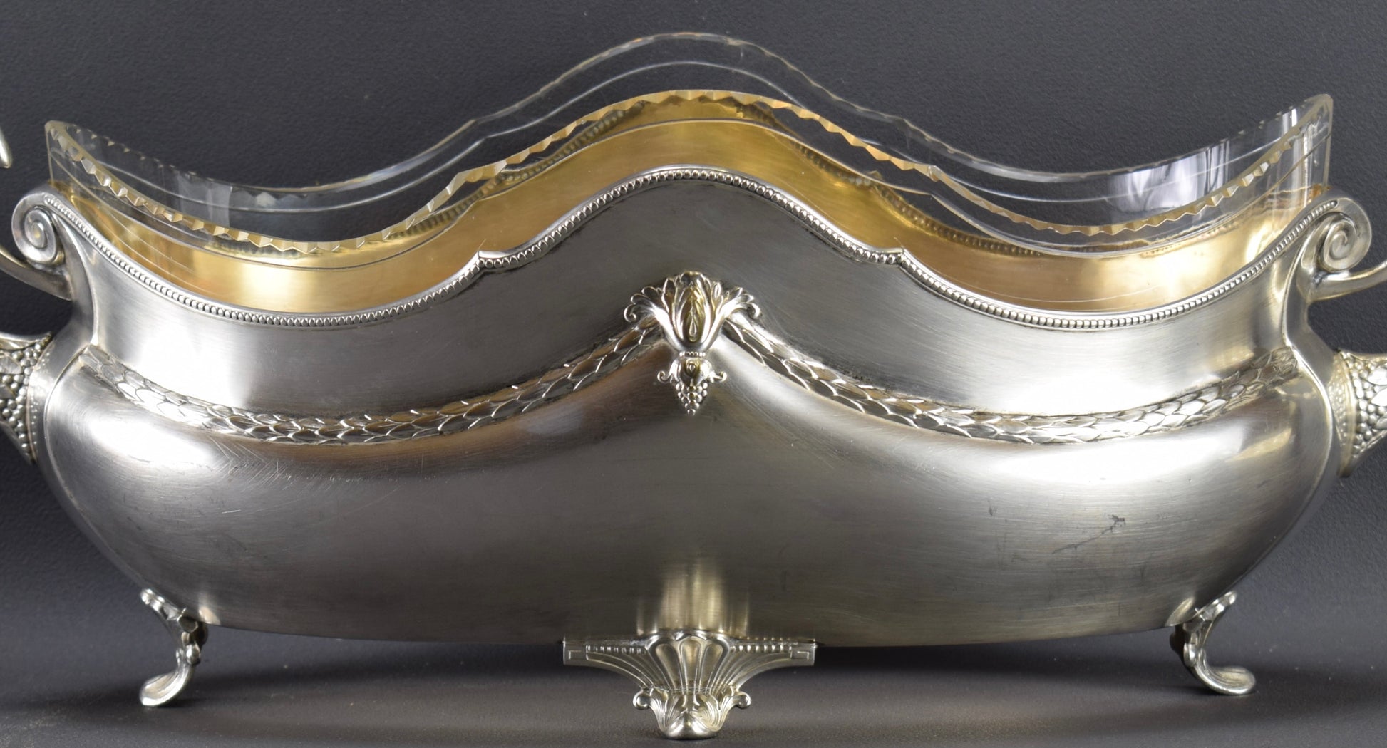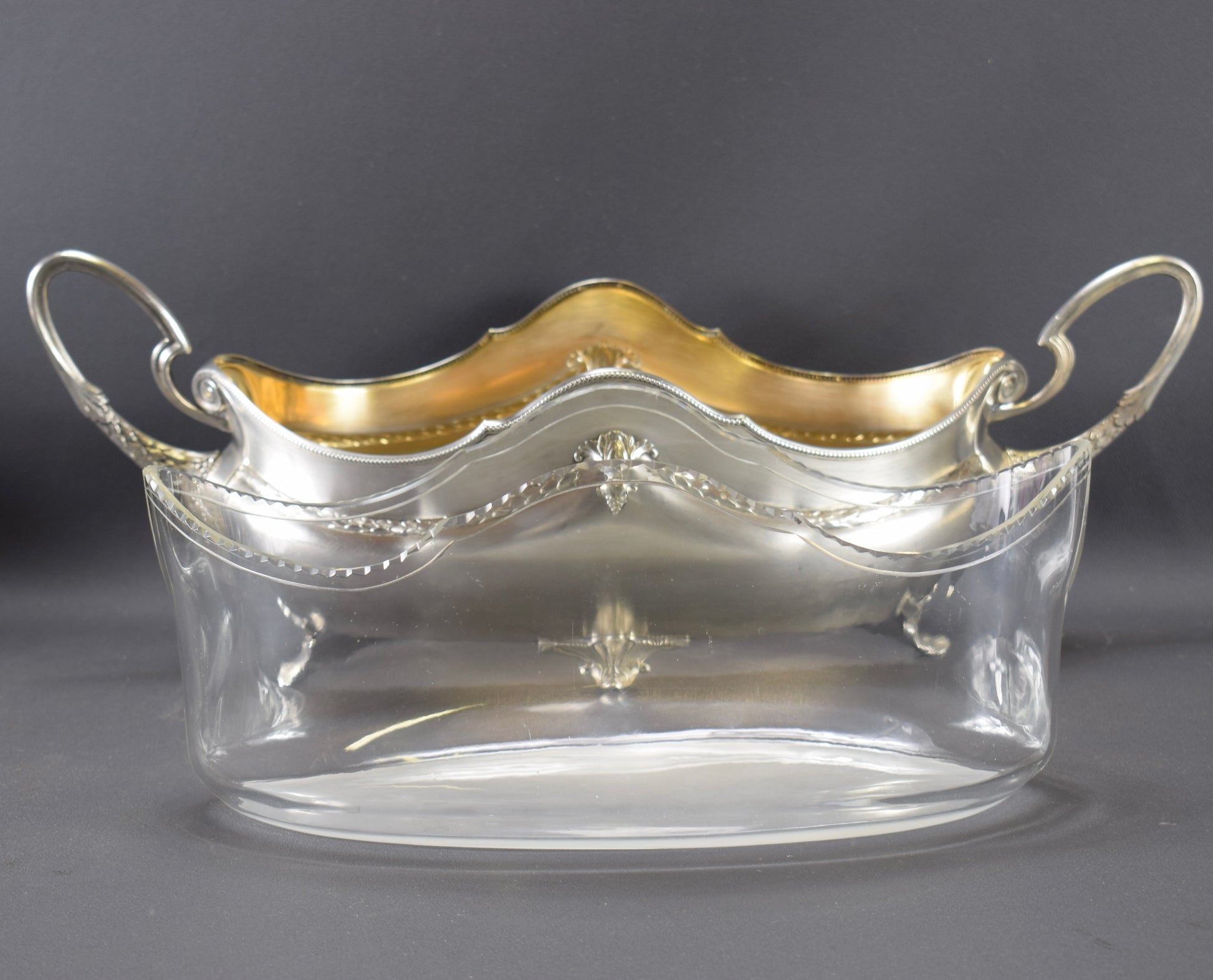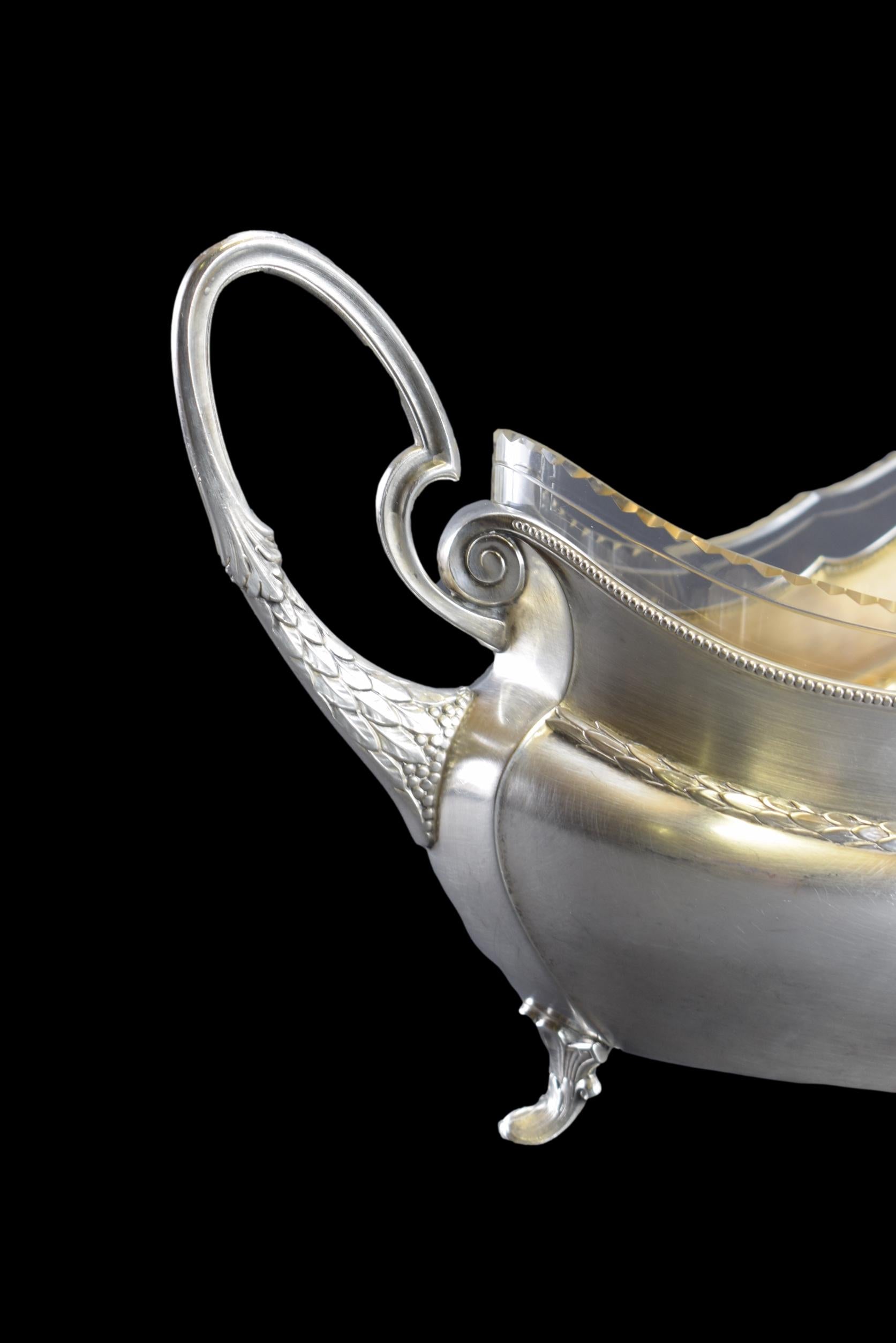 Une magnifique pièce maîtresse antique créée par WMF. La jardinière en métal argenté est finement décorée. Très élégants motifs de filet de perles et guirlande de feuilles de laurier. Le liner est en verre transparent et épais, finement facetté sur le dessus. L'intérieur de la jardinière est plaqué or. Cette pièce maîtresse raffinée ajouterait une touche de charme à votre maison. Pièce de haute qualité.