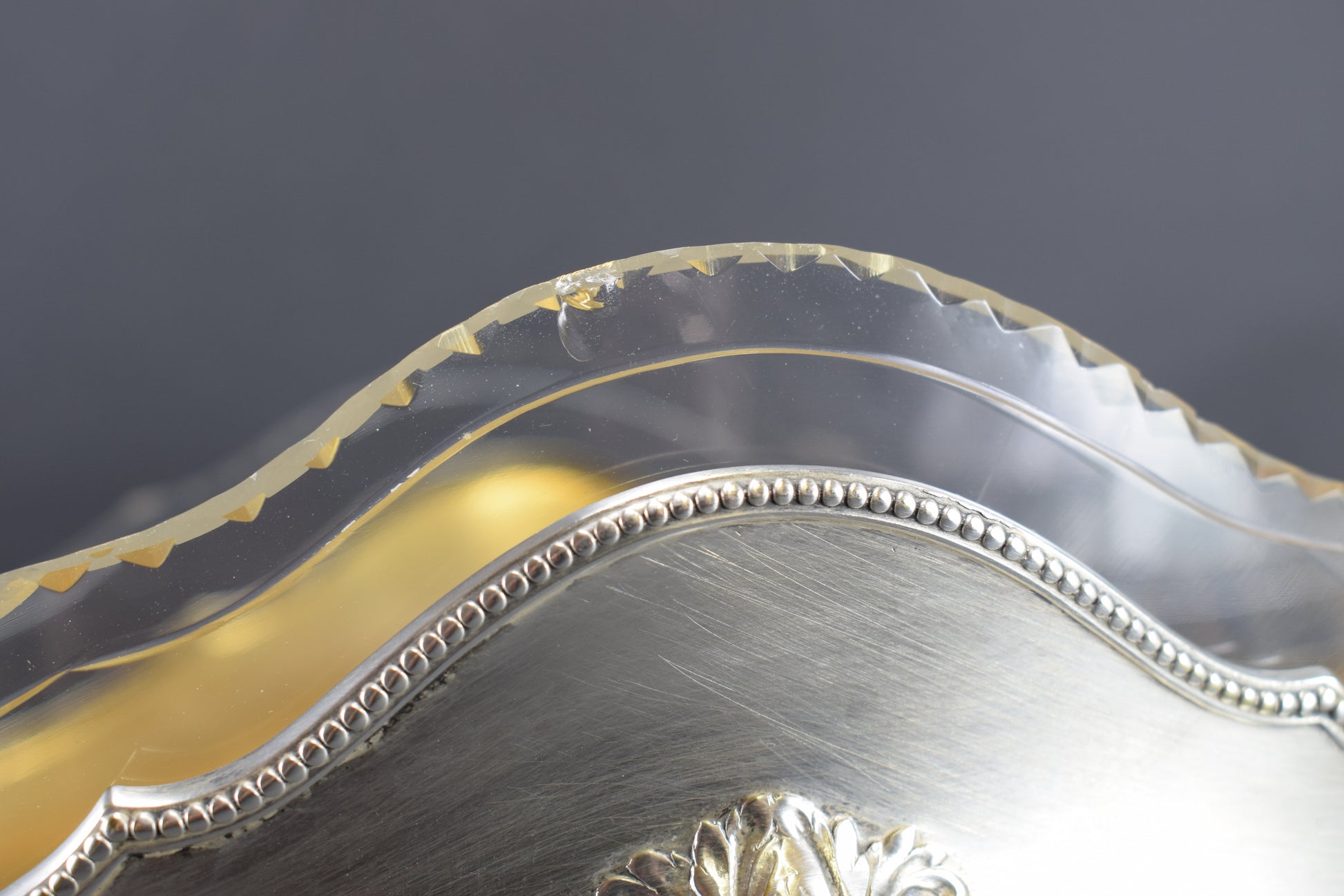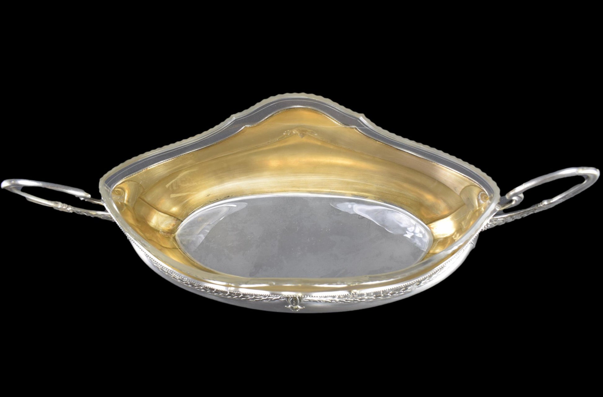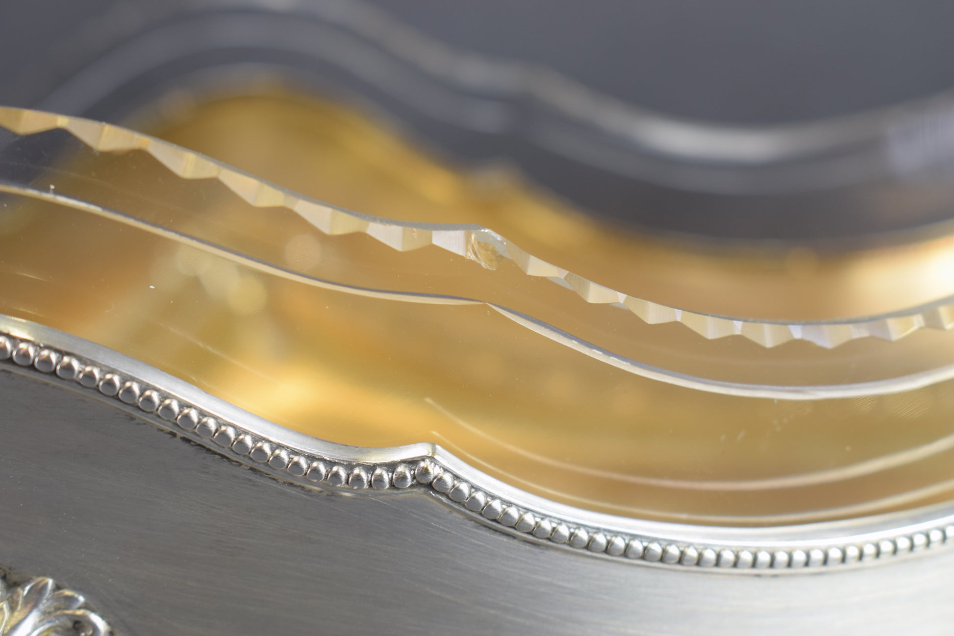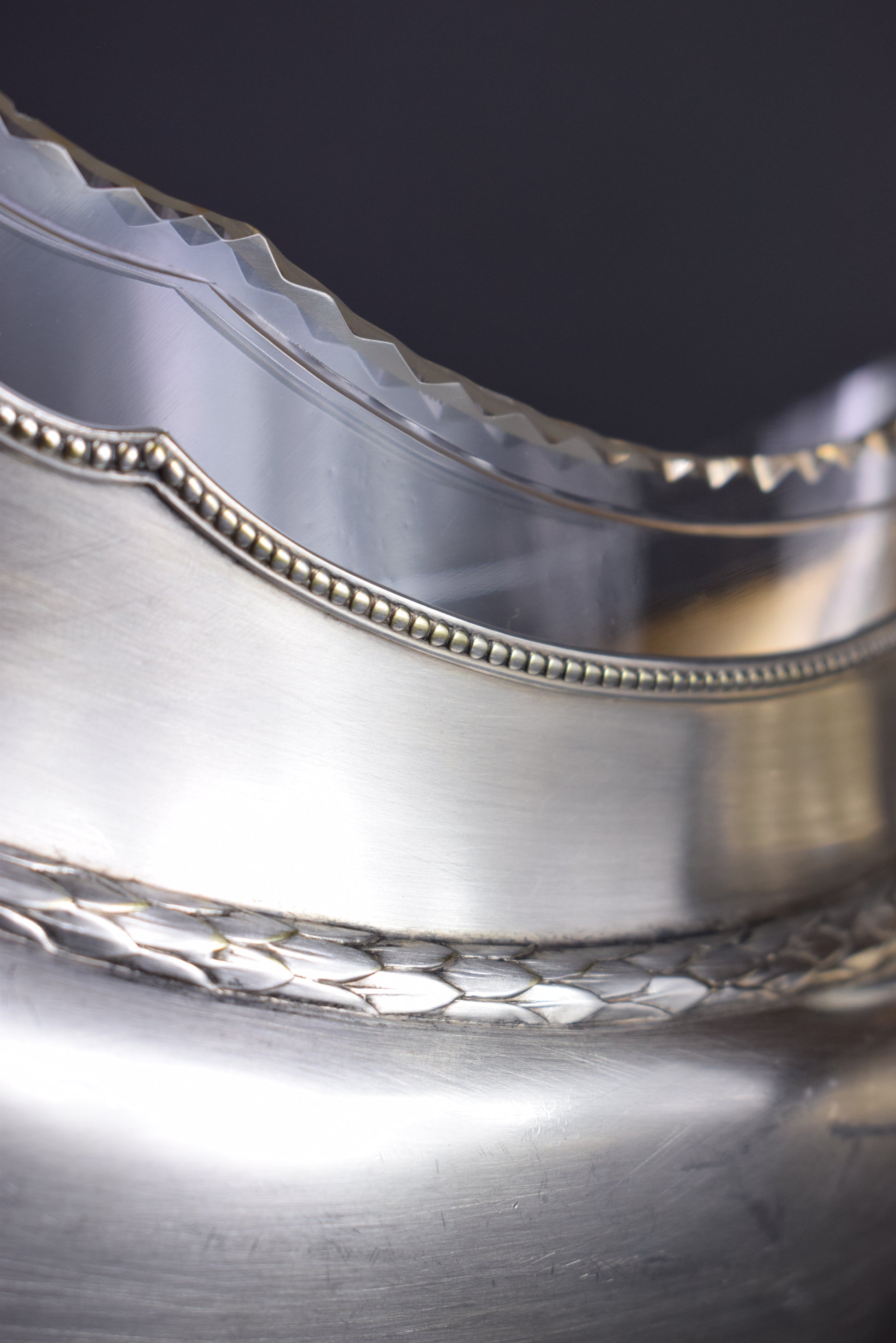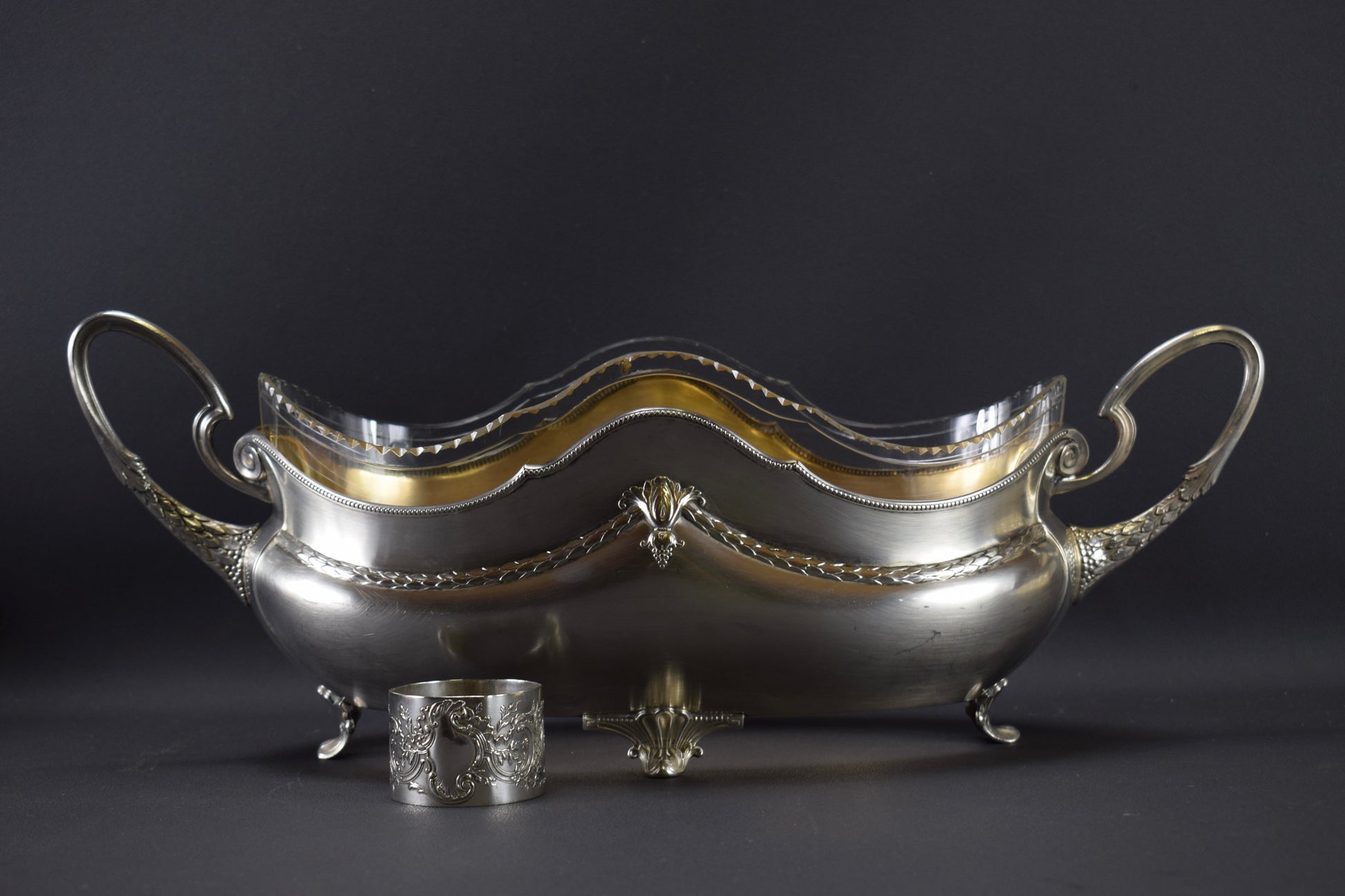 Une magnifique pièce maîtresse antique créée par WMF. La jardinière en métal argenté est finement décorée. Très élégants motifs de filet de perles et guirlande de feuilles de laurier. Le liner est en verre transparent et épais, finement facetté sur le dessus. L'intérieur de la jardinière est plaqué or. Cette pièce maîtresse raffinée ajouterait une touche de charme à votre maison. Pièce de haute qualité.