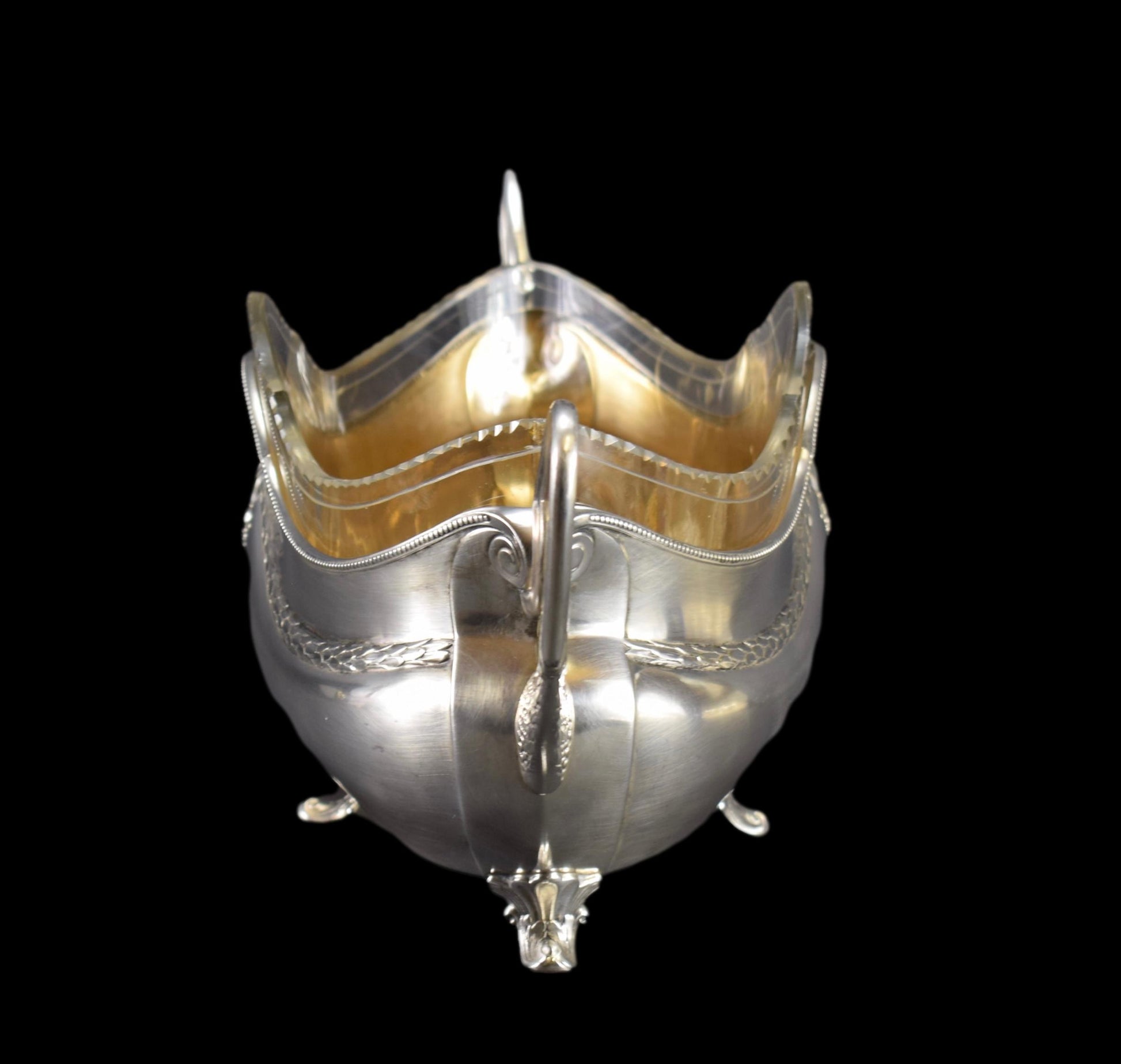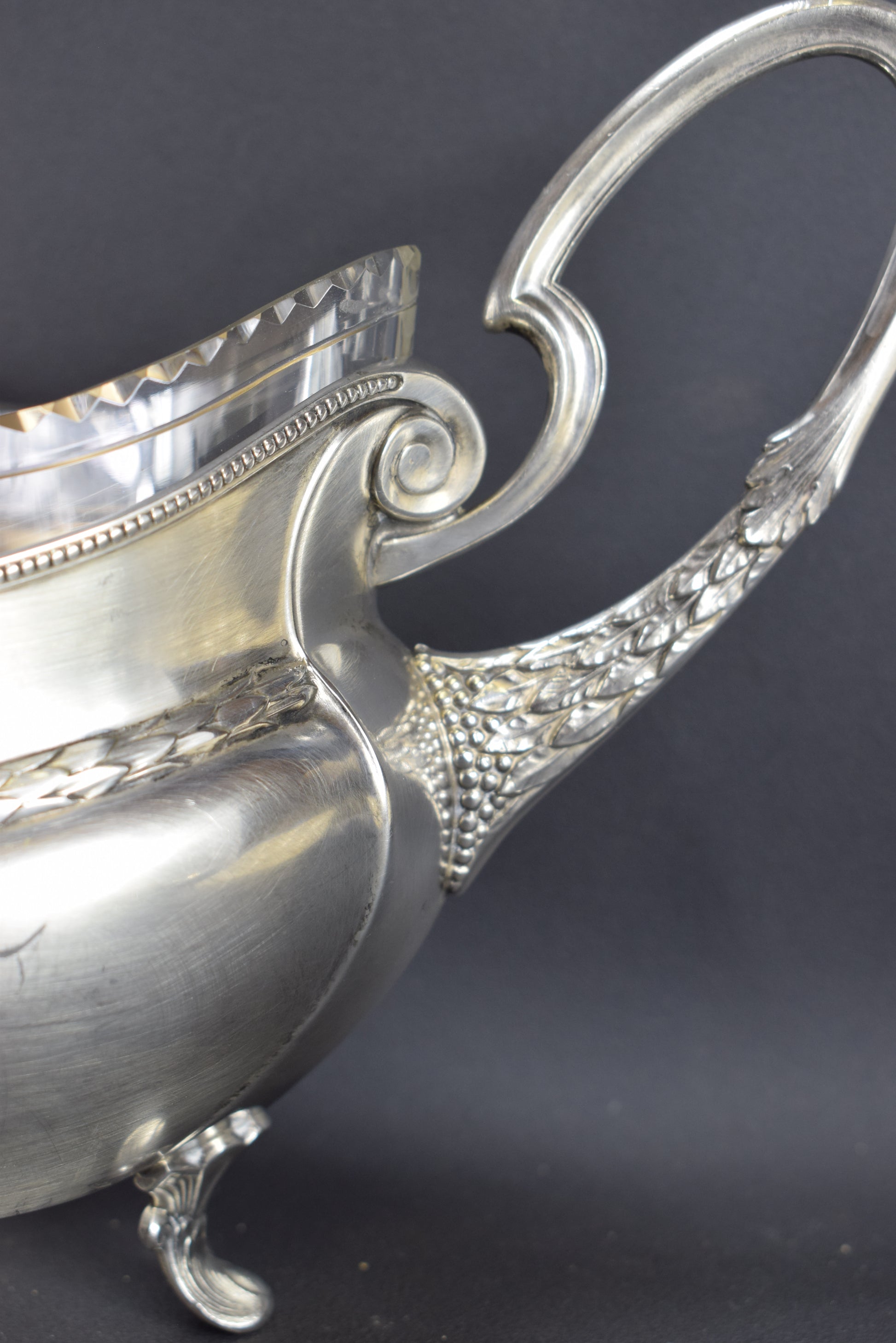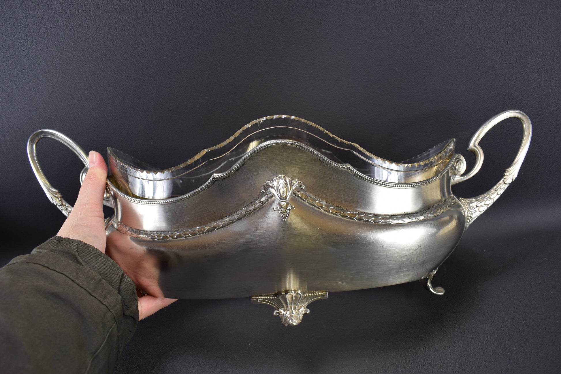 CONDITION : Bon état antique général avec des signes d’âge. Légères rayures sur la jardinière, trois éclats sur le liner en verre (pour plus de photos, me contacter), un pied présente une fissure (ça ne l'abîme pas).